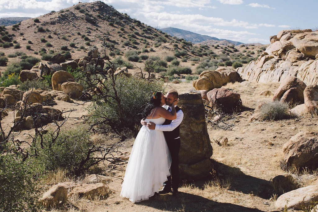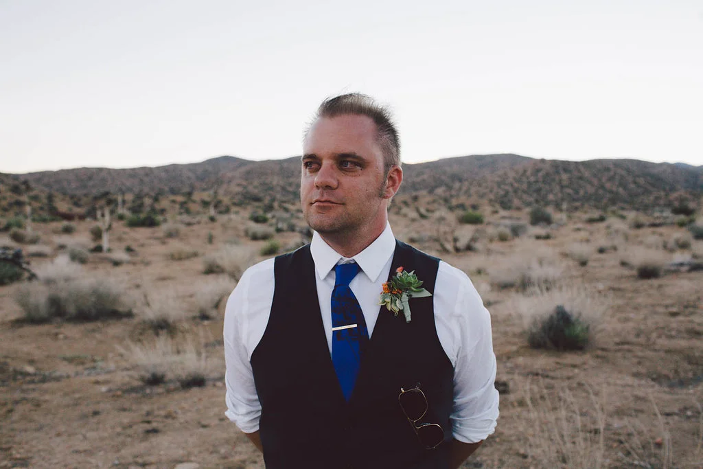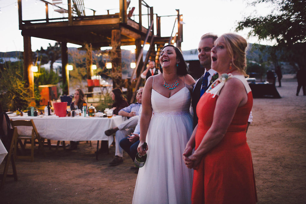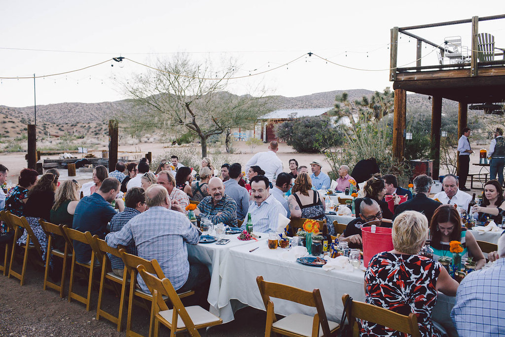 /Jenny and Chris follow their own rules. She works in theater and both of them are whiskey loving, desert obsessed, and all around fun-lovin' folk that aren't afraid to "get a little weird." They DIY'd their entire wedding and used an online calculator to figure out how much booze they need, which they ended up doubling out of fear of running out! Their wedding was a little bit Rock 'n' Roll mixed with desert fabulous. A bunch of guests stayed on site in the cabins (this is where the film crew for old westerns that were filmed at the fake town next door would stay) and partied the night away. Chris constructed the photo booth, they had BBQ ribs and pulled pork, whiskey and lemonade, and some kegs followed by an epic dance party.