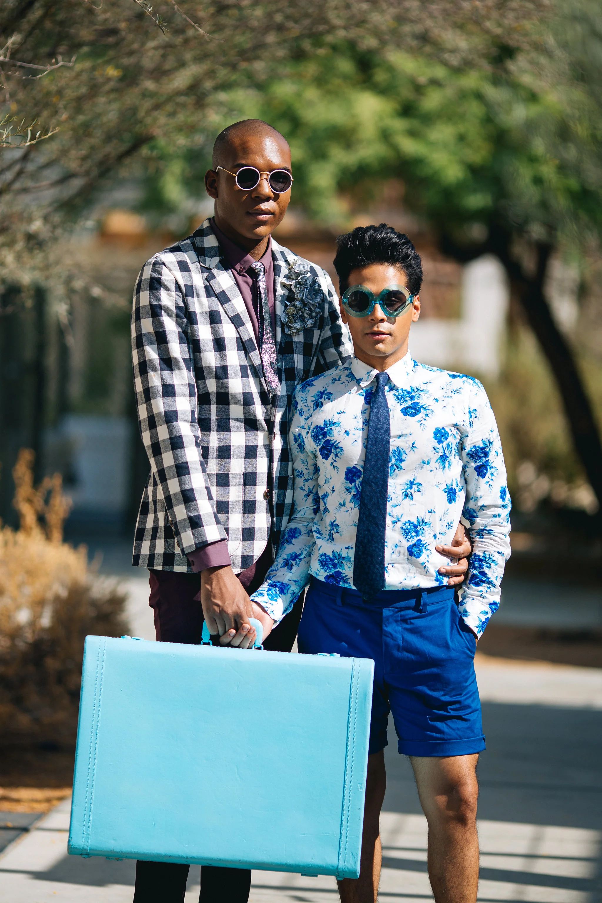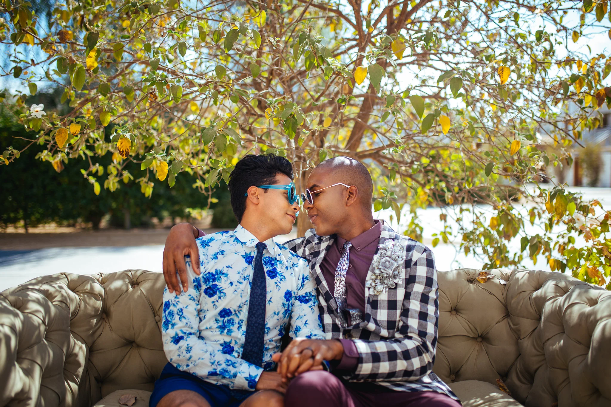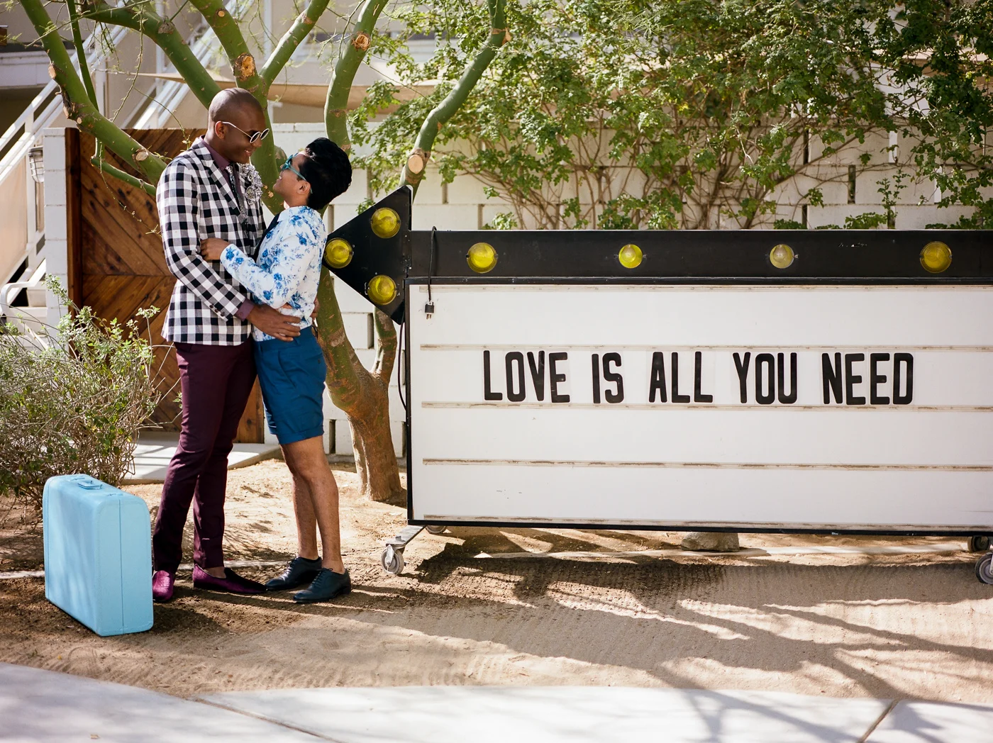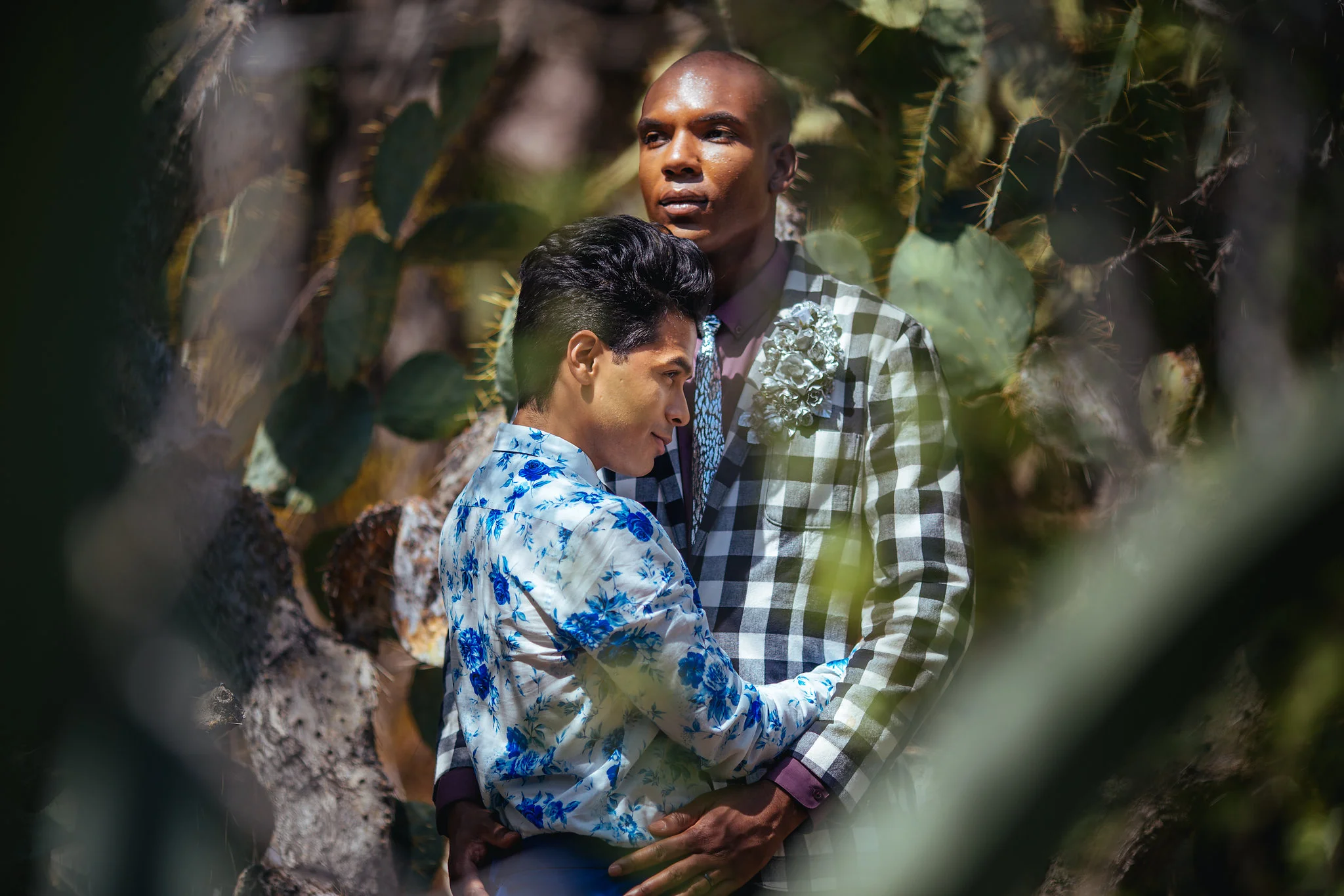 The Story: We start off in the Moorten Botanical garden where they have an elegant elopement. They are wearing chic/glam-style formal wear (aka 70s inspired colorful suits/patterns with ascots/scarves, etc). They walk around Palm Springs together and visit more colorful Palm Springs sites with their suitcases. They check into a hotel room for their honeymoon, and we watch them unpack, change into glam swimwear, put records on, drink champagne, maybe put on some glitter and celebrate! We were inspired by 70s glam fashion icons like Mick Jagger and David Bowie and one of our favorite films that depicts queer male love, Velvet Goldmine.