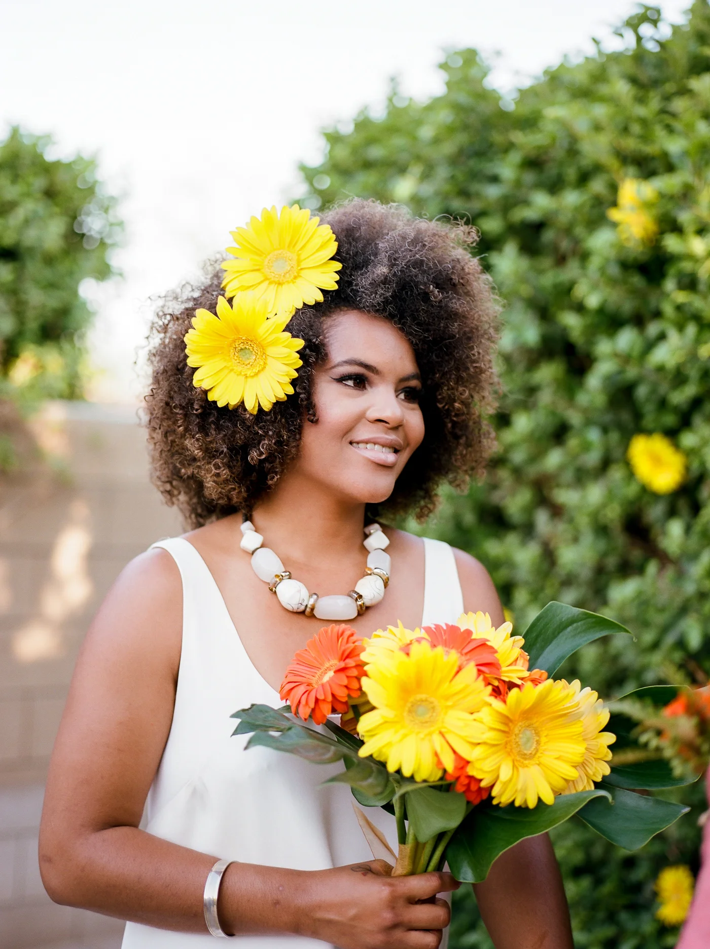 Below, find a 60s-inspired mod elopement shot by two photographers, Jessica Schilling and Shawnee Custalow of A Lovely Photo. The stylist, Bridal Marché, explains her inspiration: "Elopements are always so fun, and with Palm Springs as your background it was an easy decision to have the couple do a poolside elopement. The couple started their day getting dressed together and then eloped under a palm tree in their backyard. After their 'I do's they jumped into the pool and had a fun backyard reception."