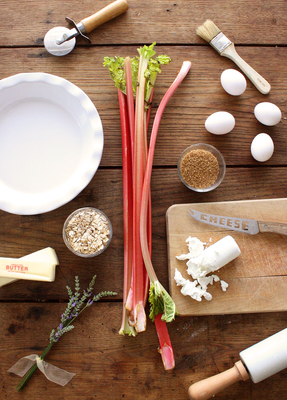 I remember picking flavors with the couple, by the time we got flavor #6 or so, there was lots of head-scratching. Because when you have to make 10 unique pies, you really can’t do anything run of the mill—they’d all essentially turn out to be the same, boring pie*. So we decided to do a little twist on the classic spring rhubarb pie by adding chevre, and on my second go round, I decided to add a little lavender. The end result is a light, refreshing pie with subtle flavors that are perfectly spring-y. Enjoy!