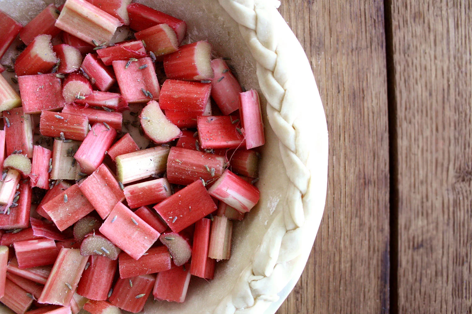 2. Spread chopped rhubarb in prepared crust. Sprinkle lavender evenly over fruit.