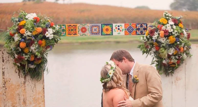The whole wedding theme started with Talavera Tiles. We love color and patterns, and wanted to incorporate these in as many ways as possible. They lined the aisle for the wedding, we added them to our homemade arbor, and we made coasters for each guest as a keepsake from the day. Luckily we saved a few for ourselves and they come in handy often for both indoor and outdoor entertaining! We also plan to do a bathroom renovation with the remaining supply soon.