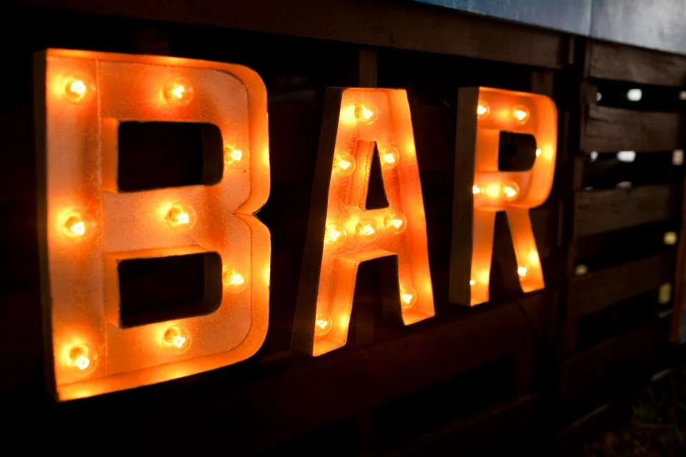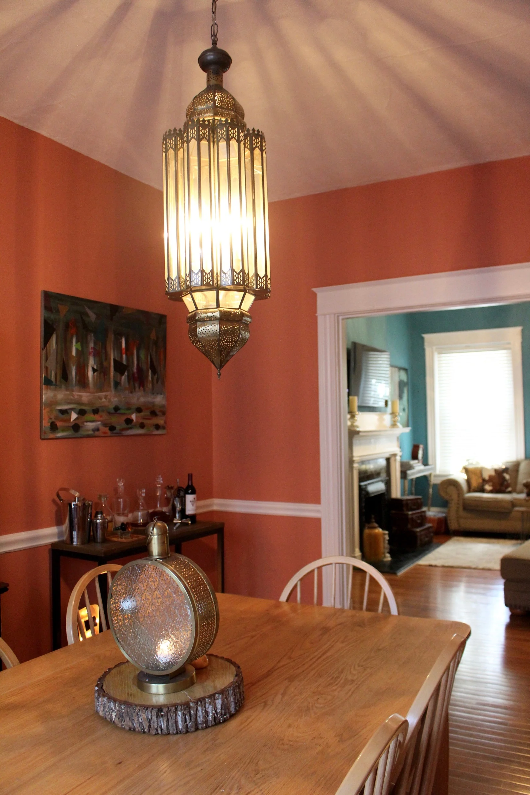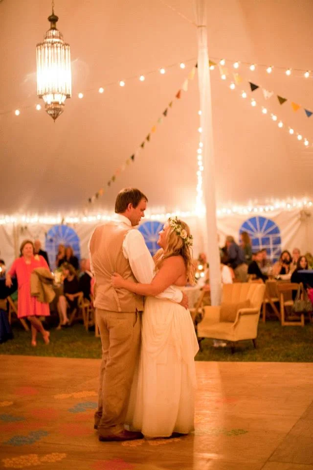 The chandelier from our big white tent was a fun, cheap find purchased for $78. We could have rented one for a couple hundred, but why rent, when the purchase was so much cheaper. Once we bought our first home we knew the perfect place to hang it — right above our dinning room table. In addition to the chandelier, we were able to use all of the bistro lighting in our back yard making it fun and celebratory every night. We also held onto our marquee BAR sign and have found a home for it under our decanter collection.