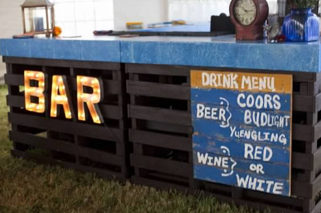 We wanted a rustic look for our bars at the wedding. My dad spent hours making us two wooden pallet bars with bright colorful tops. It didn’t take any upcycling, just a quick move on the truck bed, but now the bar that was once dishing out wedding drinks is a fun addition to our little fenced-in backyard in the city of Richmond.
