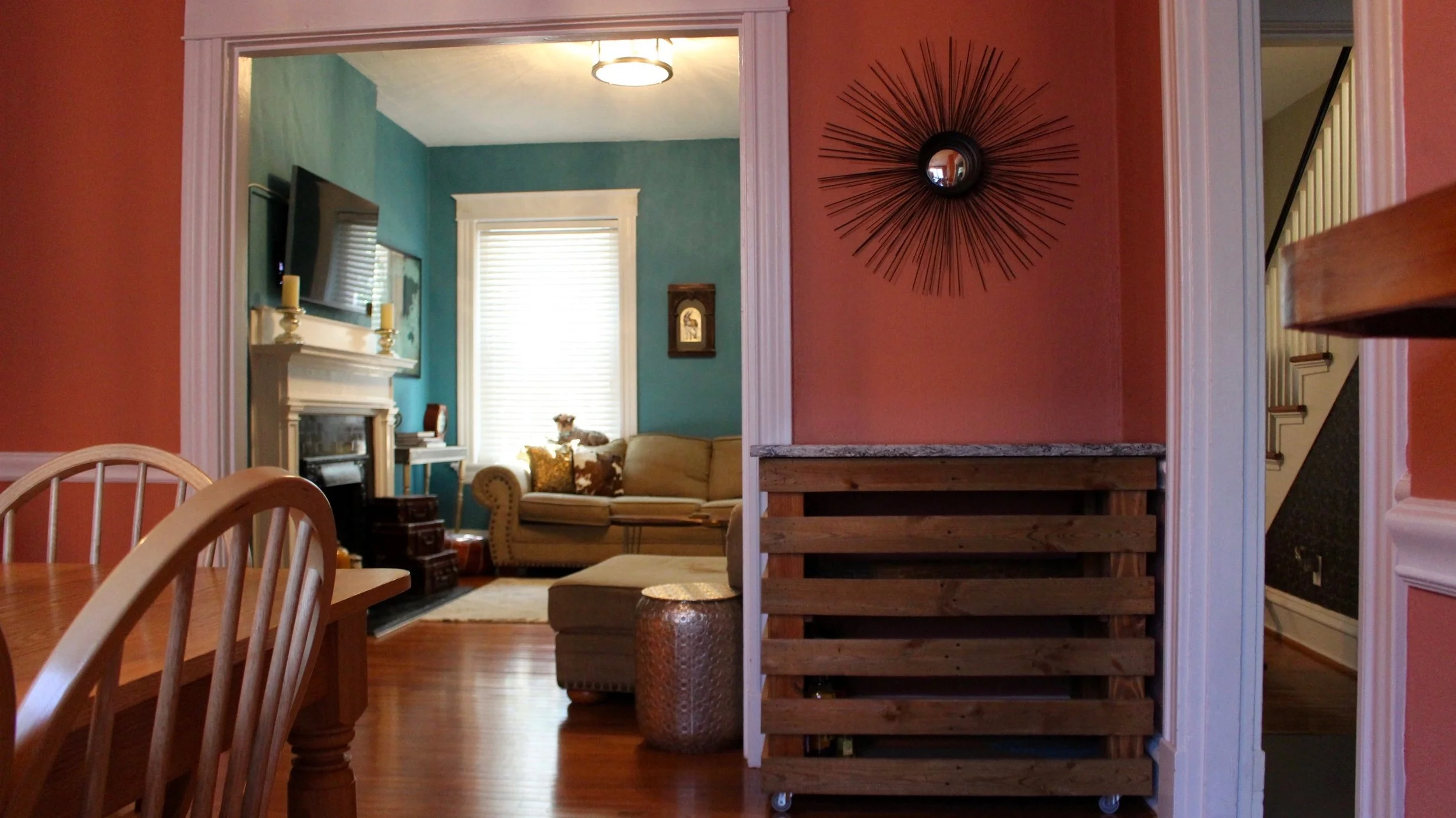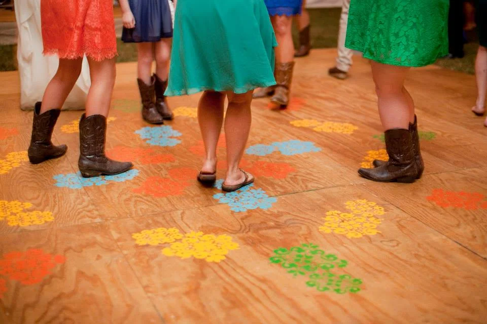 Rather than paying to rent a dance floor, we chose to buy and treat a few pieces of plywood because it was vastly less expensive. I wanted a little color on the floor to match our multicolor theme so I was able to stencil a fun pattern along the corners and in the center of the dance floor. With a new home there’s always a few things you want to add, and having some extra wood on hand makes those projects move along a lot faster. We were able to use the dance floor to create shelving in our living room and storage in our basement. My father also used one of the leftover wooden pallets to create a rolling bar cart and the shelves were also made out of the floor and a keepsake portion of the stencil is included. It’s a constant reminder of our big day!