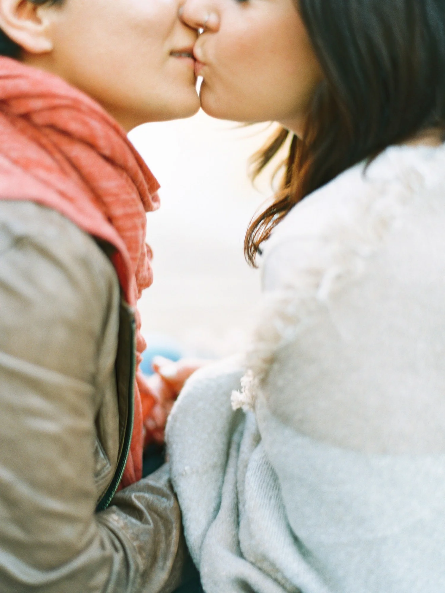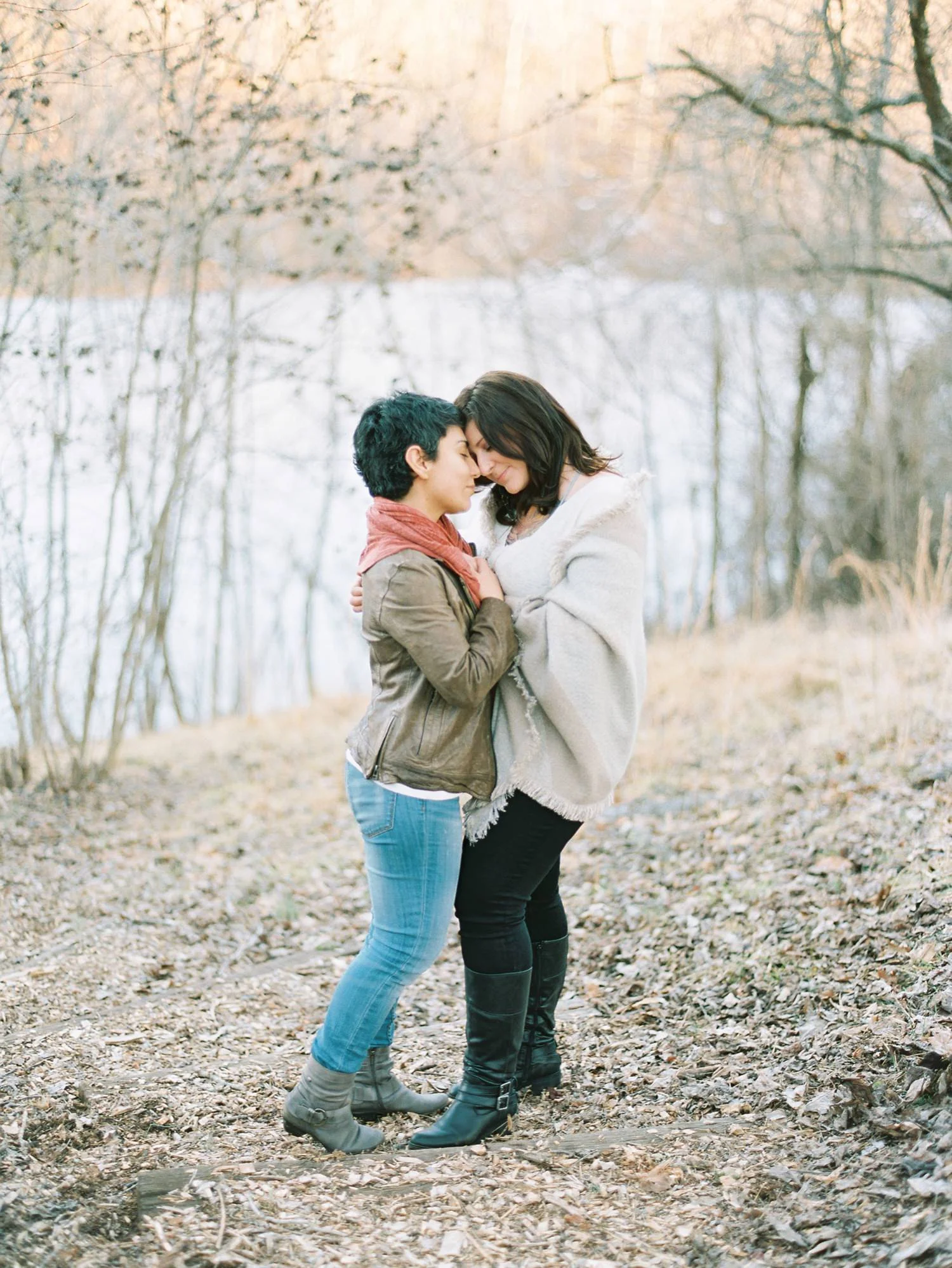 Fast forward to the actual engagement session: It was this photographer’s dream. (1) We were fortunate that attempt #2 landed on a gorgeous 60-degree day, filled with warm sunshine. (2) Sally and Sophia were truly one of the easiest couples I’ve ever photographed. They were honestly up for anything at all and we spent so much time laughing. (3) The lake was still frozen over, and I was in complete awe of this (being a warm day, this was unexpected). I cannot thank these two enough for being so willing to stand in a puddle of water, lie down next to each other on a damp wooden dock, and hold a lengthier-than-usual kiss for my first double exposure experiment on film.