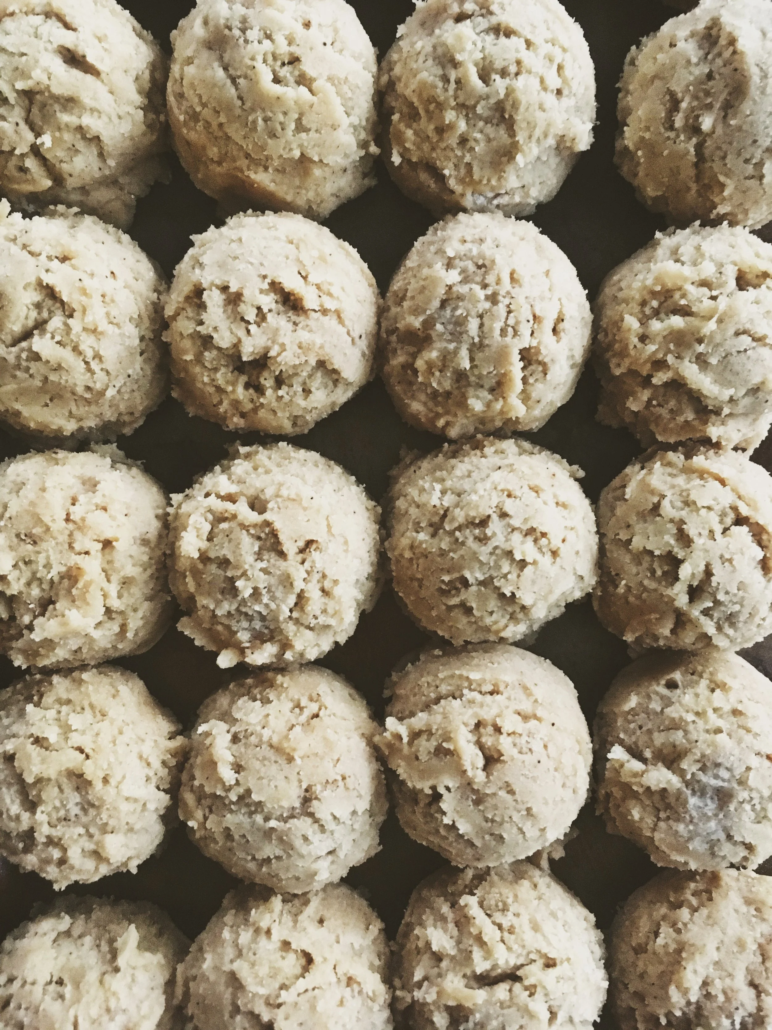 Combine the ¼ cup sugar and cinnamon in a small bowl. Use a metal scoop (or a spoon if you don't have one) to form the dough into 1 ½” balls. Roll each ball in the cinnamon sugar mixture, coating them all around. Chill in the fridge for an hour, at least.