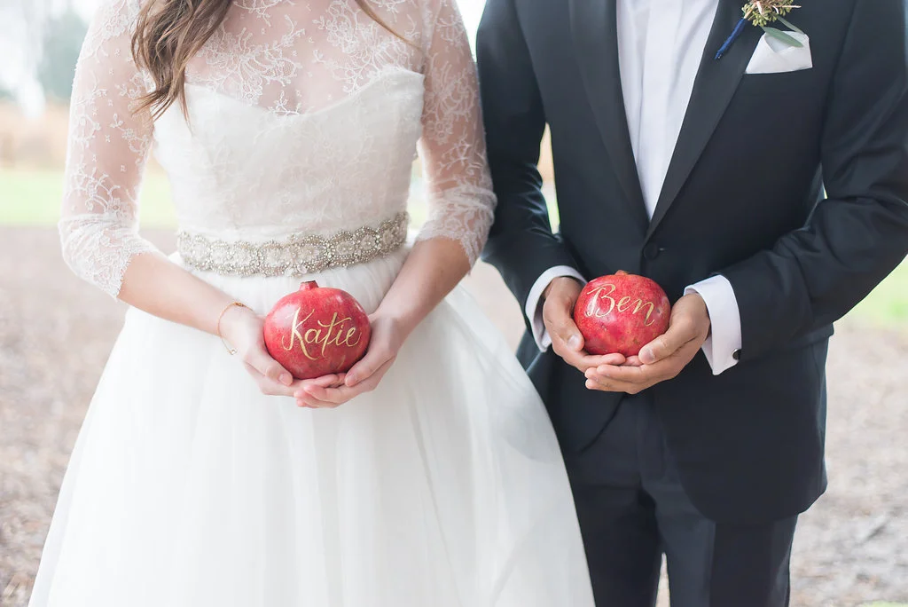 /This shoot shows a classic color combination of how to use navy blue, red, and gold but with a modern twist. The navy blue is accented with gold metallics throughout this editorial, and while the flowers are a classic "wedding white," they are displayed in a new way using terrariums, as well as vases of various heights. The pop of color from the pomegranates used as place cards brings a fun twist to the timeless look and is one of our favorite details of this shoot. The menu cards were a very close second! Styled shoots are all about creativity and the spinning entree choice was such a cool way to present your guests their menu options. On top of that, our model's bolero is removable, making it the perfect way to transition from a formal ceremony to a more laid back reception! And for colder wedding months this is the perfect accessory to add a bit of warmth! It's funny because we originally planned on a sunny styled shoot, so at first when we saw the wash out weather we were mortified, but I think all in all the rain really added to the intimacy and portrayal of the couple, proving that a rainy wedding day can still be just as gorgeous, if not more!