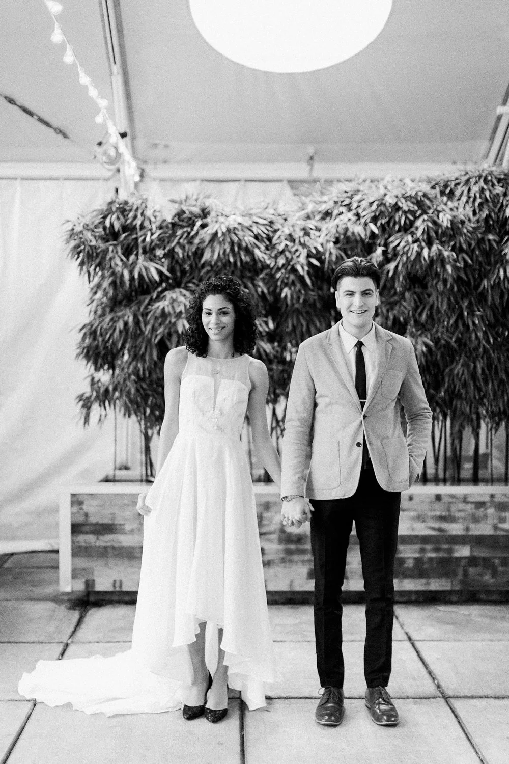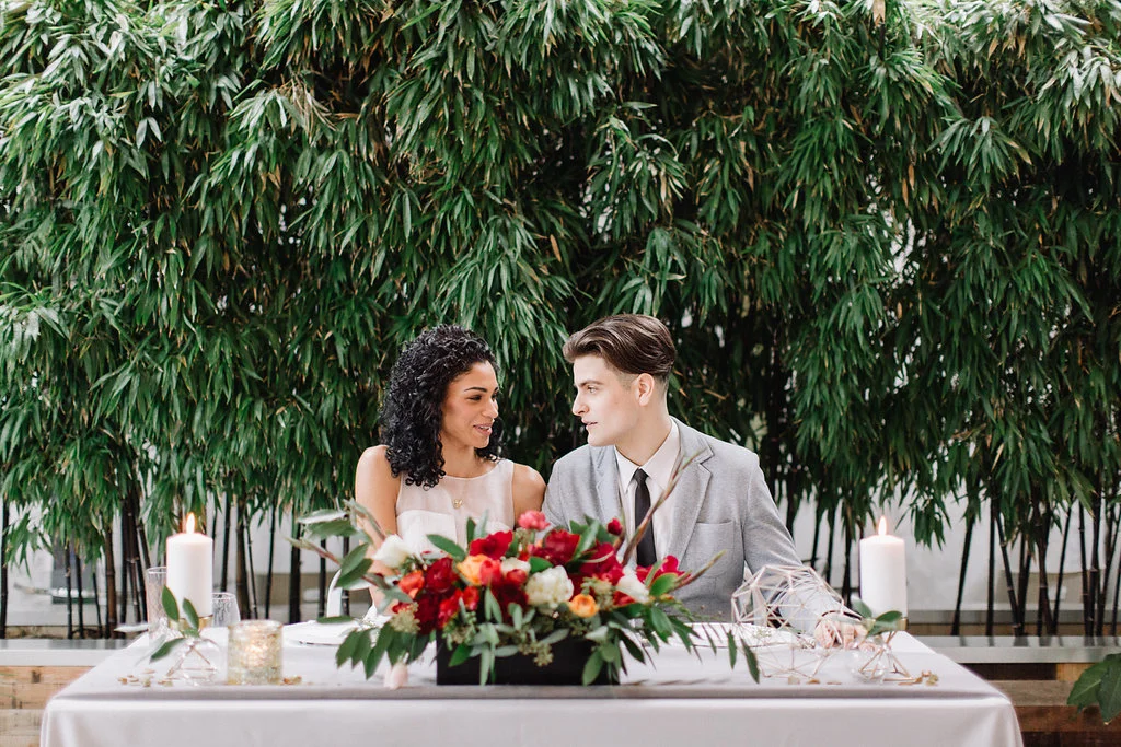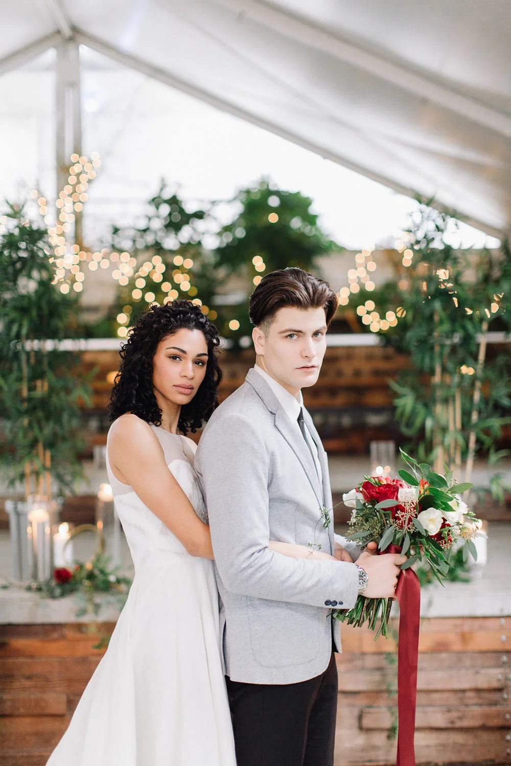 An incredible team of vendors came together to help propel diversity and acceptance in the wedding industry. Cassandra Kennedy created an effortlessly beautiful look for our bride. Sarah Renard took classic blooms and arranged them with flare, creating a chic bouquet and centerpiece. Elizabeth Dye’s use of linen and an asymmetrical hemline created a stunning and perfectly modern silhouette that paired seamlessly with the beautiful handcrafted Rhodolite Garnet ring and Grey Diamond necklace by The NorthWay Studio. Kelsey Malie’s stunning modern invitation suite was the perfect balance of light and dark tones and tied together our color palette and theme. And the power duo of Elaine and Erin from Power of Love Rentals styled the scene magnificently.