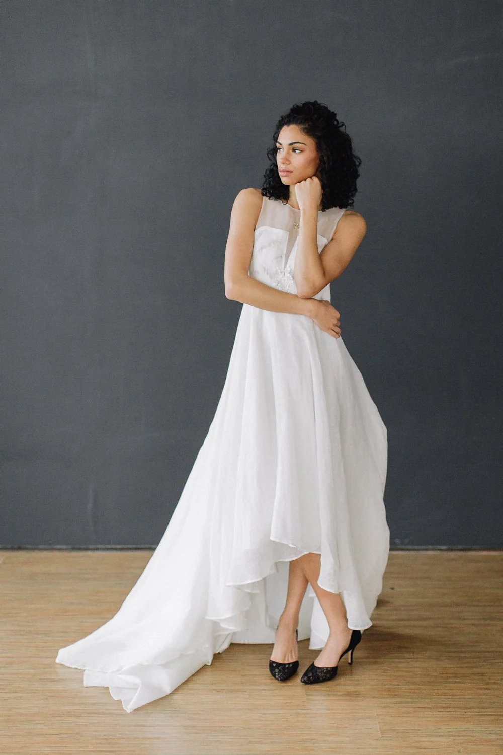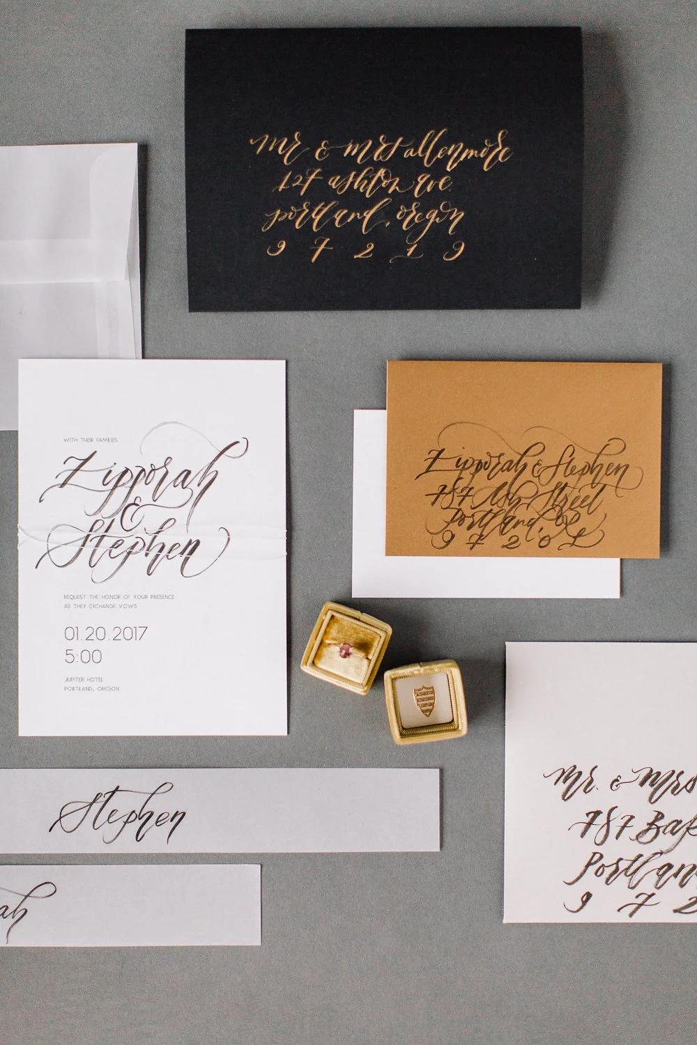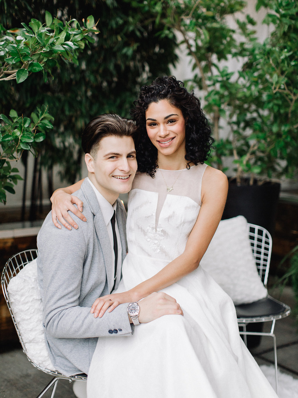 An incredible team of vendors came together to help propel diversity and acceptance in the wedding industry. Cassandra Kennedy created an effortlessly beautiful look for our bride. Sarah Renard took classic blooms and arranged them with flare, creating a chic bouquet and centerpiece. Elizabeth Dye’s use of linen and an asymmetrical hemline created a stunning and perfectly modern silhouette that paired seamlessly with the beautiful handcrafted Rhodolite Garnet ring and Grey Diamond necklace by The NorthWay Studio. Kelsey Malie’s stunning modern invitation suite was the perfect balance of light and dark tones and tied together our color palette and theme. And the power duo of Elaine and Erin from Power of Love Rentals styled the scene magnificently.