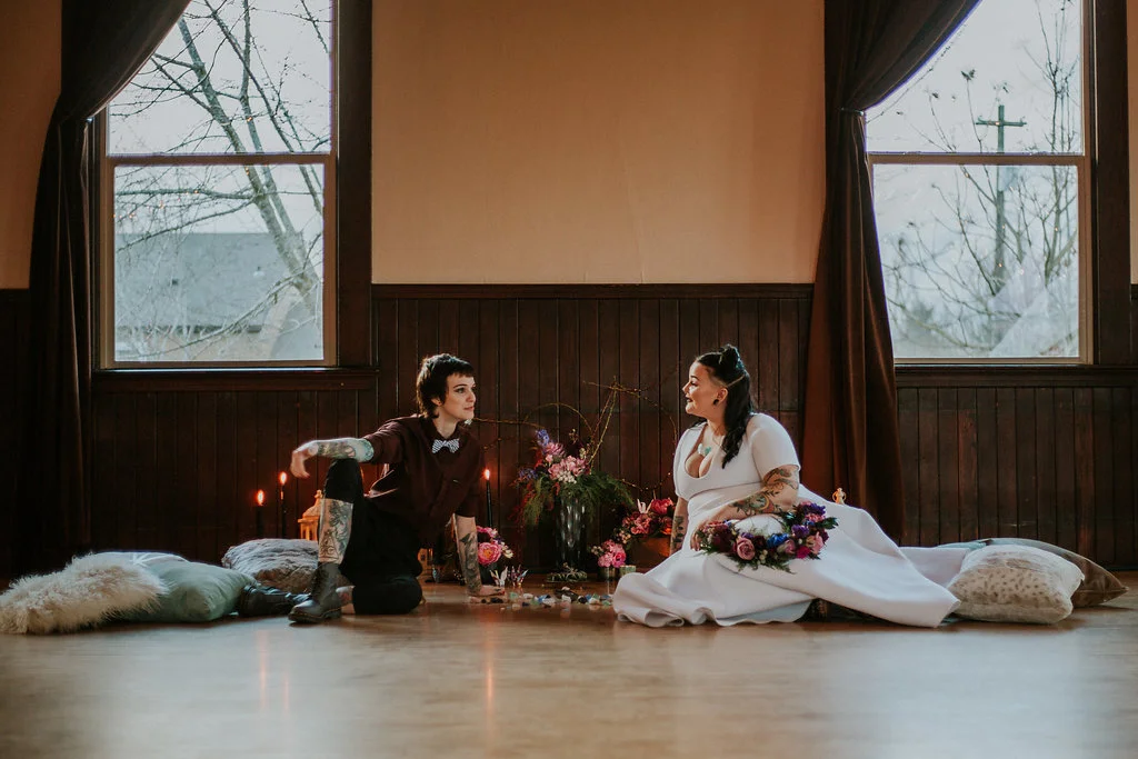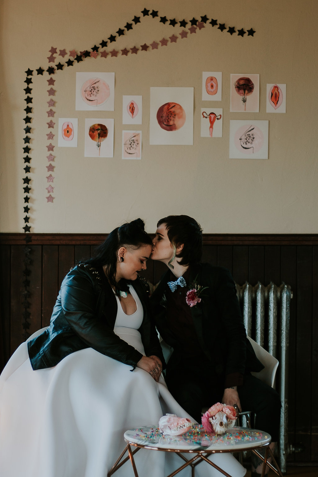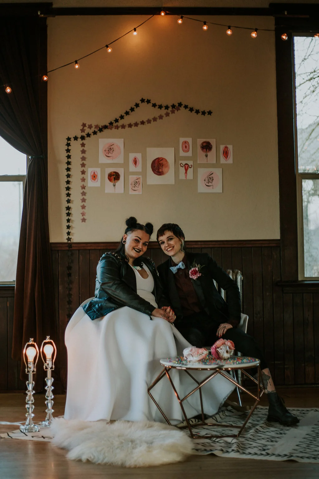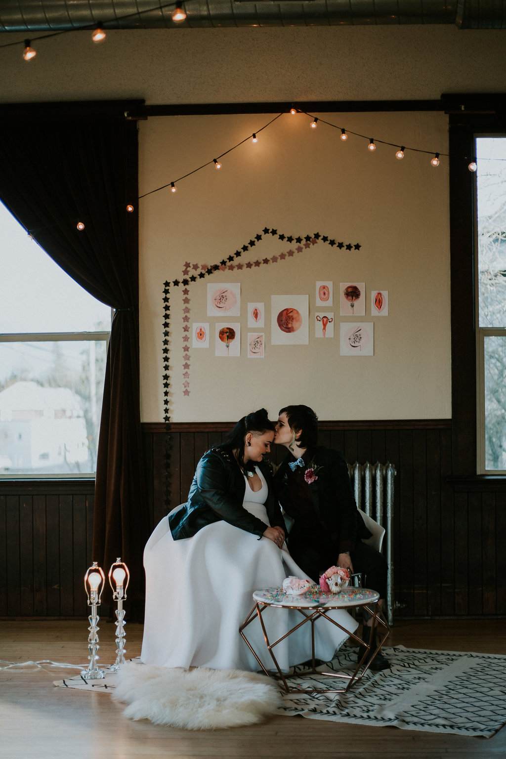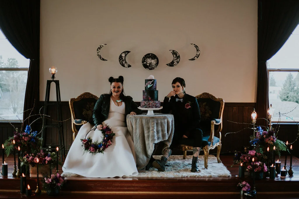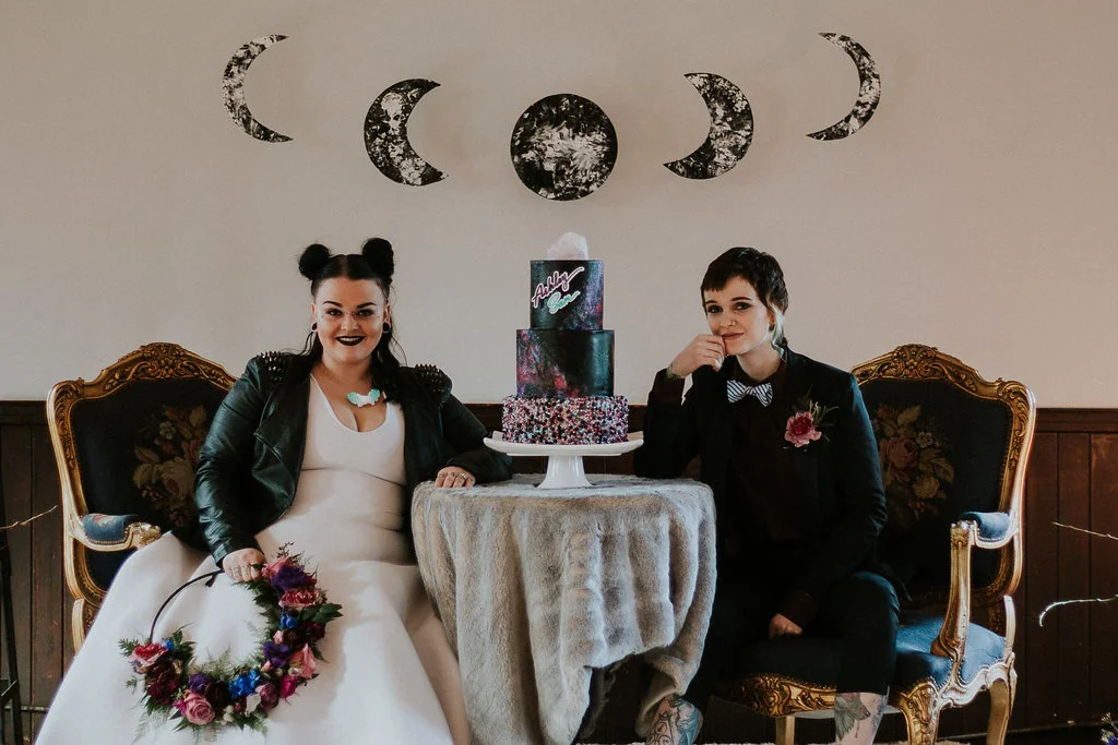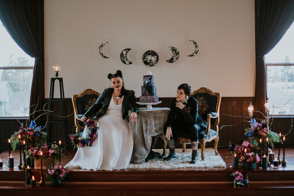 We are excited to partner with a magazine that disrupts the patriarchal capitalist wedding industry in favor of incredible and meaningful weddings that foster intimate moments of connection and equity. Blush and eggshell weddings are lovely, but we loved getting out of the box as we curated an eclectic goth-glam wedding shoot with pops of 90s flare. In the Catalyst spirit, our styled shoot featured curvy LGBTQ love, and our design featured a fresh and clean concept with out-of-the-box details. We mixed moody with bright, intimacy with celebration. It was a blast to break out of the usual wedding industry whitewashed copy-of-a-copy funk and do something entirely different. In partnership with Catalyst, we loved creating a funky alternative styled shoot that celebrates all bodies and all love! Drawing on the cultural heritages of each of our vendors, this celestial yet earthy lesbian wedding included beautiful, creative details—animal skulls painted by a local Native American artist, hand-painted feminist art adorning the refined yet funky lounge area, a moon phase backdrop, an intimate and spiritual wedding ceremony, and a rad glitter hair part, to name a few.