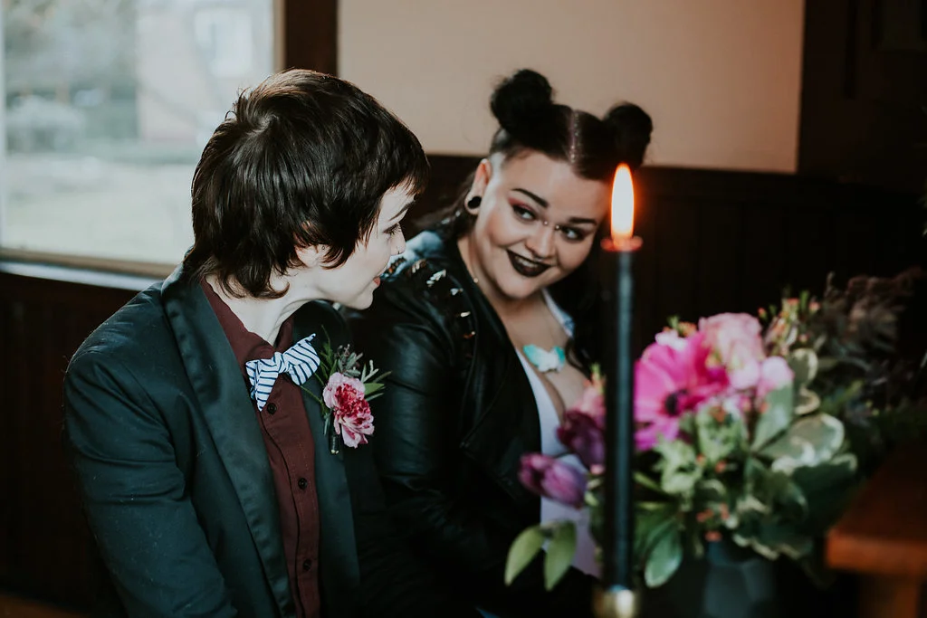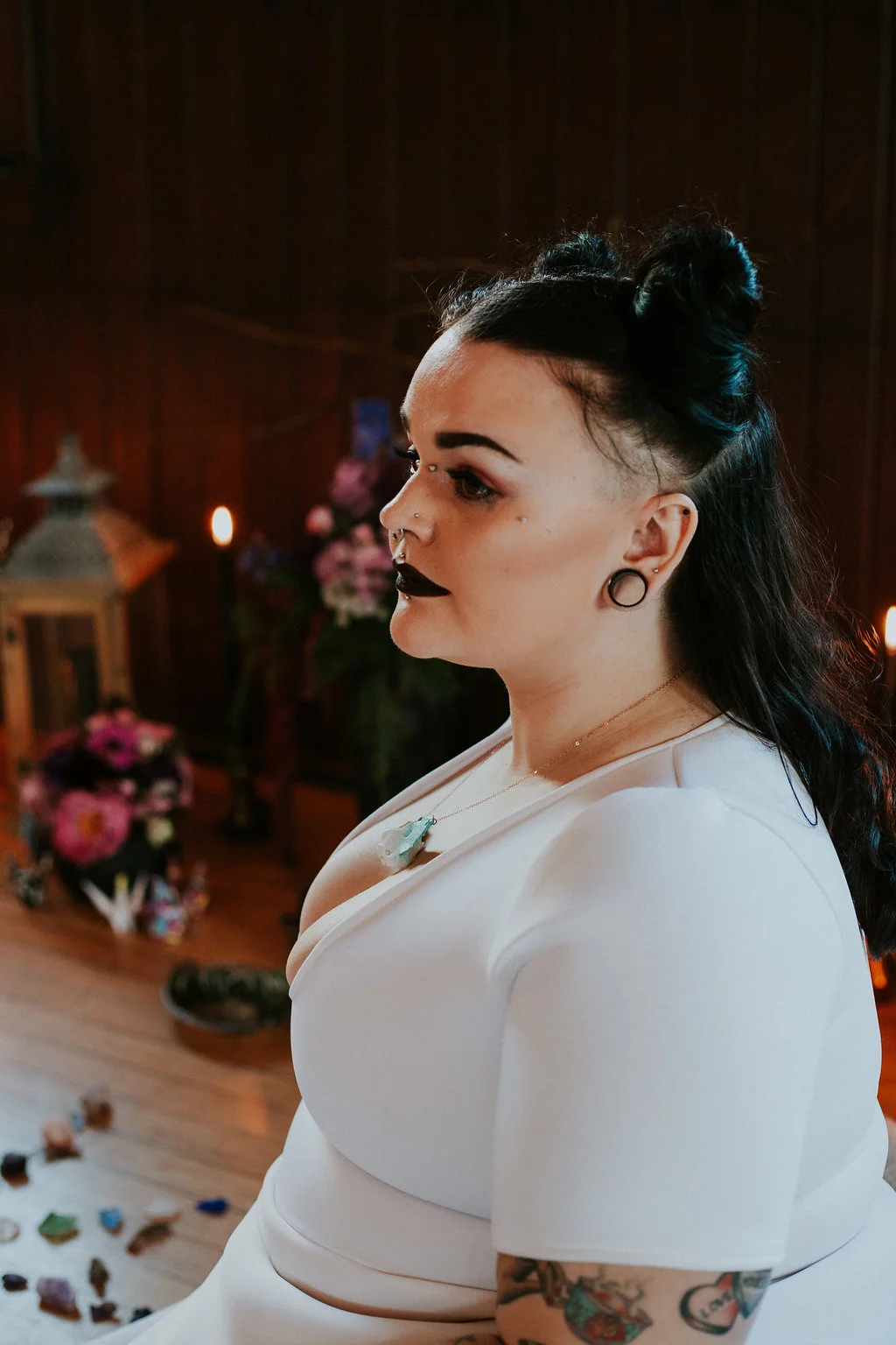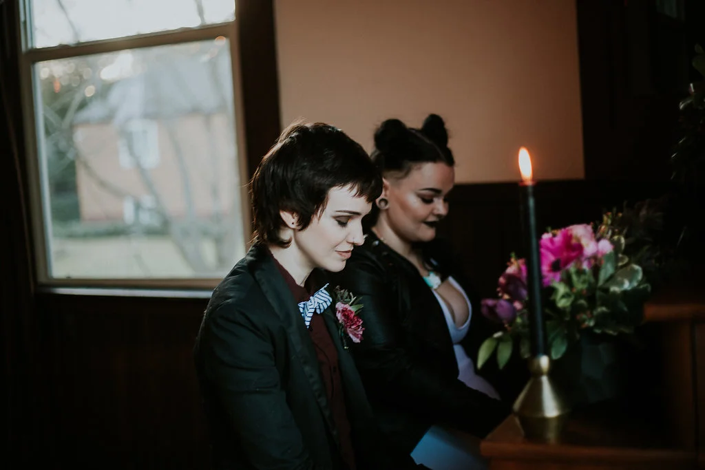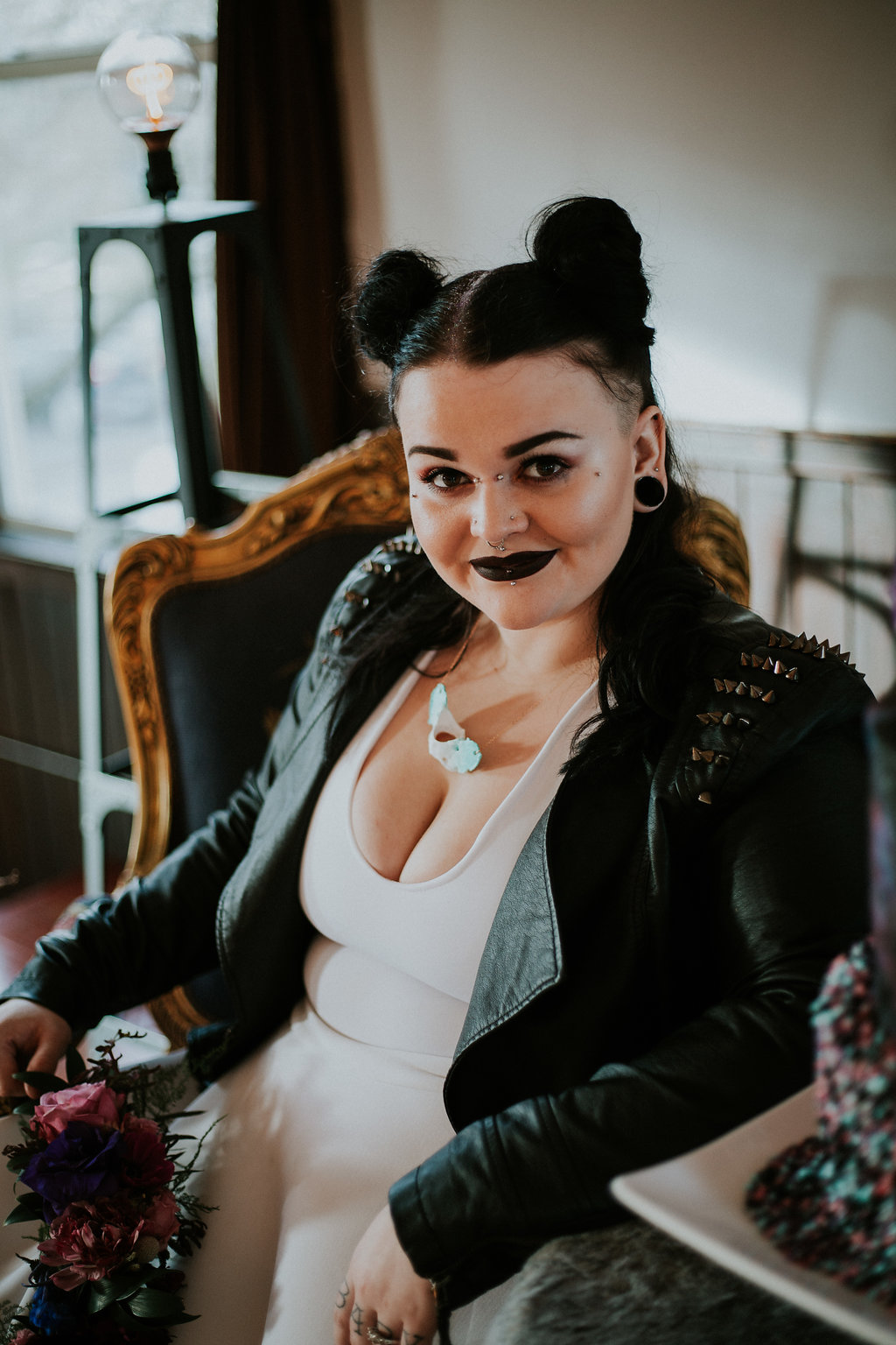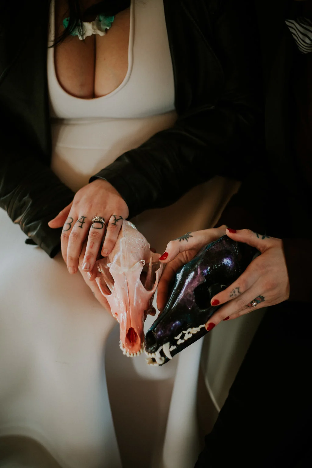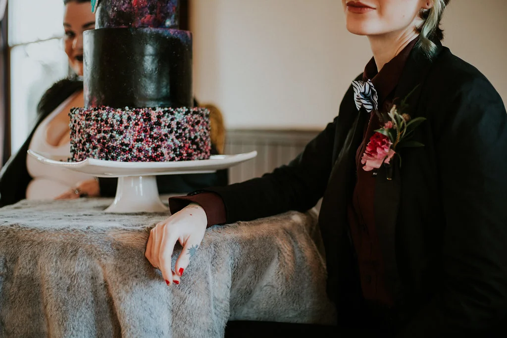 We are excited to partner with a magazine that disrupts the patriarchal capitalist wedding industry in favor of incredible and meaningful weddings that foster intimate moments of connection and equity. Blush and eggshell weddings are lovely, but we loved getting out of the box as we curated an eclectic goth-glam wedding shoot with pops of 90s flare. In the Catalyst spirit, our styled shoot featured curvy LGBTQ love, and our design featured a fresh and clean concept with out-of-the-box details. We mixed moody with bright, intimacy with celebration. It was a blast to break out of the usual wedding industry whitewashed copy-of-a-copy funk and do something entirely different. In partnership with Catalyst, we loved creating a funky alternative styled shoot that celebrates all bodies and all love! Drawing on the cultural heritages of each of our vendors, this celestial yet earthy lesbian wedding included beautiful, creative details—animal skulls painted by a local Native American artist, hand-painted feminist art adorning the refined yet funky lounge area, a moon phase backdrop, an intimate and spiritual wedding ceremony, and a rad glitter hair part, to name a few.