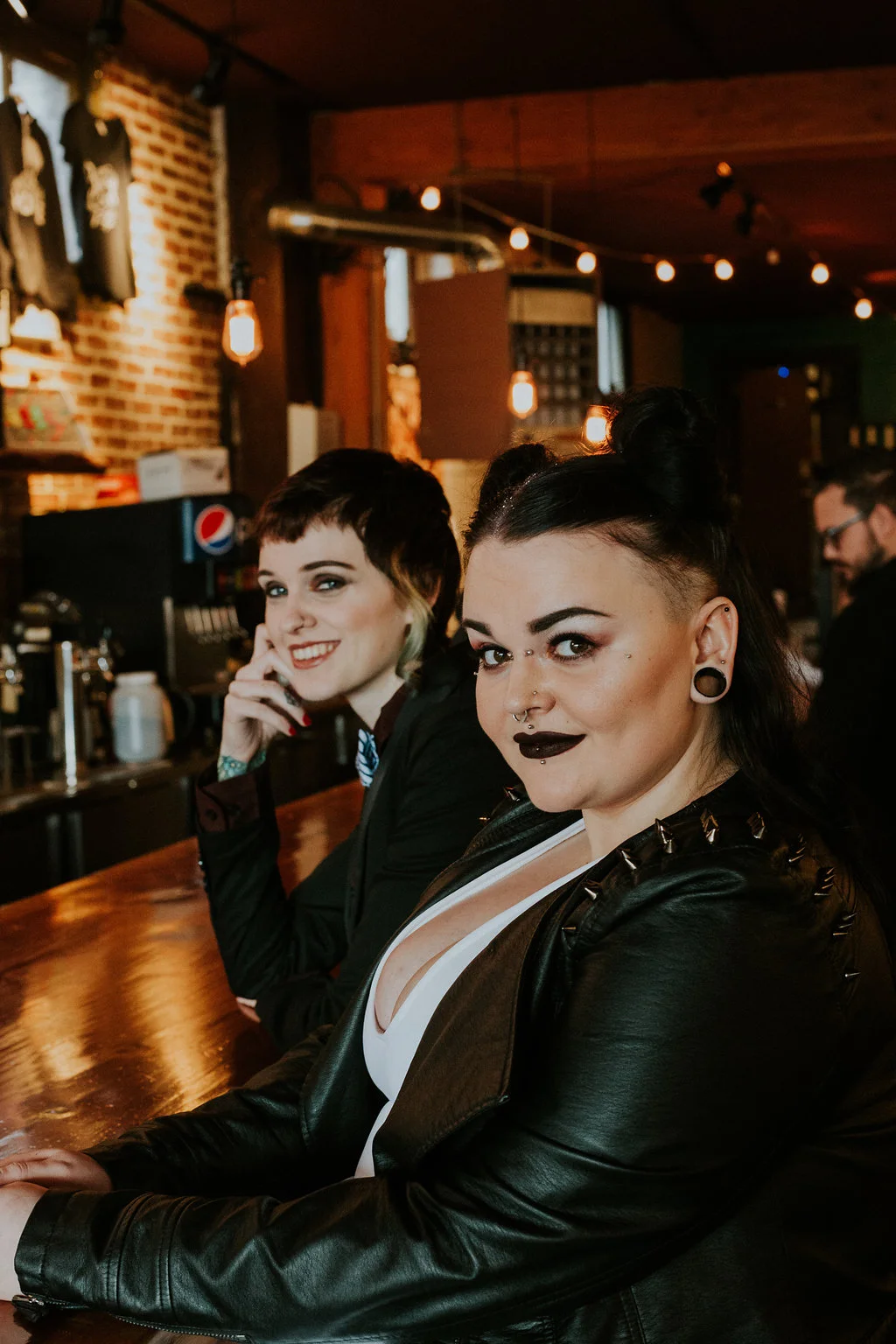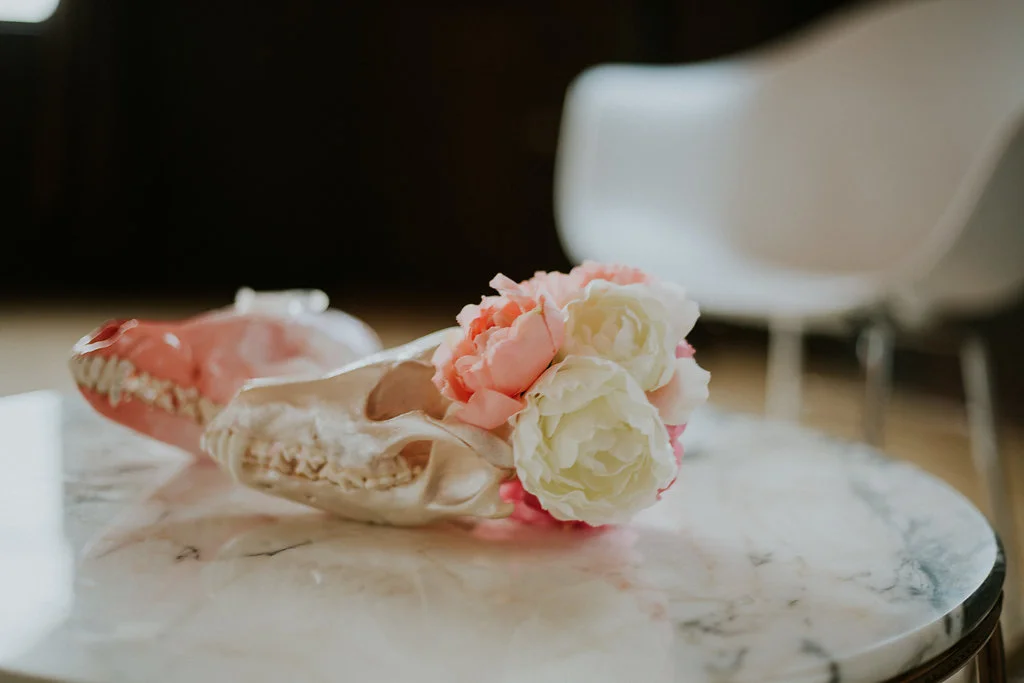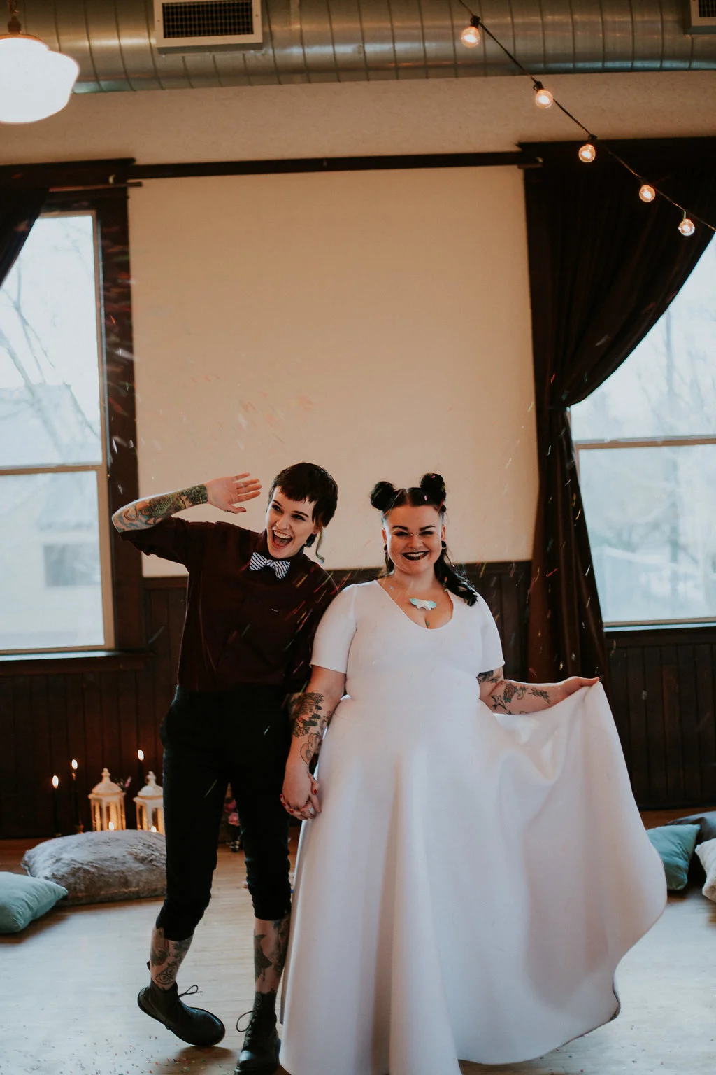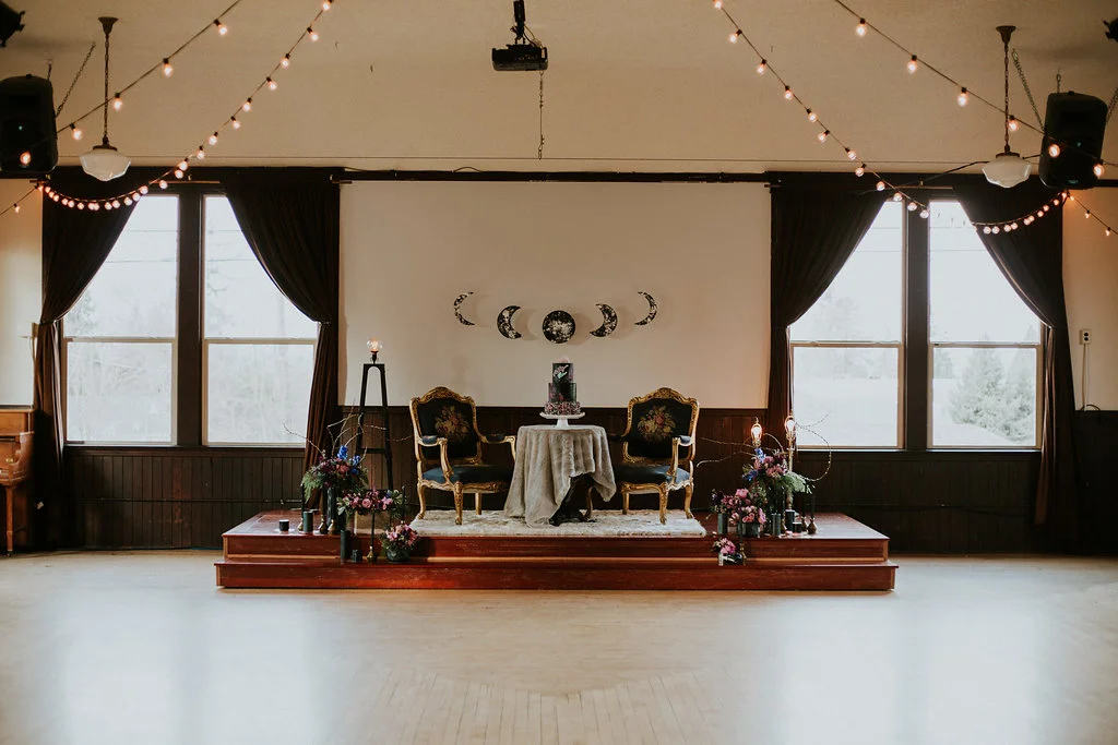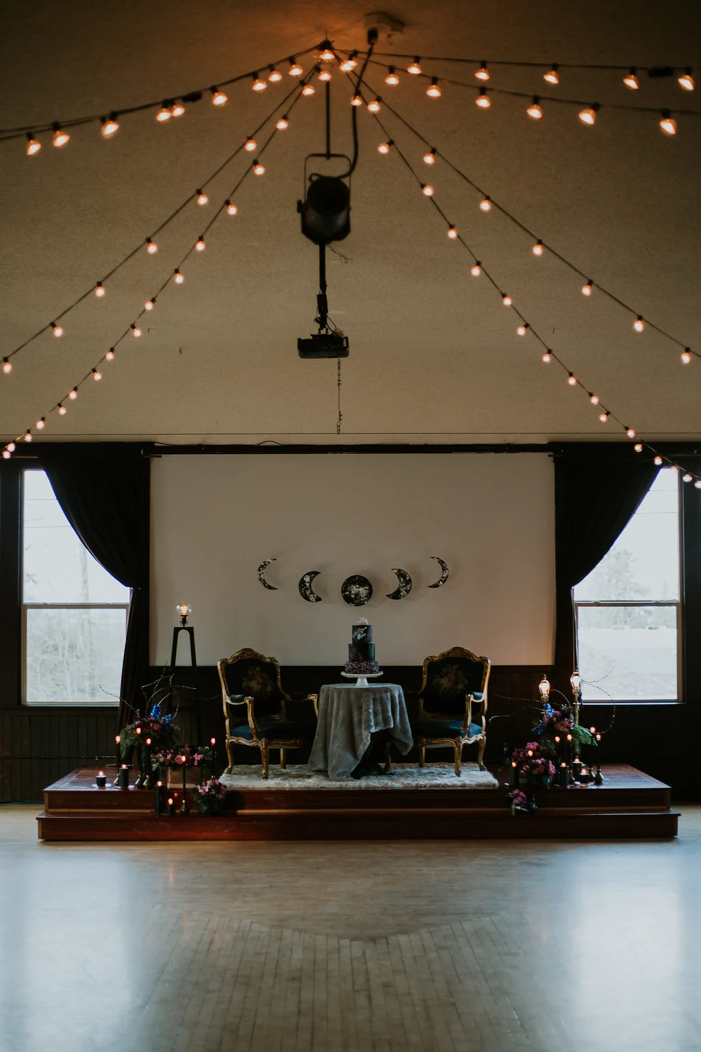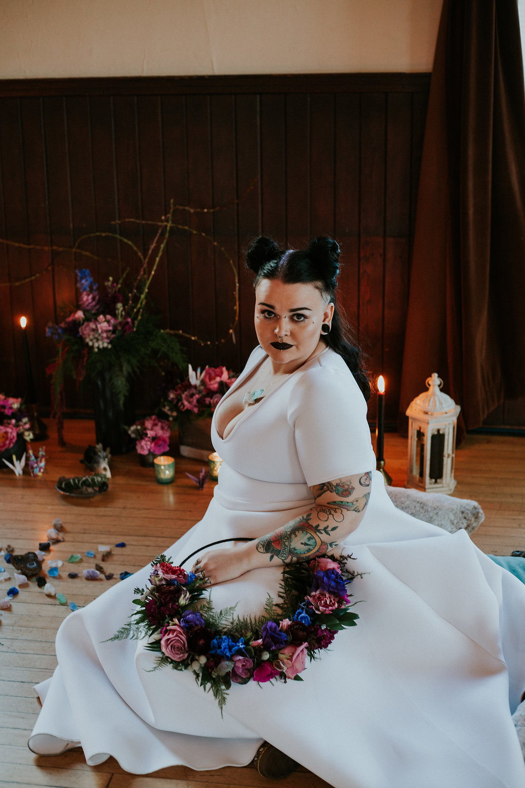 We are excited to partner with a magazine that disrupts the patriarchal capitalist wedding industry in favor of incredible and meaningful weddings that foster intimate moments of connection and equity. Blush and eggshell weddings are lovely, but we loved getting out of the box as we curated an eclectic goth-glam wedding shoot with pops of 90s flare. In the Catalyst spirit, our styled shoot featured curvy LGBTQ love, and our design featured a fresh and clean concept with out-of-the-box details. We mixed moody with bright, intimacy with celebration. It was a blast to break out of the usual wedding industry whitewashed copy-of-a-copy funk and do something entirely different. In partnership with Catalyst, we loved creating a funky alternative styled shoot that celebrates all bodies and all love! Drawing on the cultural heritages of each of our vendors, this celestial yet earthy lesbian wedding included beautiful, creative details—animal skulls painted by a local Native American artist, hand-painted feminist art adorning the refined yet funky lounge area, a moon phase backdrop, an intimate and spiritual wedding ceremony, and a rad glitter hair part, to name a few.