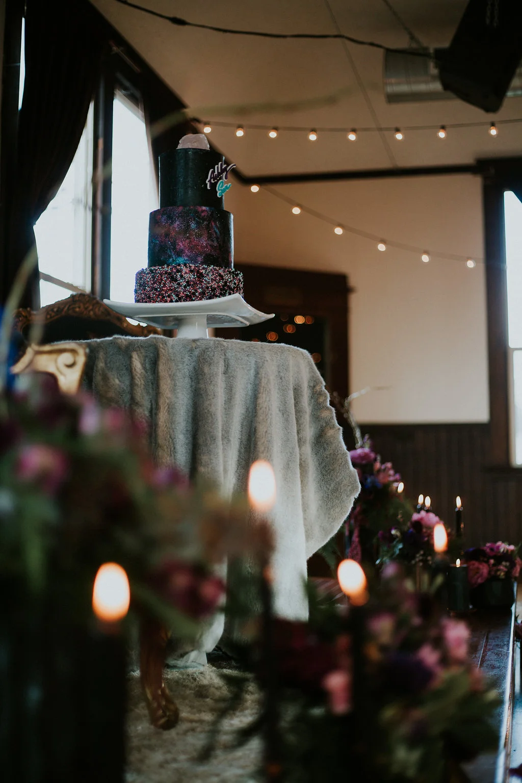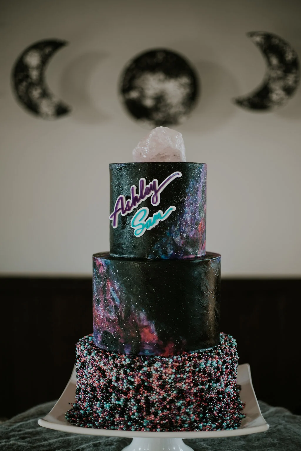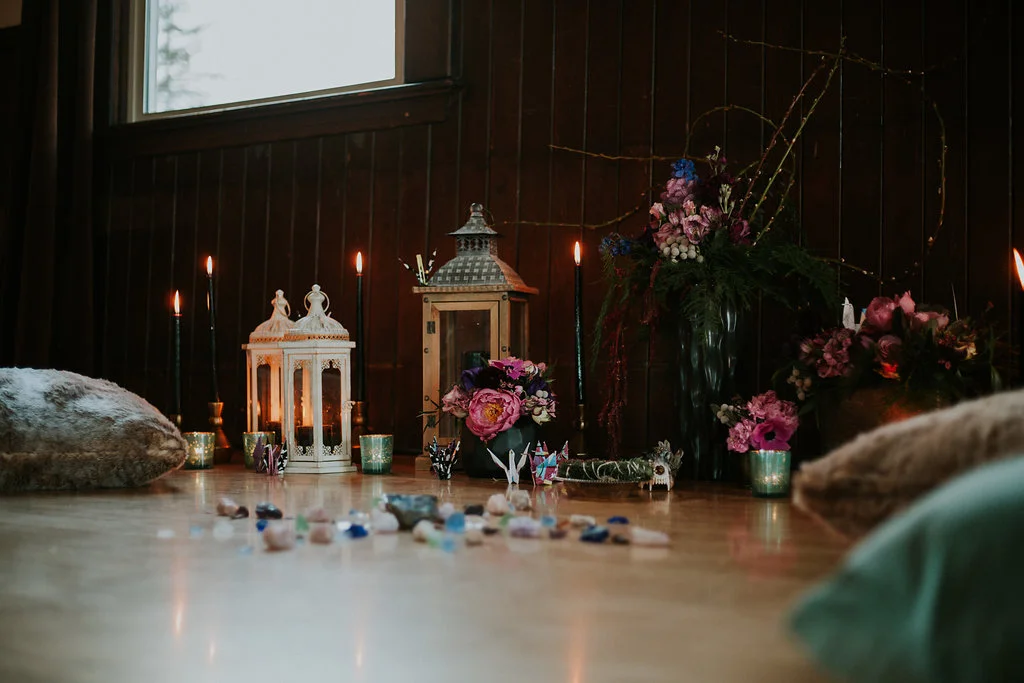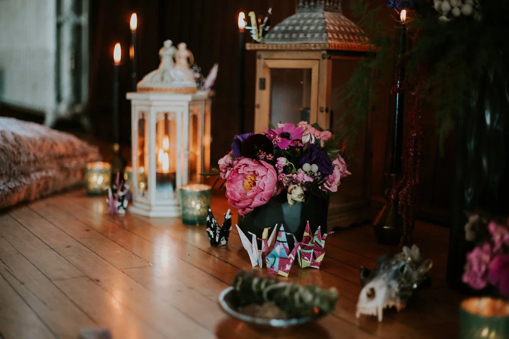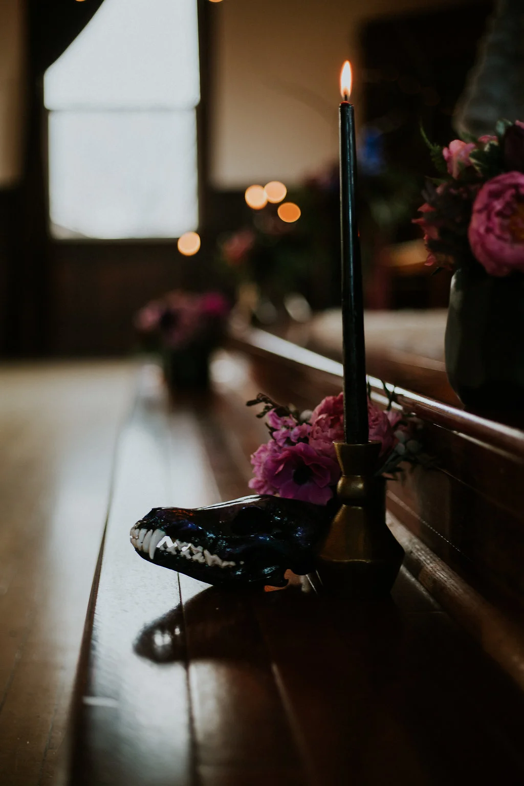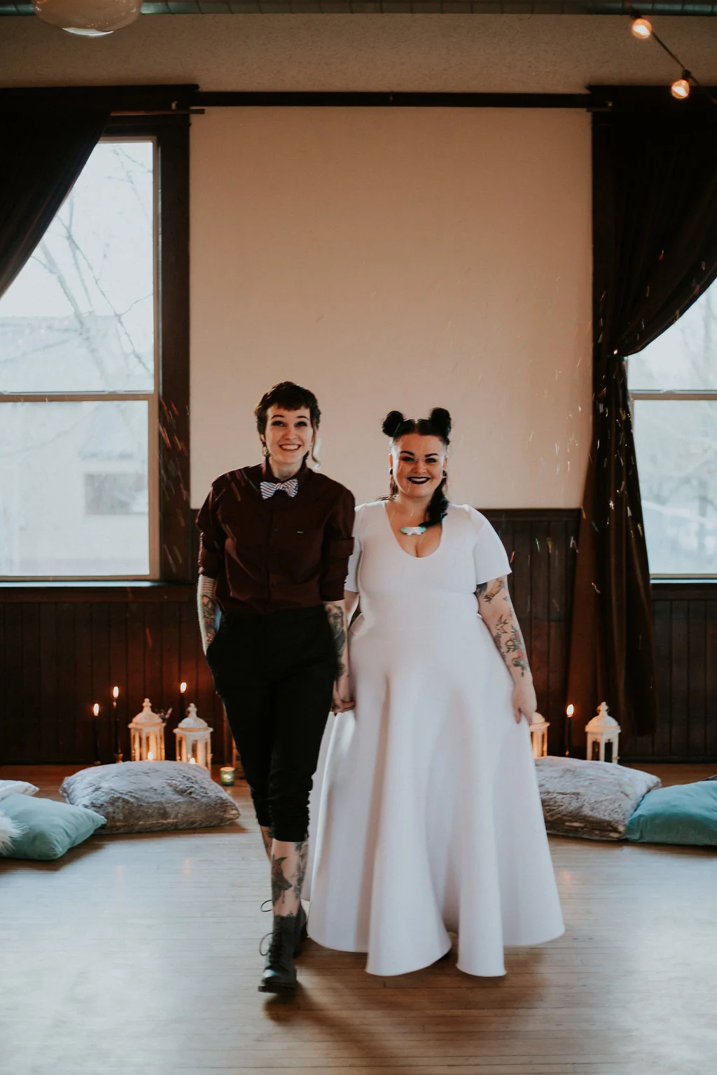 We are excited to partner with a magazine that disrupts the patriarchal capitalist wedding industry in favor of incredible and meaningful weddings that foster intimate moments of connection and equity. Blush and eggshell weddings are lovely, but we loved getting out of the box as we curated an eclectic goth-glam wedding shoot with pops of 90s flare. In the Catalyst spirit, our styled shoot featured curvy LGBTQ love, and our design featured a fresh and clean concept with out-of-the-box details. We mixed moody with bright, intimacy with celebration. It was a blast to break out of the usual wedding industry whitewashed copy-of-a-copy funk and do something entirely different. In partnership with Catalyst, we loved creating a funky alternative styled shoot that celebrates all bodies and all love! Drawing on the cultural heritages of each of our vendors, this celestial yet earthy lesbian wedding included beautiful, creative details—animal skulls painted by a local Native American artist, hand-painted feminist art adorning the refined yet funky lounge area, a moon phase backdrop, an intimate and spiritual wedding ceremony, and a rad glitter hair part, to name a few.