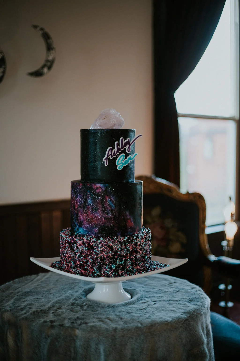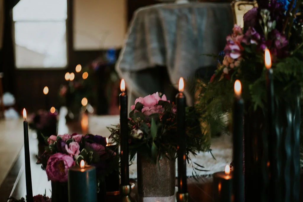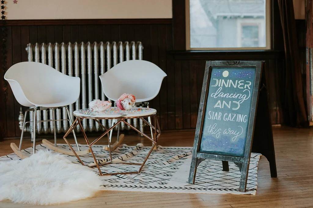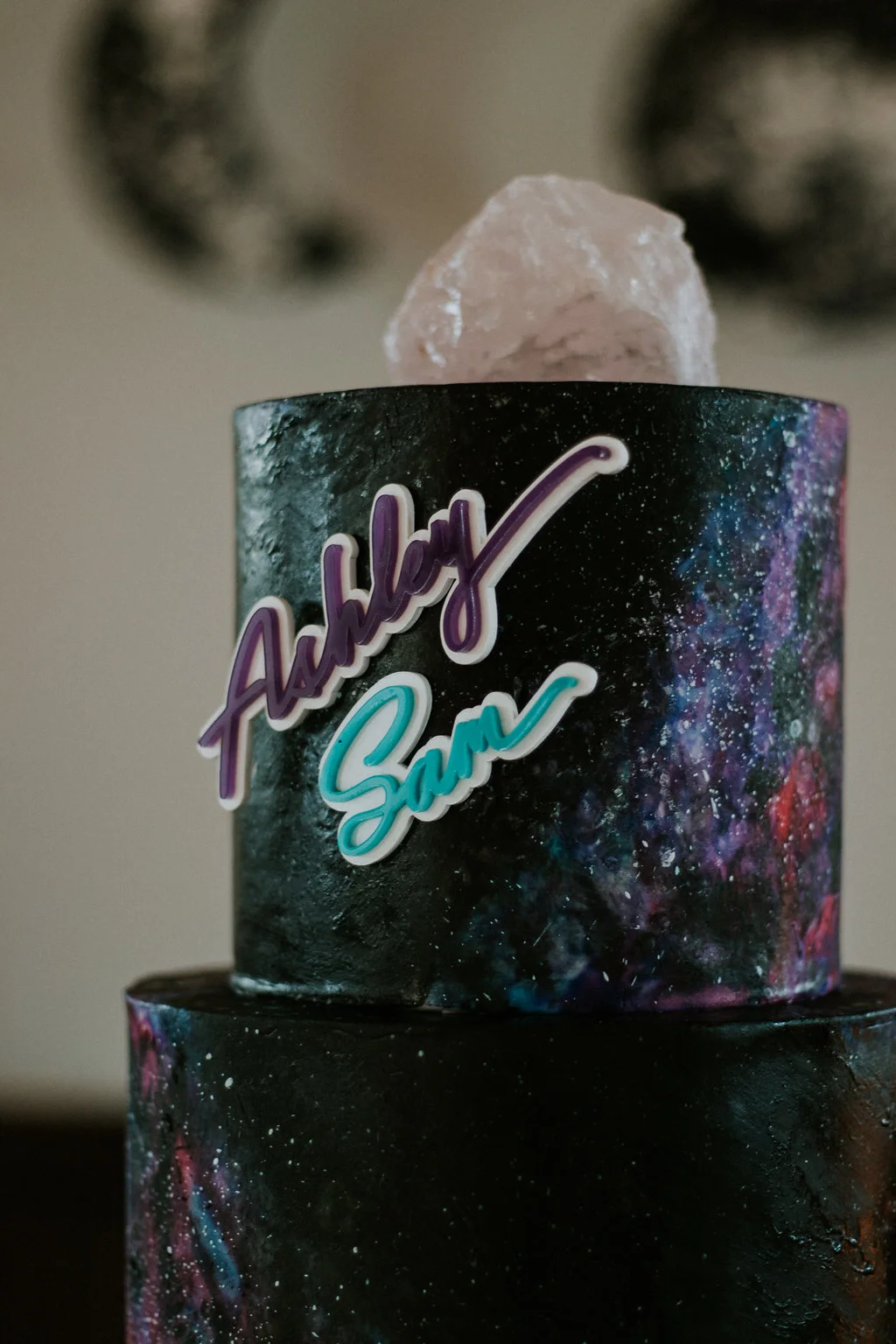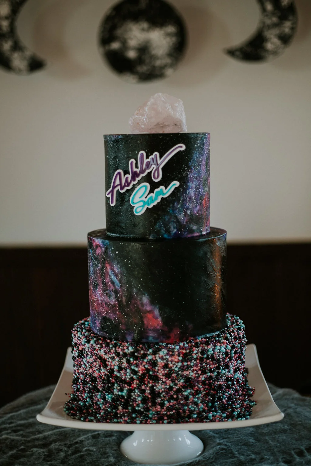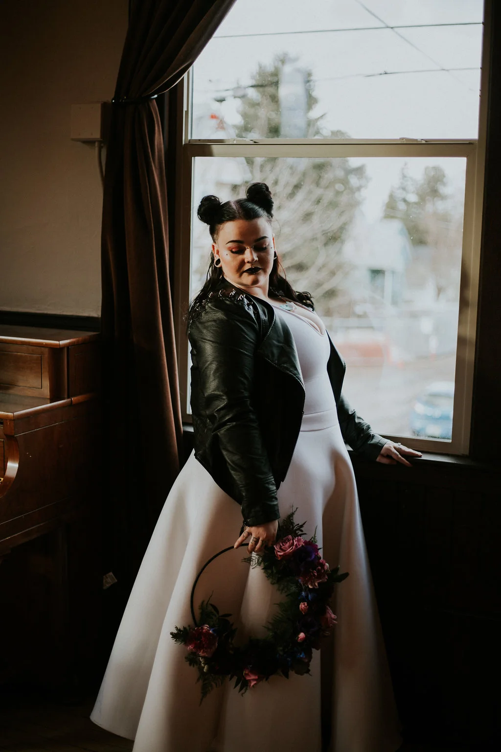 We are excited to partner with a magazine that disrupts the patriarchal capitalist wedding industry in favor of incredible and meaningful weddings that foster intimate moments of connection and equity. Blush and eggshell weddings are lovely, but we loved getting out of the box as we curated an eclectic goth-glam wedding shoot with pops of 90s flare. In the Catalyst spirit, our styled shoot featured curvy LGBTQ love, and our design featured a fresh and clean concept with out-of-the-box details. We mixed moody with bright, intimacy with celebration. It was a blast to break out of the usual wedding industry whitewashed copy-of-a-copy funk and do something entirely different. In partnership with Catalyst, we loved creating a funky alternative styled shoot that celebrates all bodies and all love! Drawing on the cultural heritages of each of our vendors, this celestial yet earthy lesbian wedding included beautiful, creative details—animal skulls painted by a local Native American artist, hand-painted feminist art adorning the refined yet funky lounge area, a moon phase backdrop, an intimate and spiritual wedding ceremony, and a rad glitter hair part, to name a few.