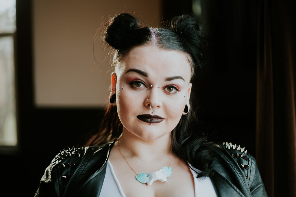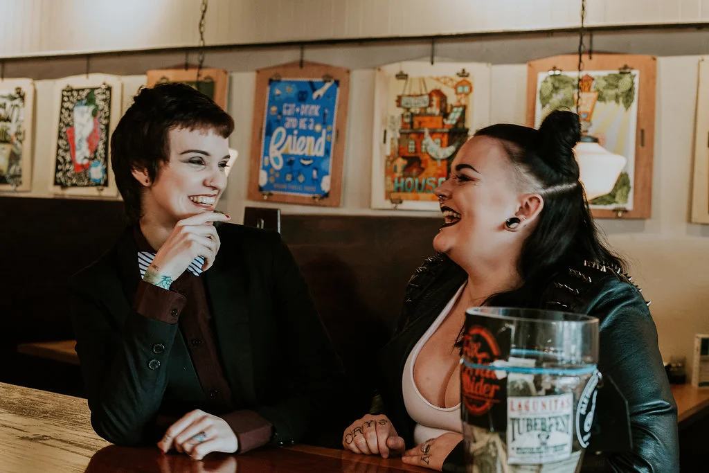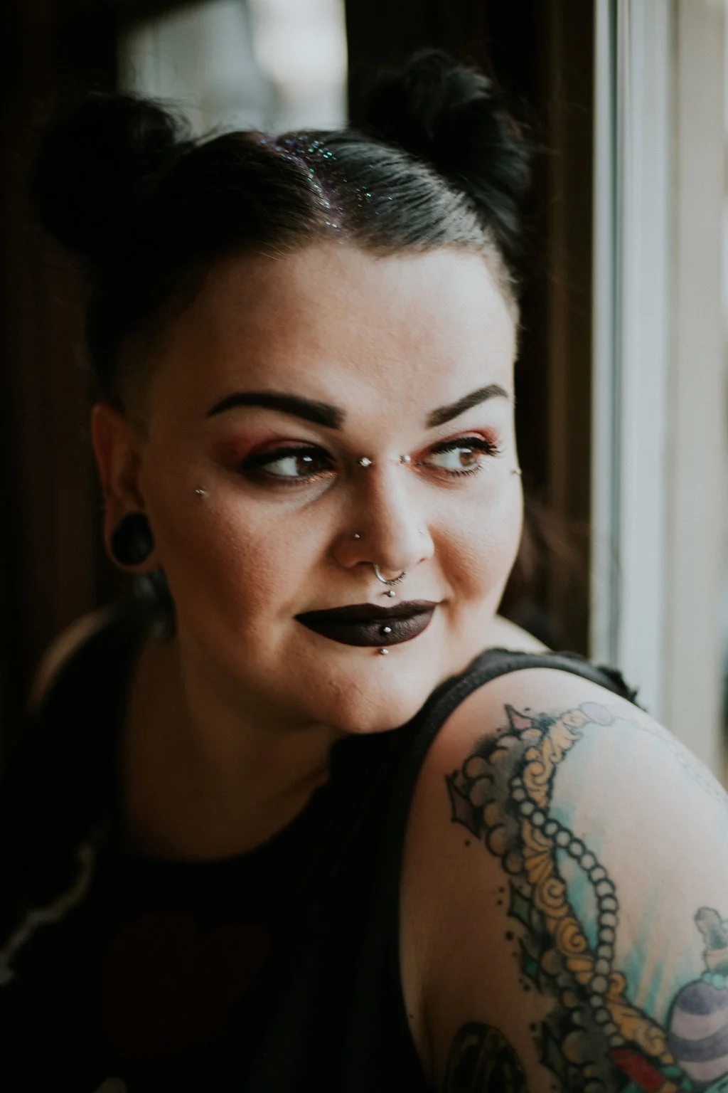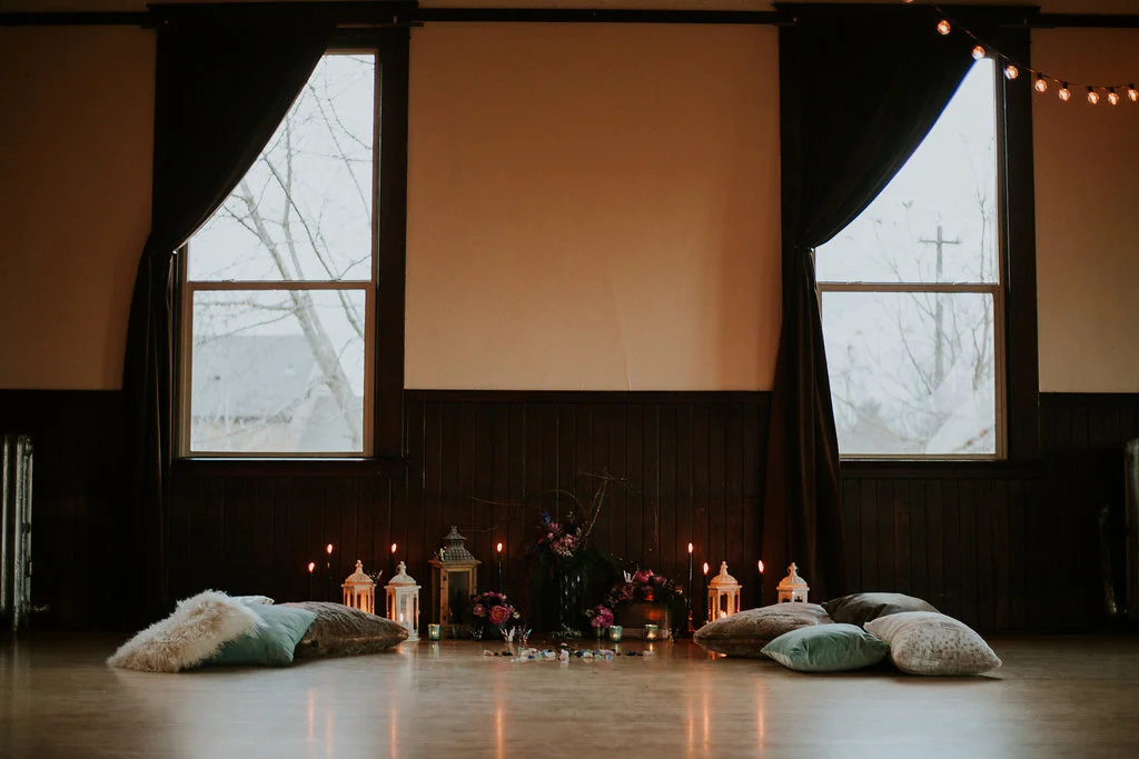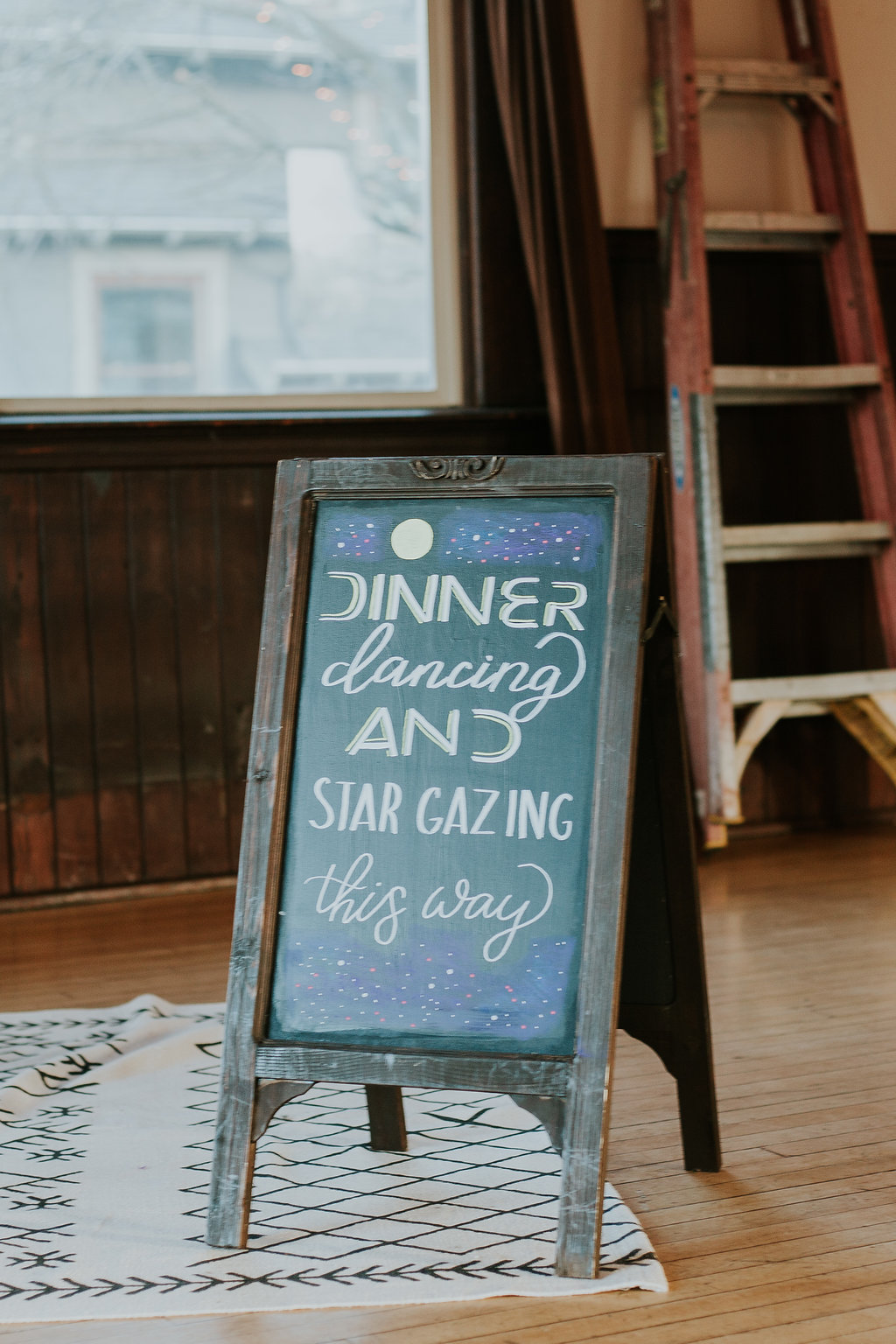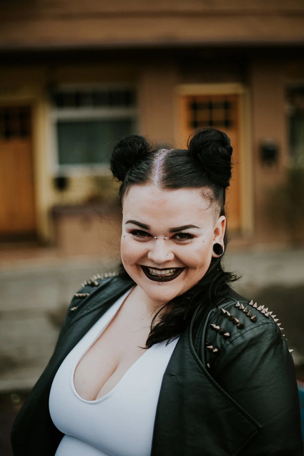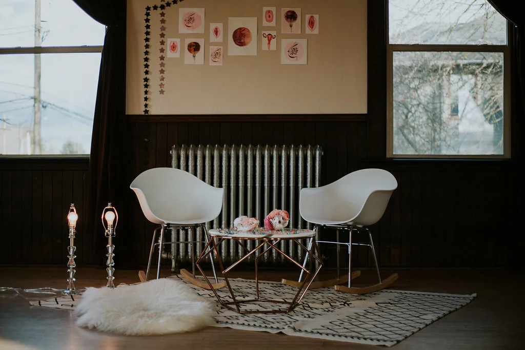 We are excited to partner with a magazine that disrupts the patriarchal capitalist wedding industry in favor of incredible and meaningful weddings that foster intimate moments of connection and equity. Blush and eggshell weddings are lovely, but we loved getting out of the box as we curated an eclectic goth-glam wedding shoot with pops of 90s flare. In the Catalyst spirit, our styled shoot featured curvy LGBTQ love, and our design featured a fresh and clean concept with out-of-the-box details. We mixed moody with bright, intimacy with celebration. It was a blast to break out of the usual wedding industry whitewashed copy-of-a-copy funk and do something entirely different. In partnership with Catalyst, we loved creating a funky alternative styled shoot that celebrates all bodies and all love! Drawing on the cultural heritages of each of our vendors, this celestial yet earthy lesbian wedding included beautiful, creative details—animal skulls painted by a local Native American artist, hand-painted feminist art adorning the refined yet funky lounge area, a moon phase backdrop, an intimate and spiritual wedding ceremony, and a rad glitter hair part, to name a few.