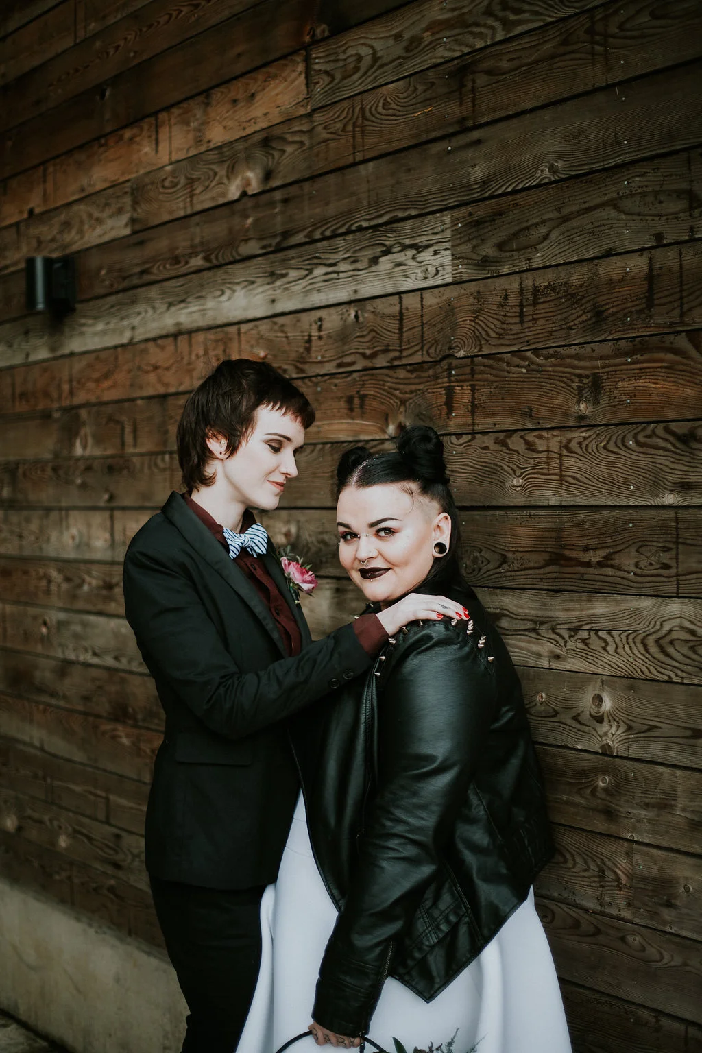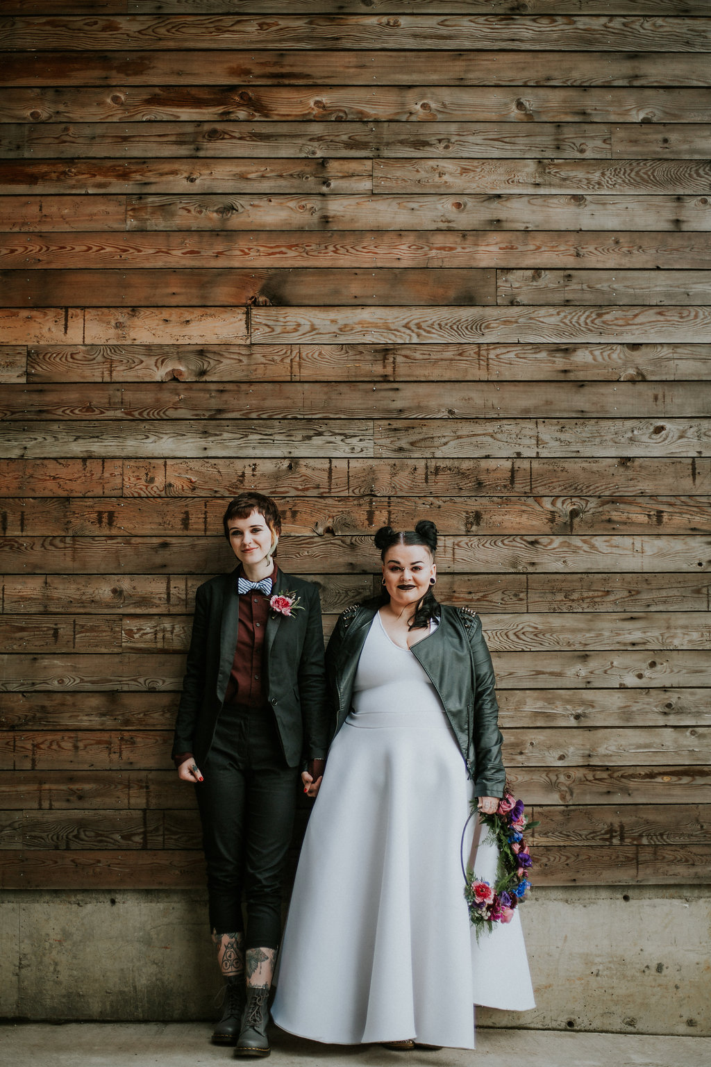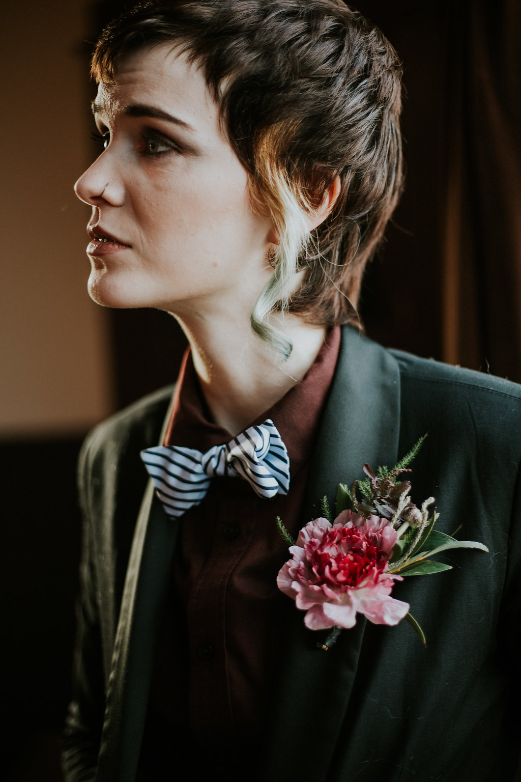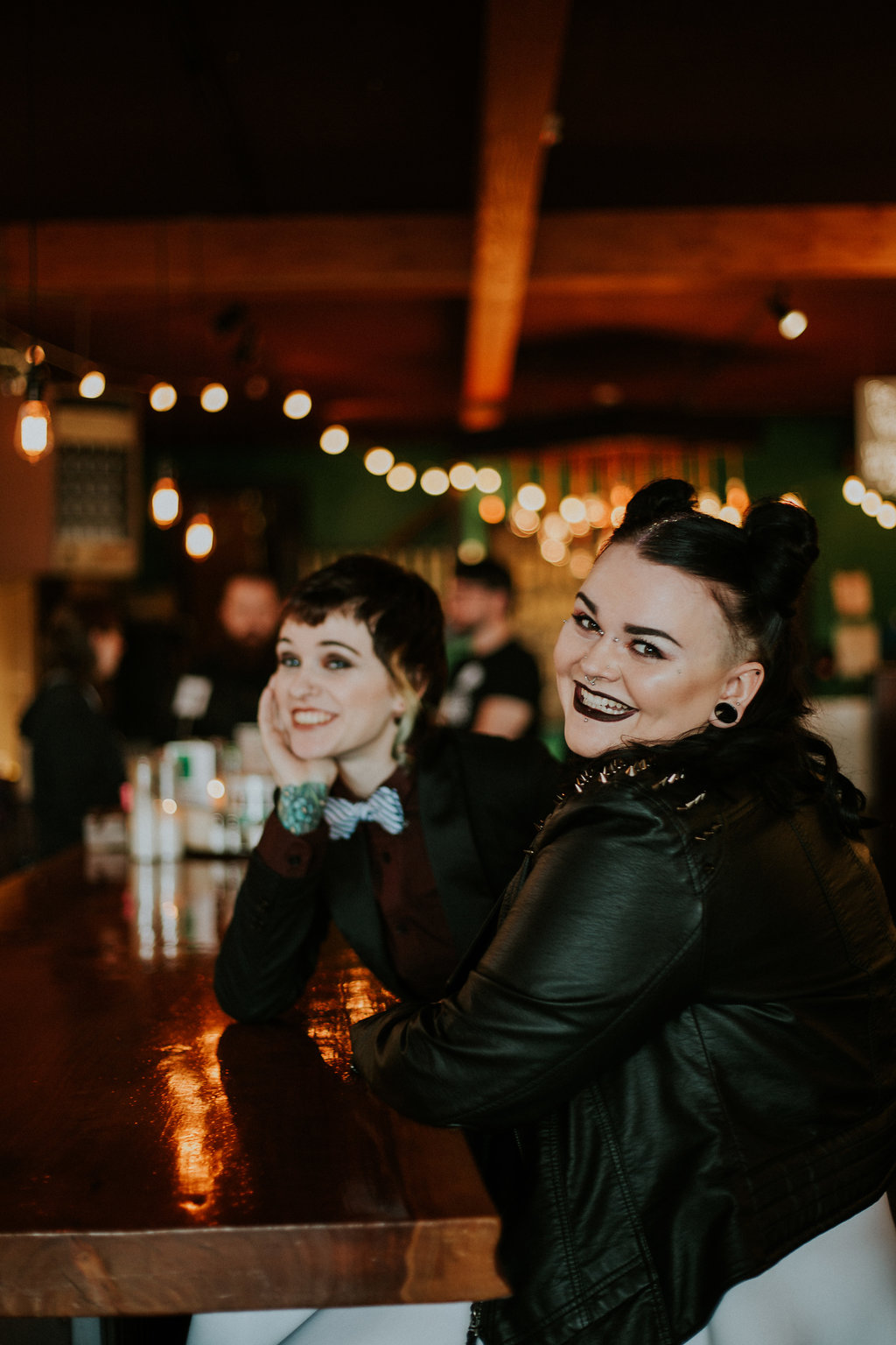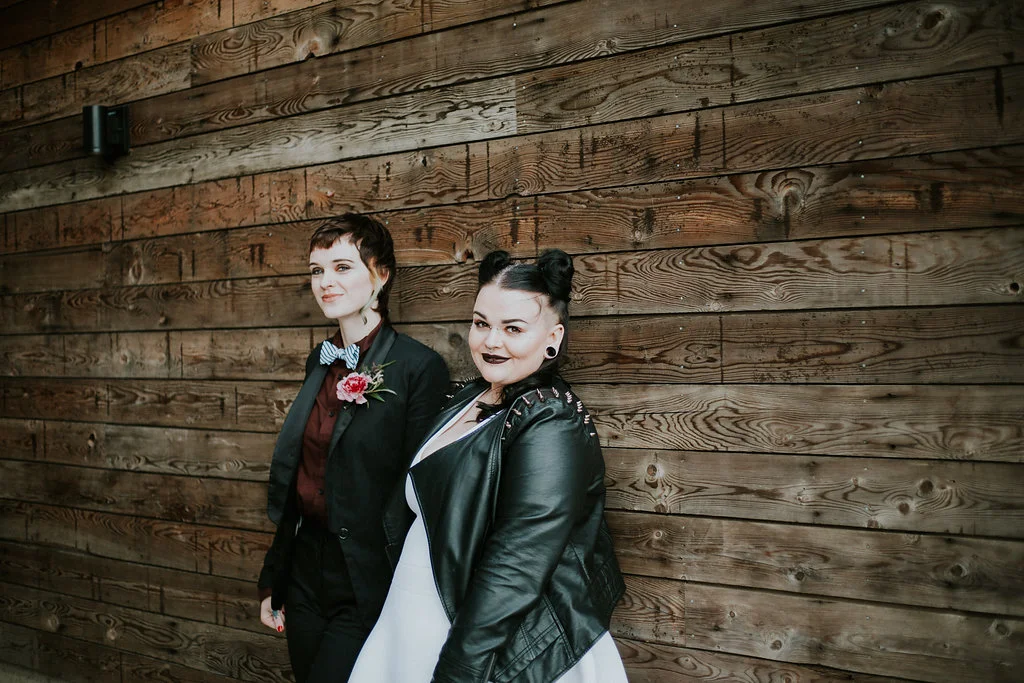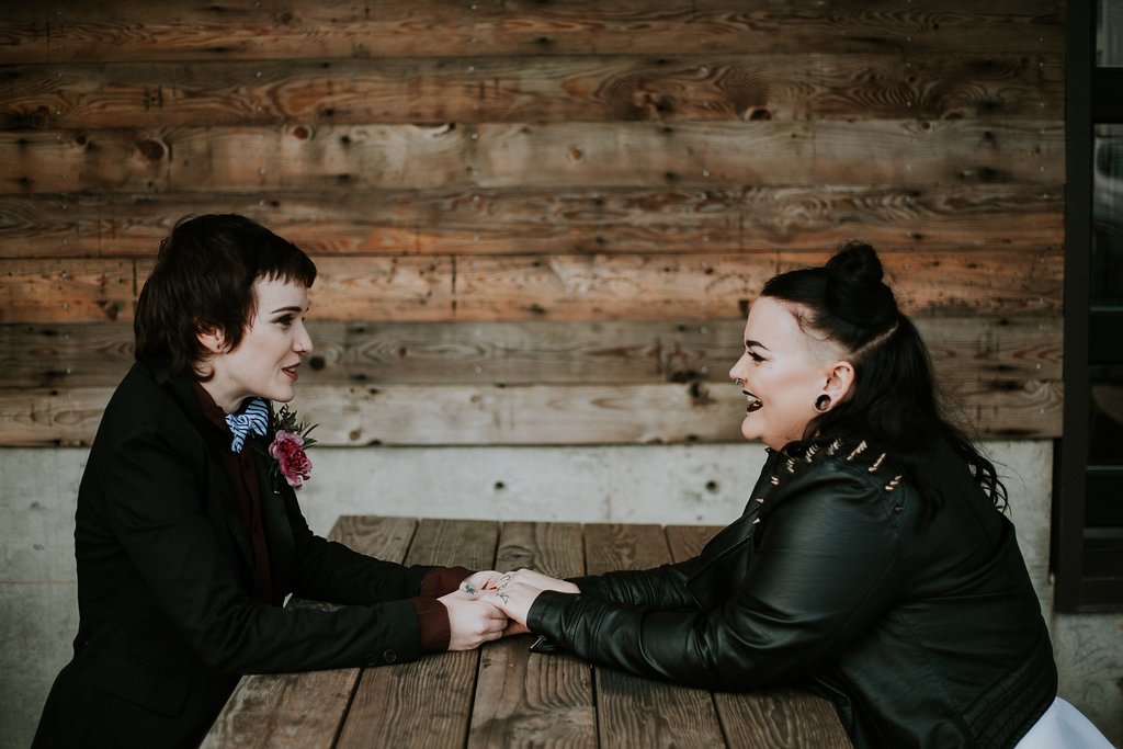 Each of our team members is passionate about representing every type of body and every type of love in our visual media. Our models are both tattooed chicks with alternative vibes. One of our lady models is a curvy model with a bangin’ booty, and the other rocks a pixie cut and an incredible chest piece. There are not nearly enough incredible lesbian wedding shoots in the blogosphere—or even on each of our websites. We loved creating relevant visual content that is exciting and fresh for our LGBTQ clients.