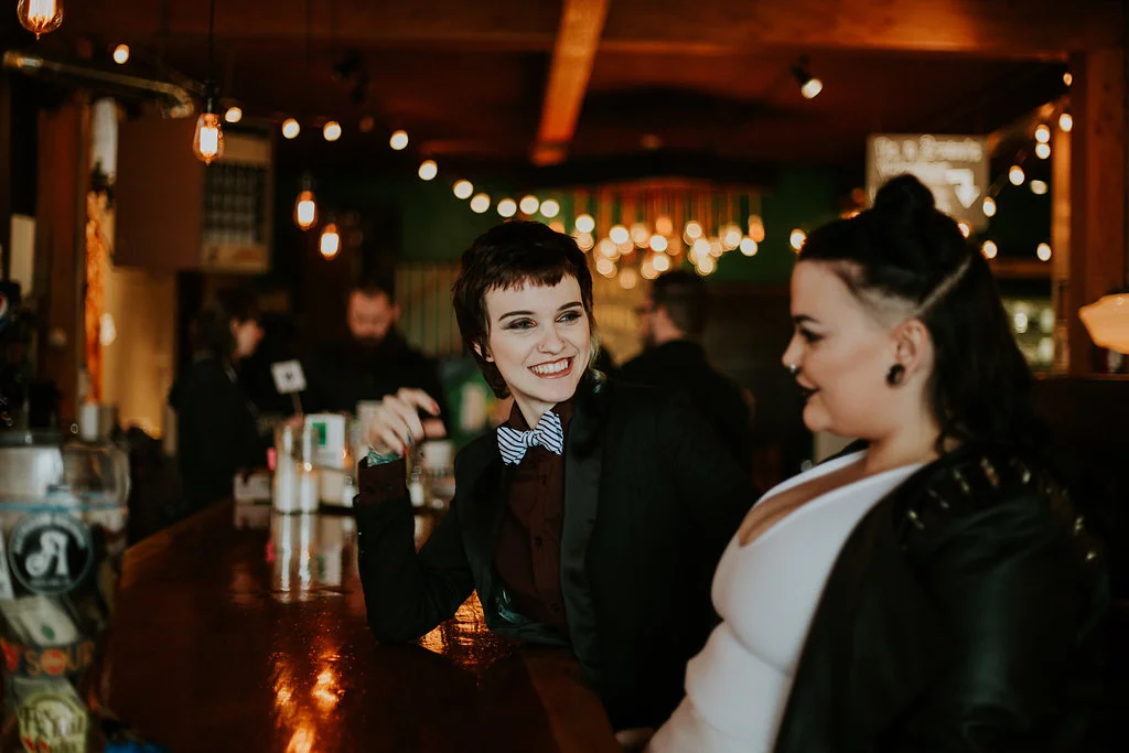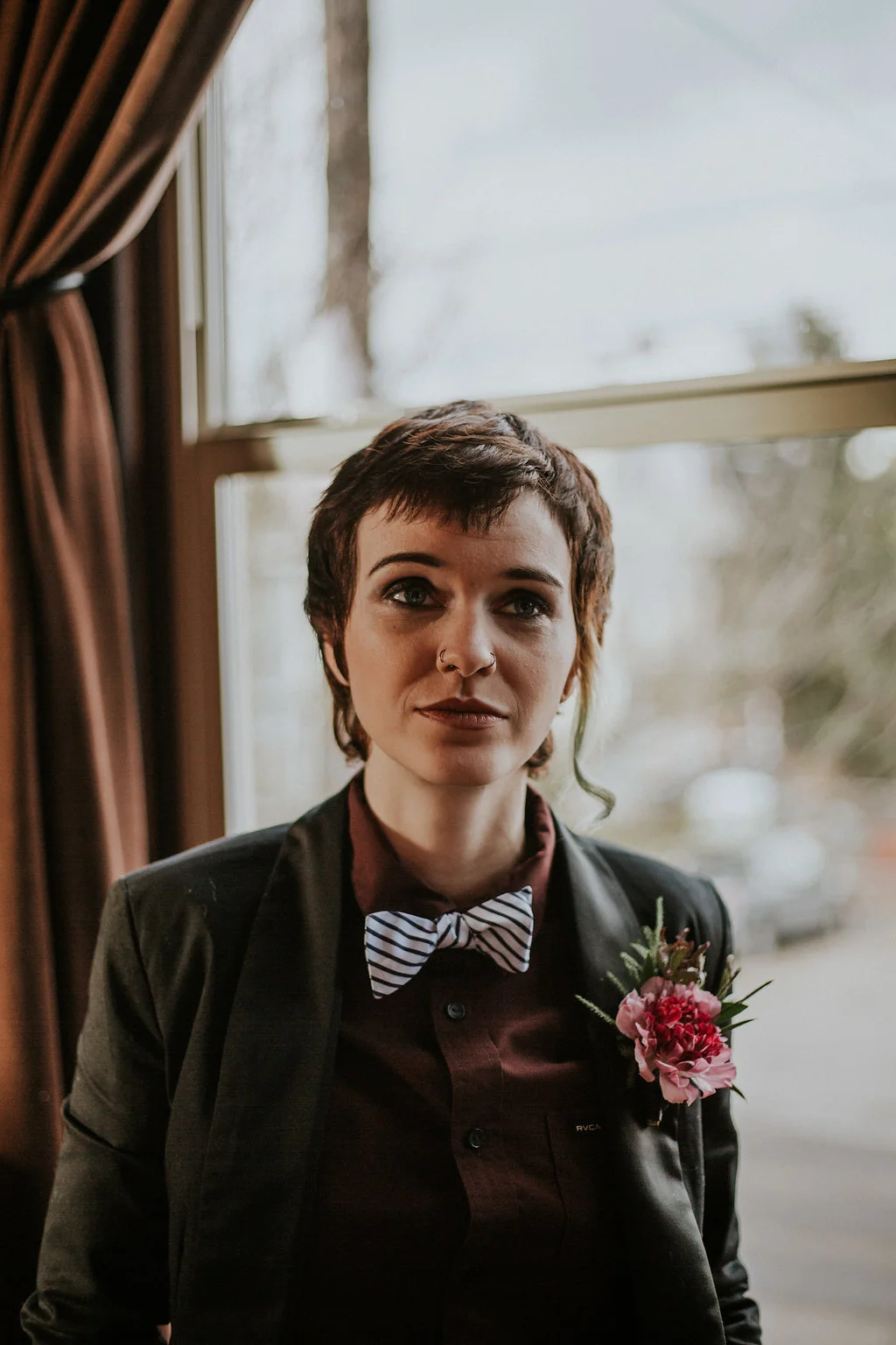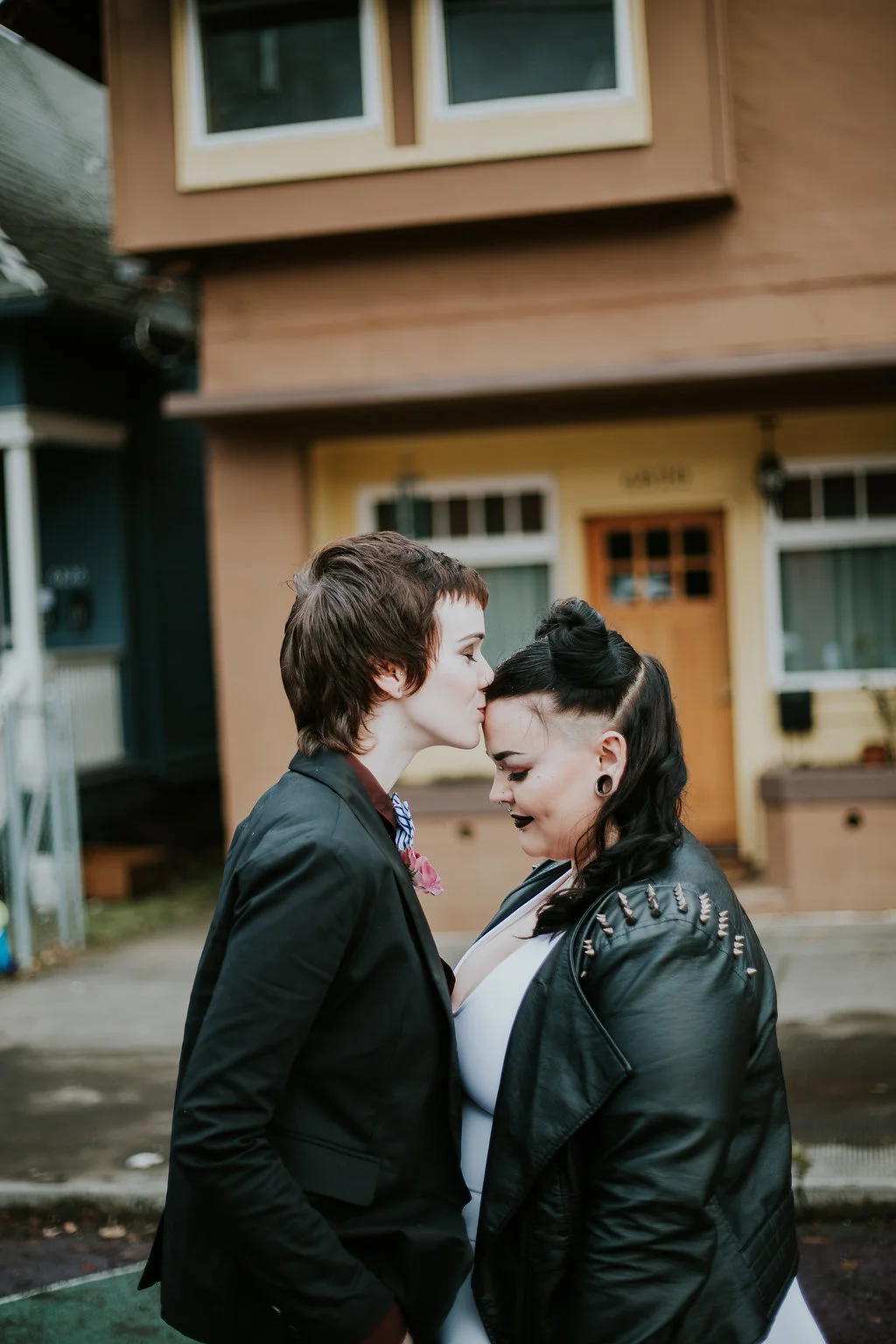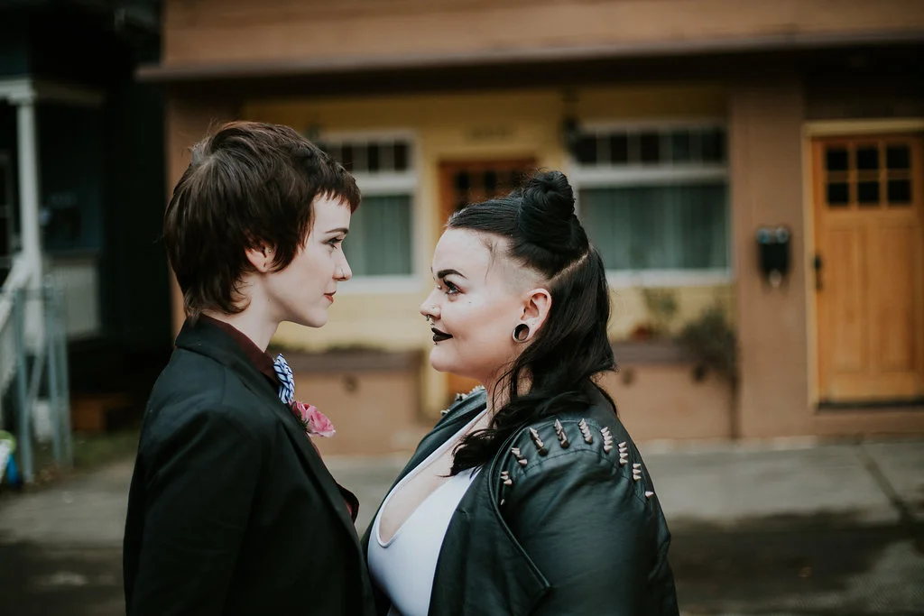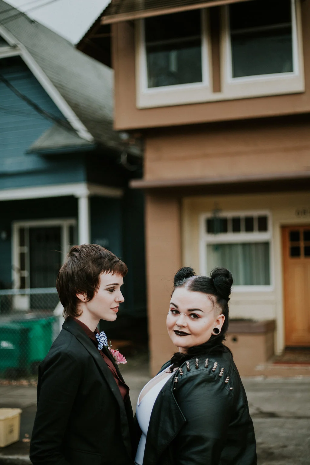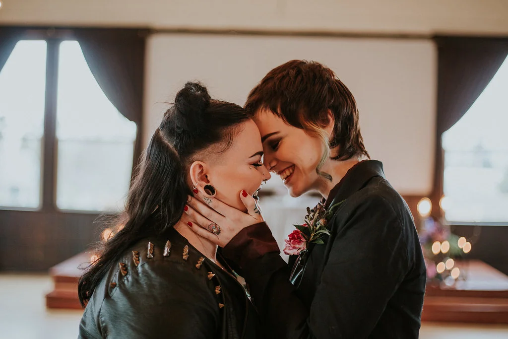 Each of our team members is passionate about representing every type of body and every type of love in our visual media. Our models are both tattooed chicks with alternative vibes. One of our lady models is a curvy model with a bangin’ booty, and the other rocks a pixie cut and an incredible chest piece. There are not nearly enough incredible lesbian wedding shoots in the blogosphere—or even on each of our websites. We loved creating relevant visual content that is exciting and fresh for our LGBTQ clients.