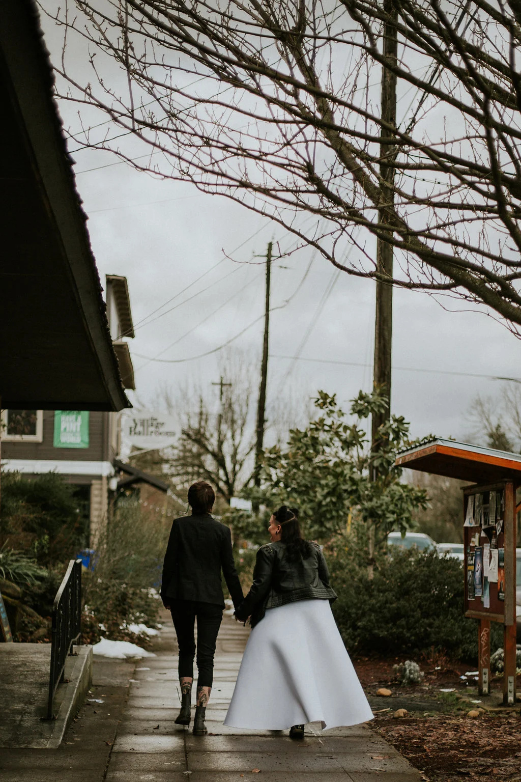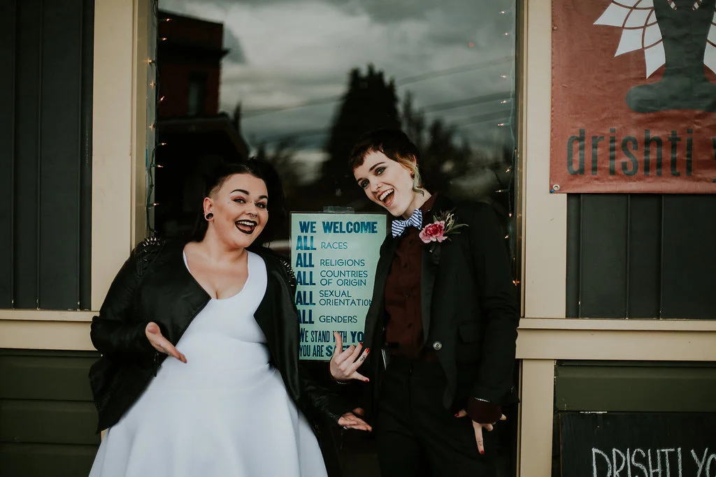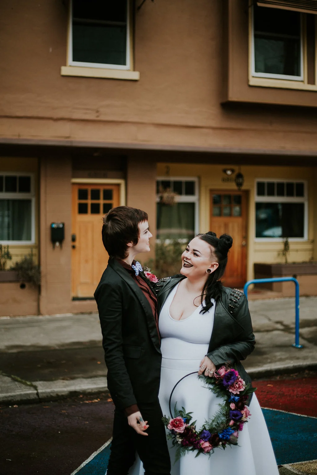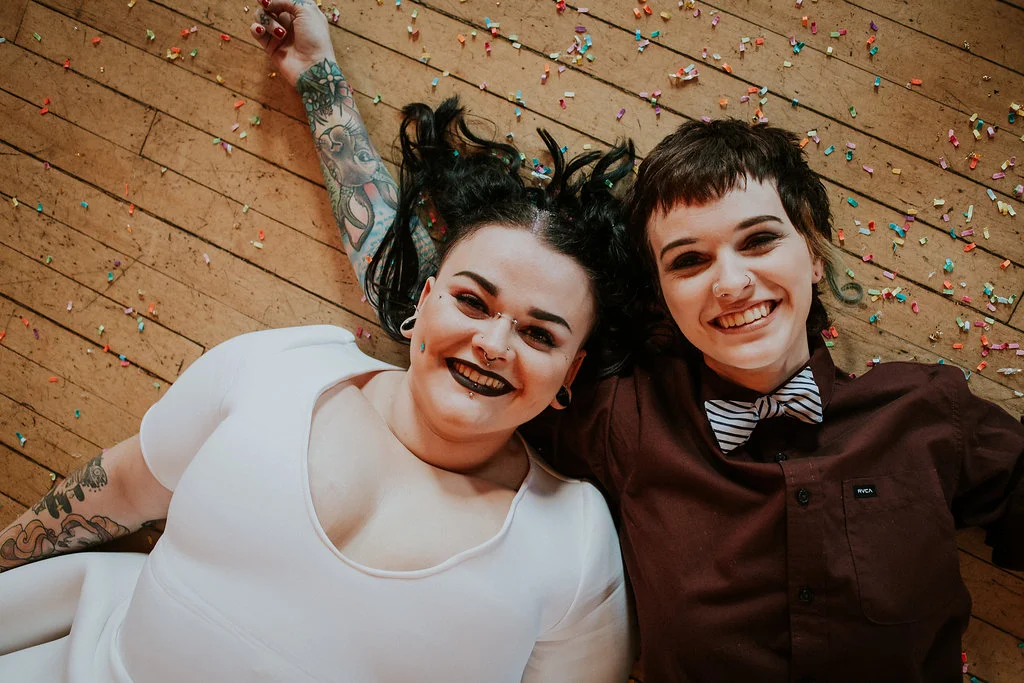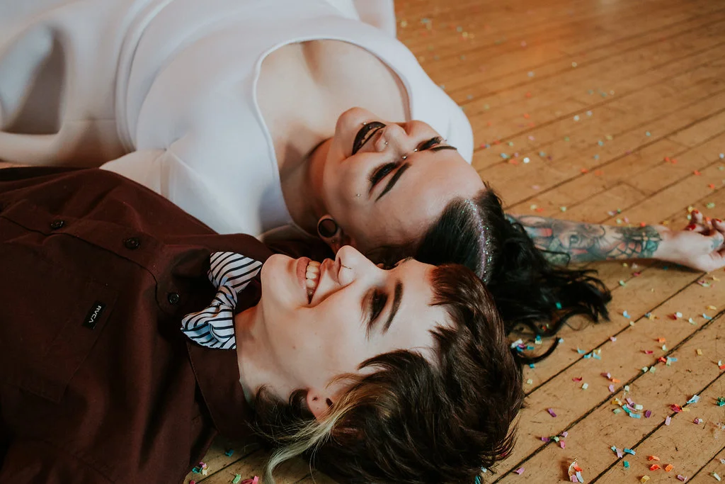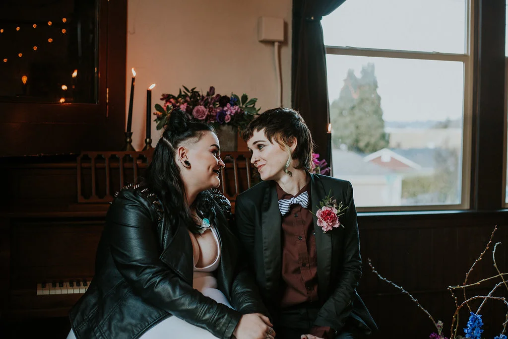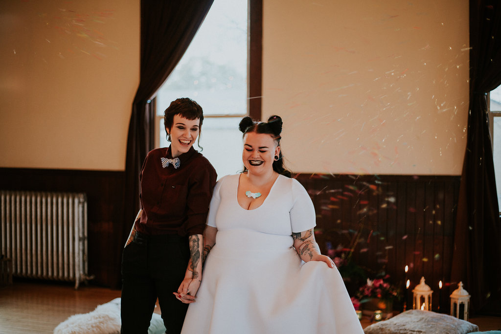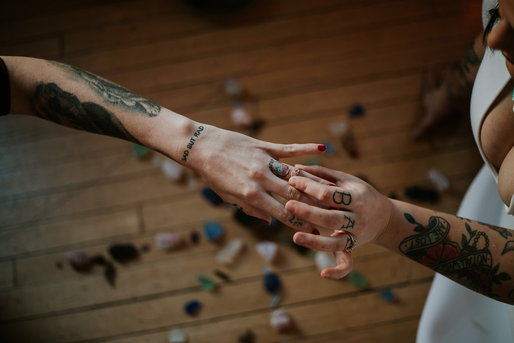 Each of our team members is passionate about representing every type of body and every type of love in our visual media. Our models are both tattooed chicks with alternative vibes. One of our lady models is a curvy model with a bangin’ booty, and the other rocks a pixie cut and an incredible chest piece. There are not nearly enough incredible lesbian wedding shoots in the blogosphere—or even on each of our websites. We loved creating relevant visual content that is exciting and fresh for our LGBTQ clients.