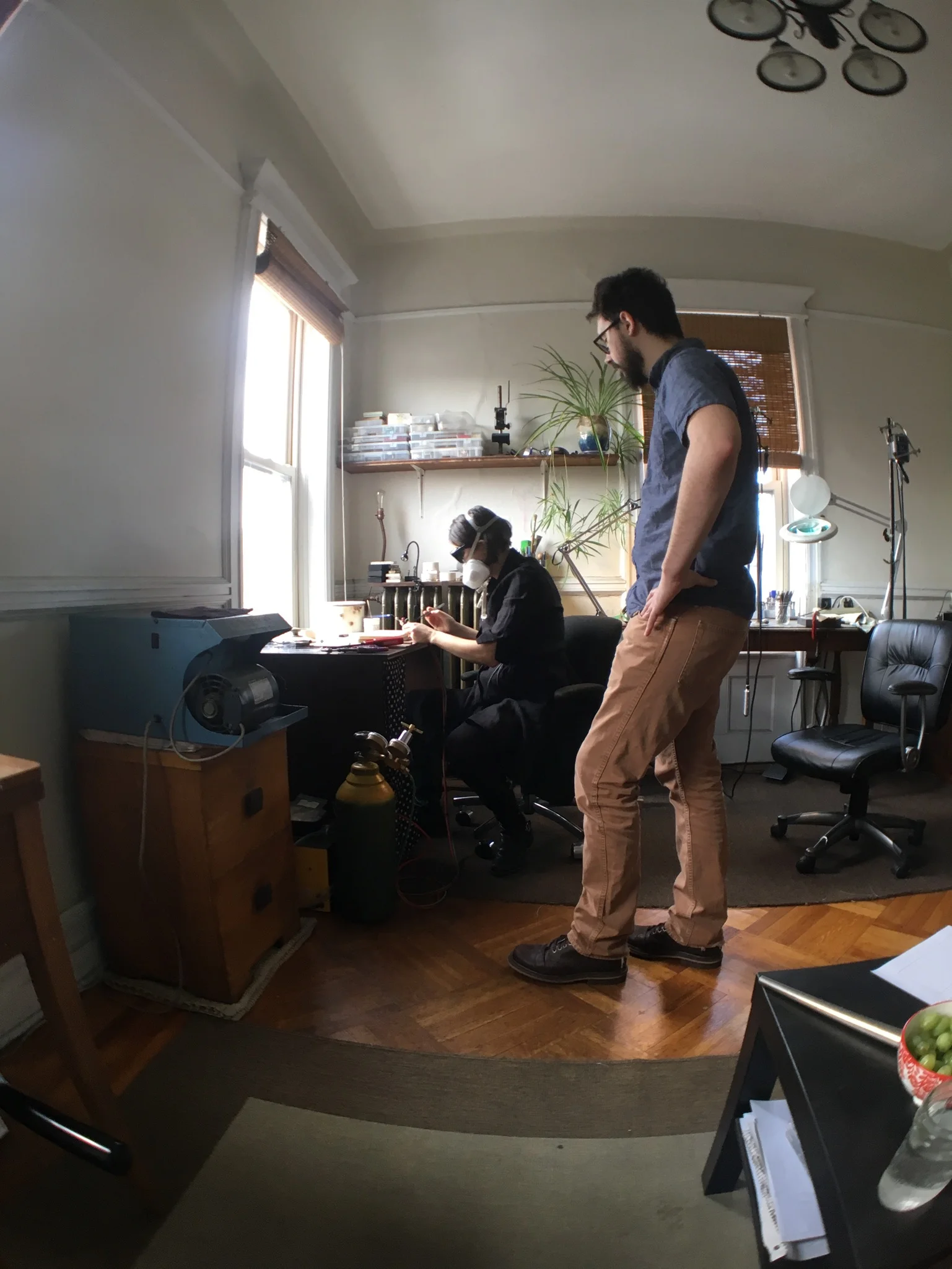 “Good to know!” I chuckled a bit awkwardly. I’m never great at meeting new people. We fumbled through introductions (her name was Andrea) while removing hats and gloves before she led us upstairs to a lovely apartment. We walked down the hall and found ourselves in what was probably once a spare bedroom, but had since been converted into a jewelry workshop.