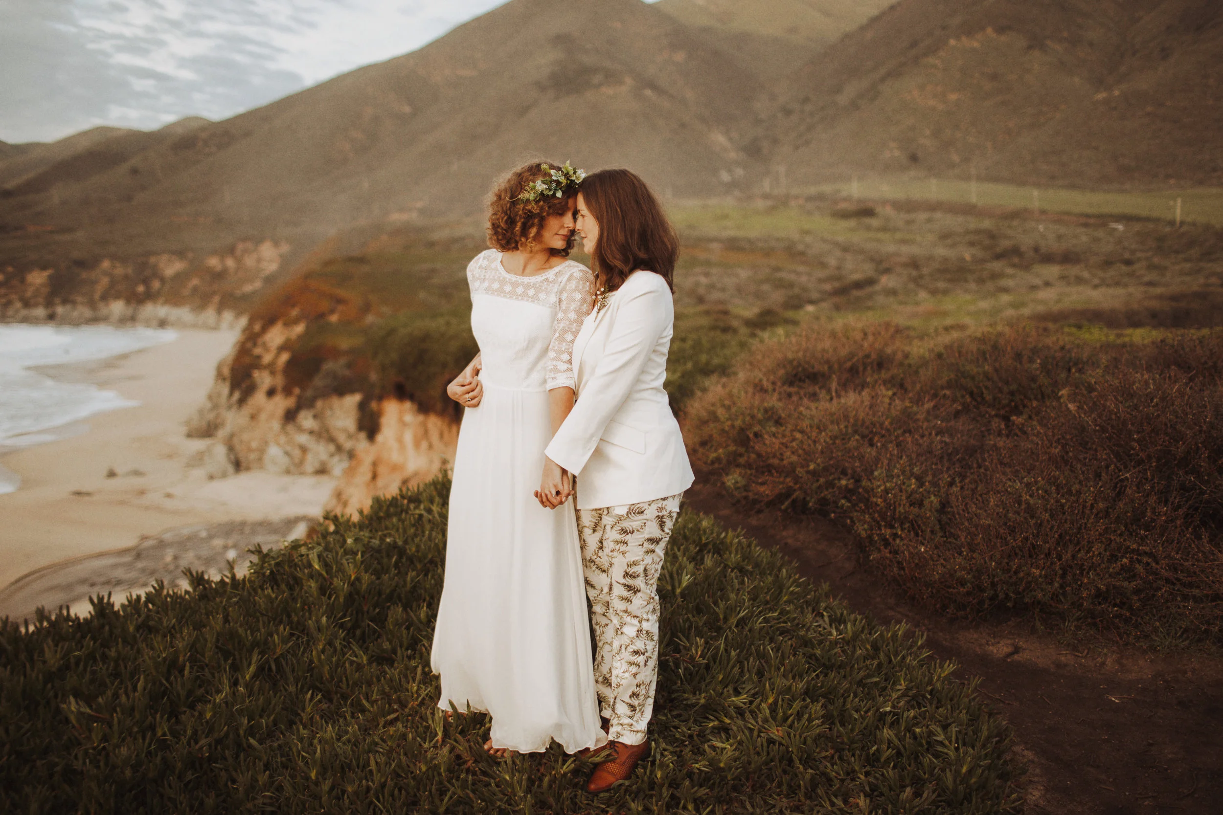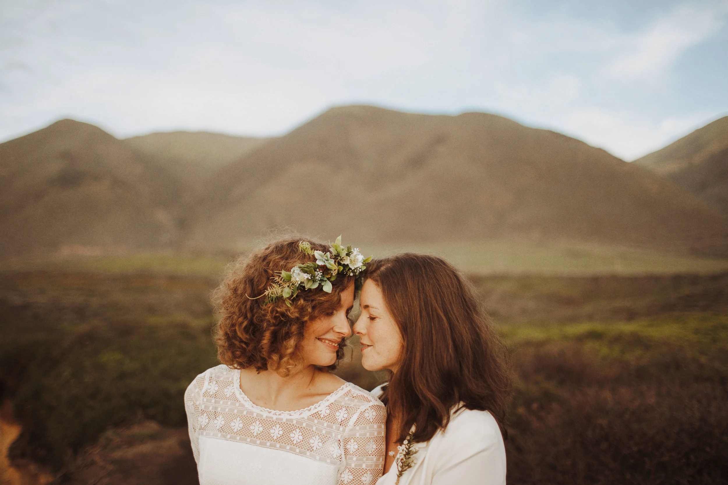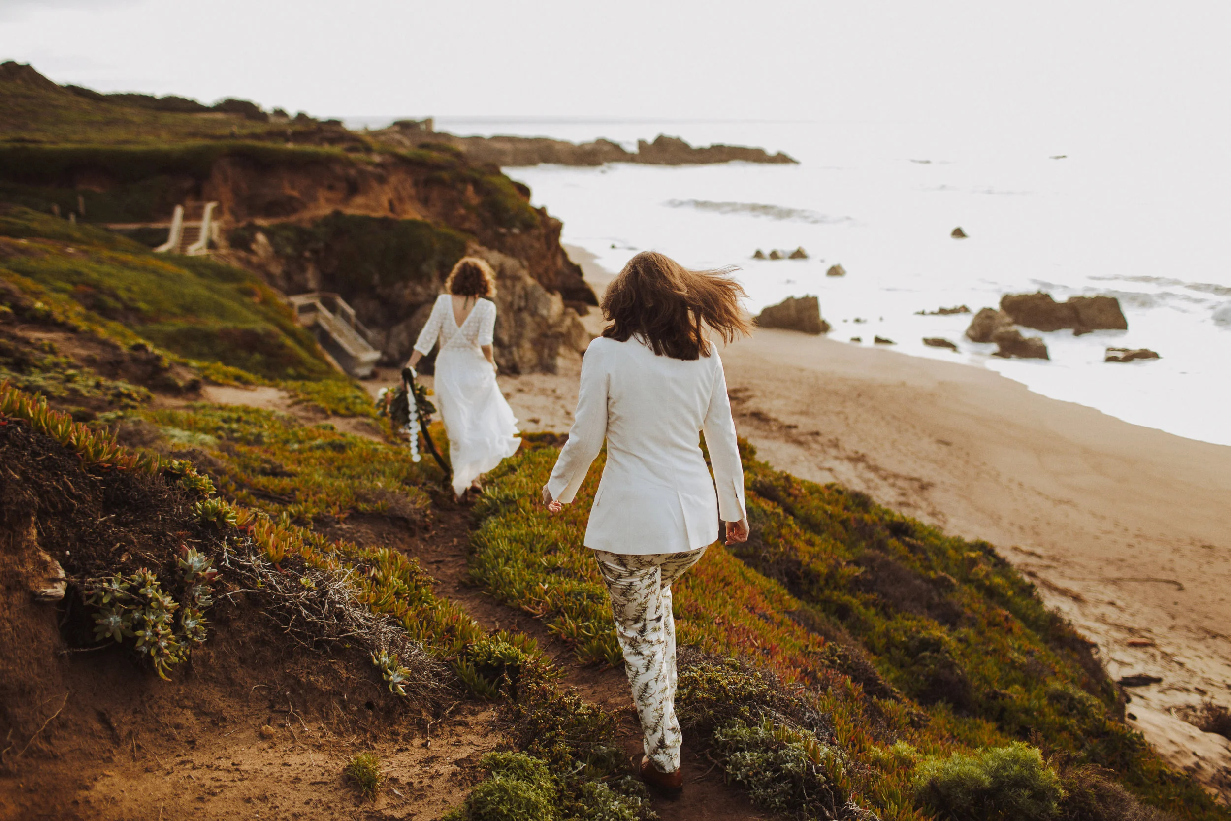 /This wedding between two incredibly talented Irish photographers on a cliff in Carmel was fairly unplanned in that they were married the day before they intended, in a city they didn’t plan, on a cliff they hadn’t seen before, but in the end it was perfect. Their home in Northern Ireland is the only place in the UK and Ireland that doesn’t have marriage equality, so they’d been planning their Big Sur ceremony so they could get married somewhere beautiful—to finally have a piece of paper that said they married. But the week of their ceremony, the storms had been brewing in Big Sur and didn’t seem like they weren’t letting up. Warnings of weakened bridges to Big Sur, the intended wedding destination, and pictures of washed away cliffs filled my inbox as I drove from the airport to Carmel-by-the-Sea. Karolyn and Jess realized that I was there an extra day, the one day it was expected to not rain, so they decided Carmel would be the place they would get married. They were married with the sun shining down on them, hands clasped together, over the rushing sounds of waves, while greenery was hanging off cliffs for as far as the eye could see. And this is the story of how they were finally married.