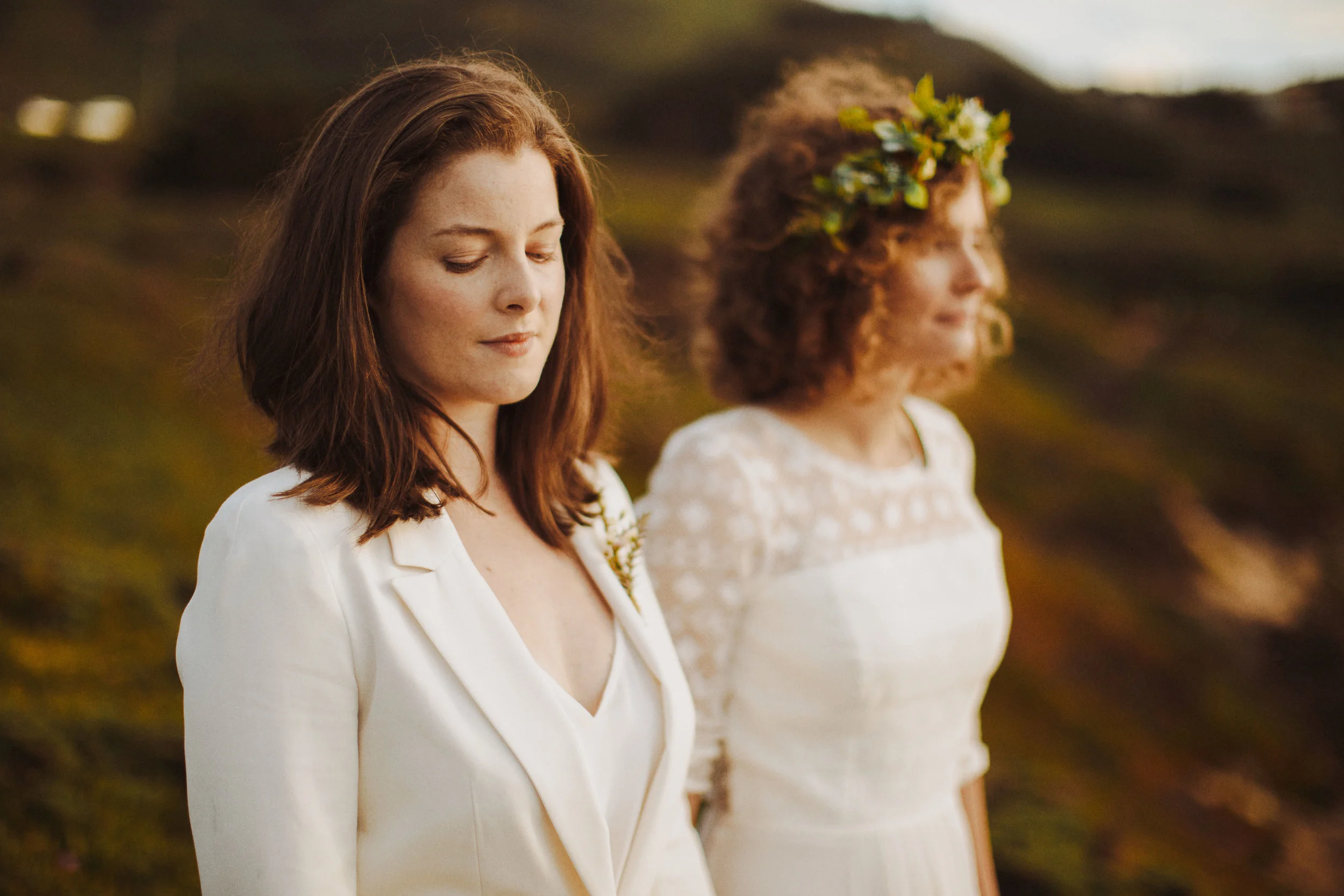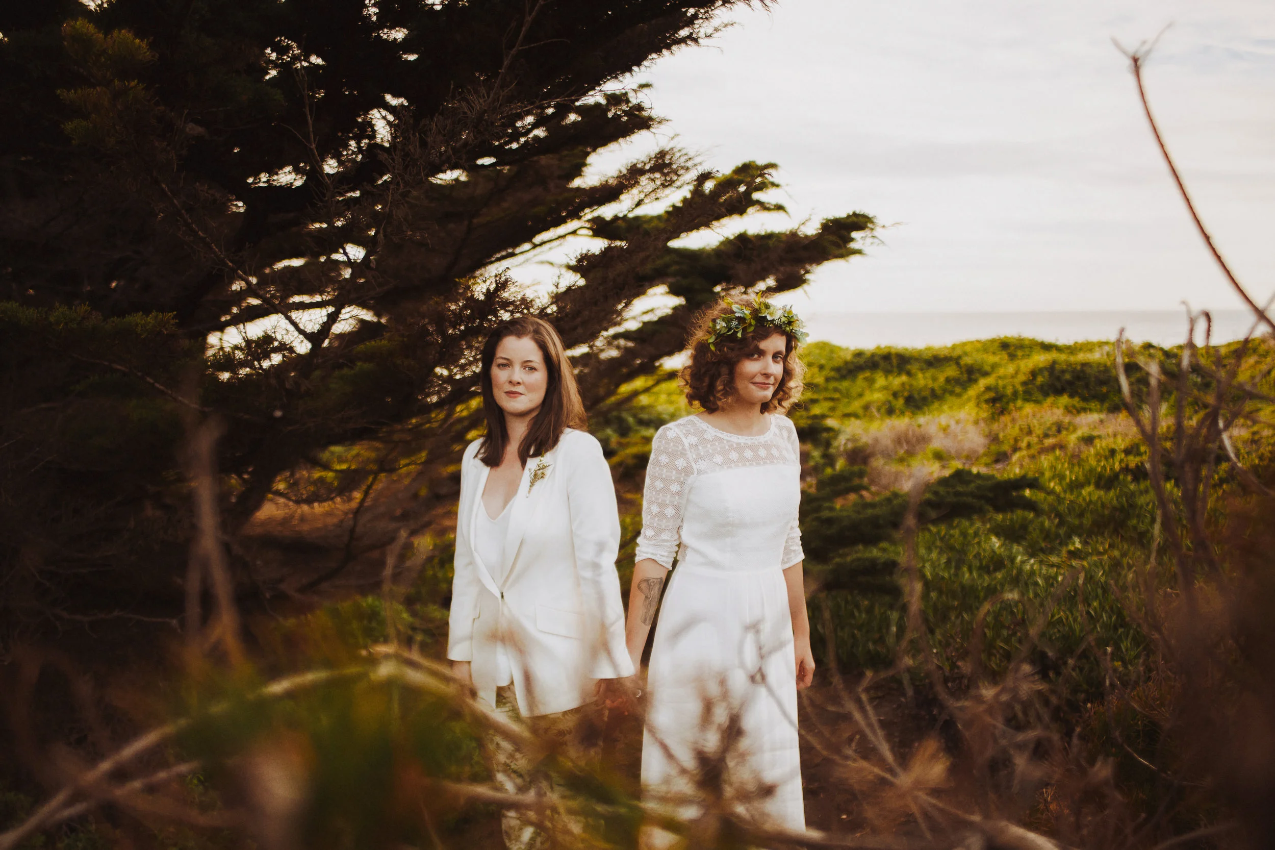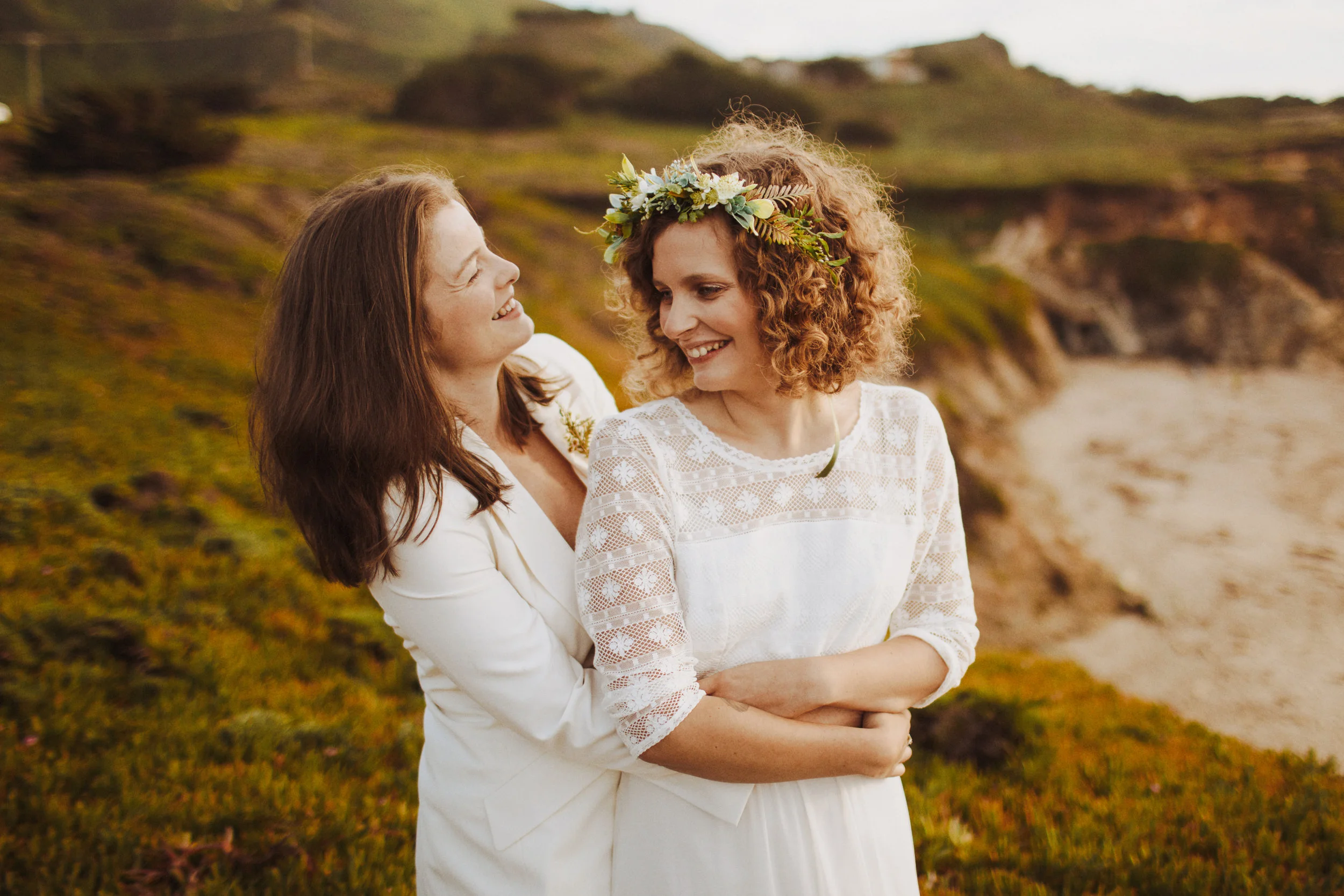 /This wedding between two incredibly talented Irish photographers on a cliff in Carmel was fairly unplanned in that they were married the day before they intended, in a city they didn’t plan, on a cliff they hadn’t seen before, but in the end it was perfect. Their home in Northern Ireland is the only place in the UK and Ireland that doesn’t have marriage equality, so they’d been planning their Big Sur ceremony so they could get married somewhere beautiful—to finally have a piece of paper that said they married. But the week of their ceremony, the storms had been brewing in Big Sur and didn’t seem like they weren’t letting up. Warnings of weakened bridges to Big Sur, the intended wedding destination, and pictures of washed away cliffs filled my inbox as I drove from the airport to Carmel-by-the-Sea. Karolyn and Jess realized that I was there an extra day, the one day it was expected to not rain, so they decided Carmel would be the place they would get married. They were married with the sun shining down on them, hands clasped together, over the rushing sounds of waves, while greenery was hanging off cliffs for as far as the eye could see. And this is the story of how they were finally married.