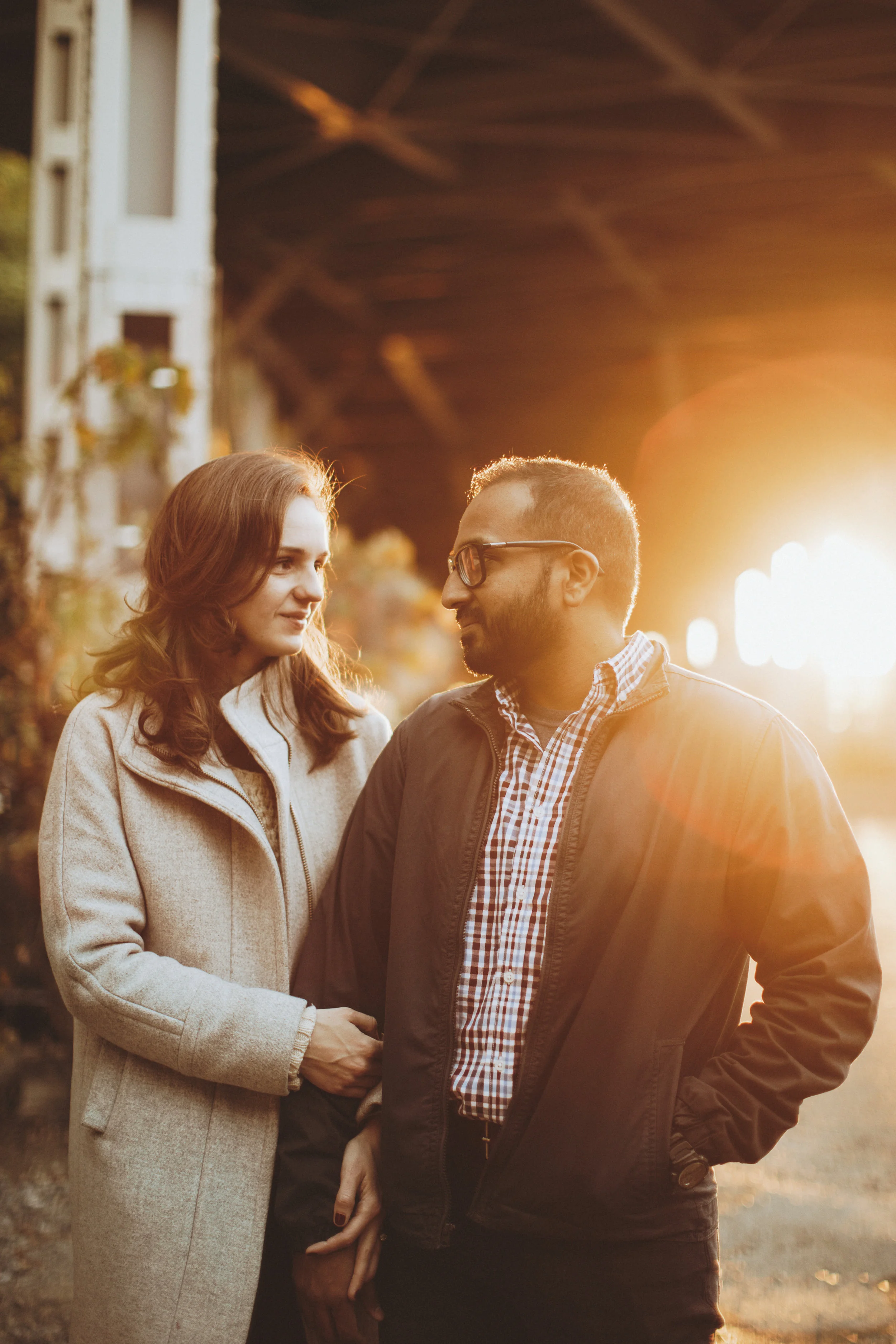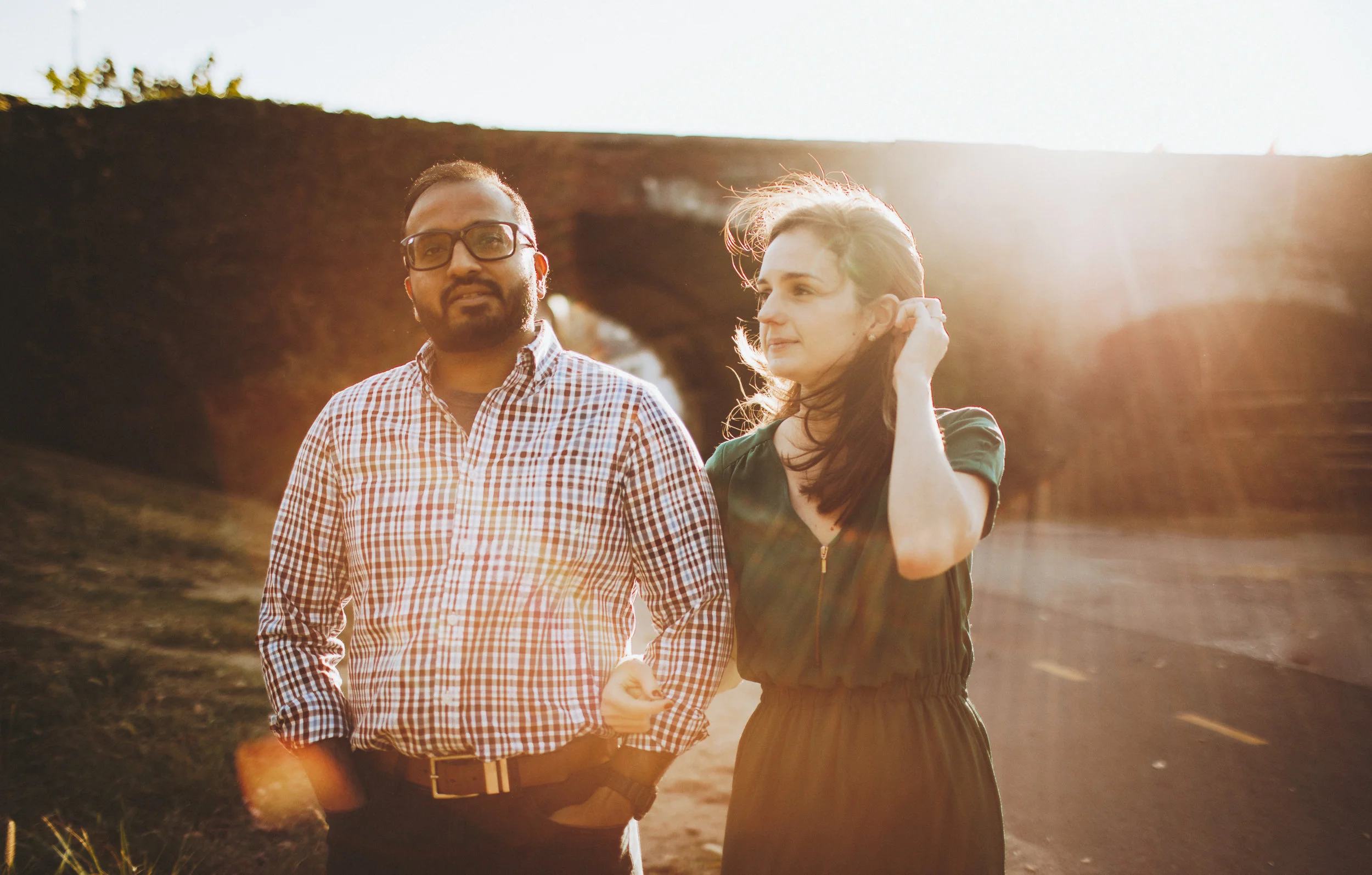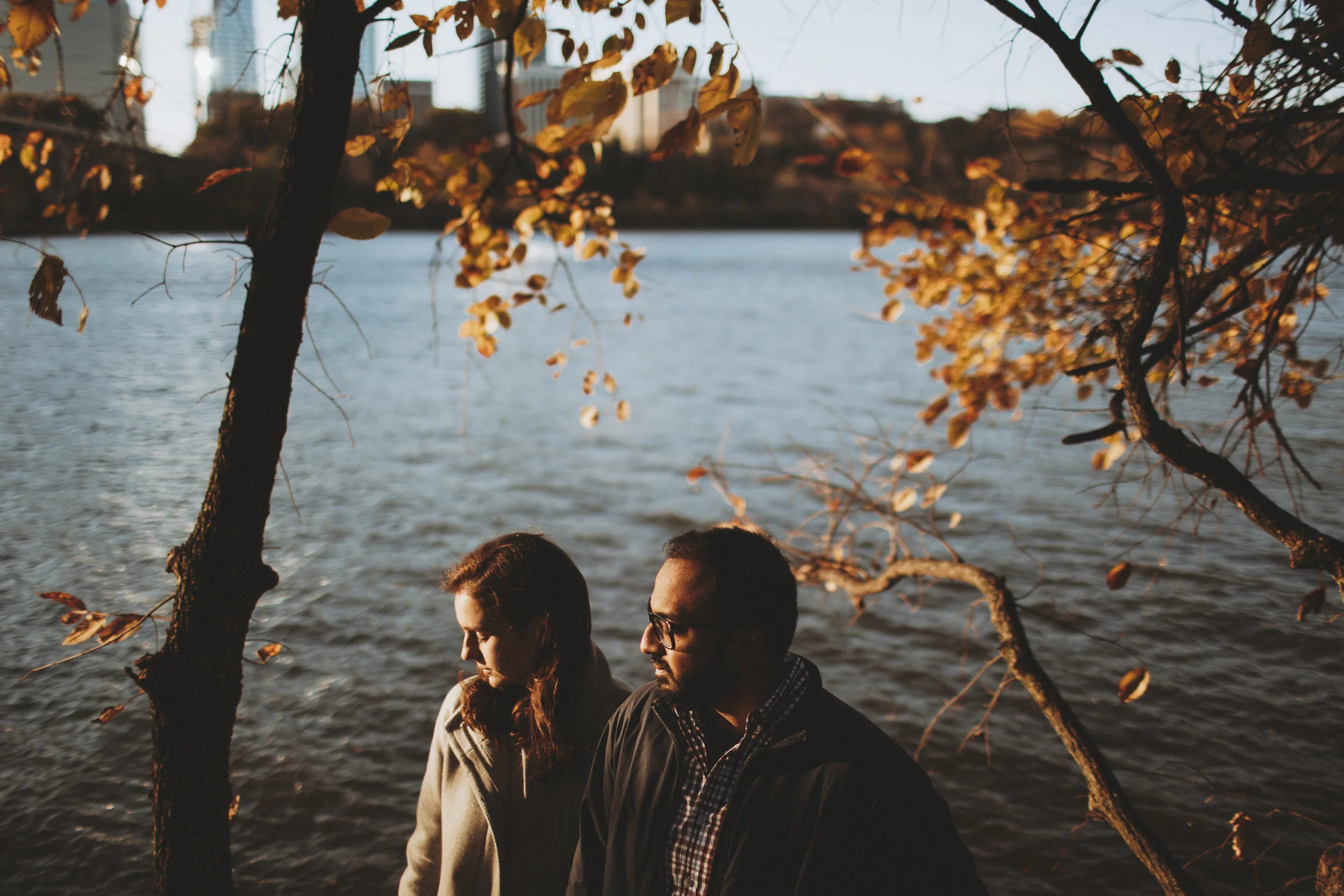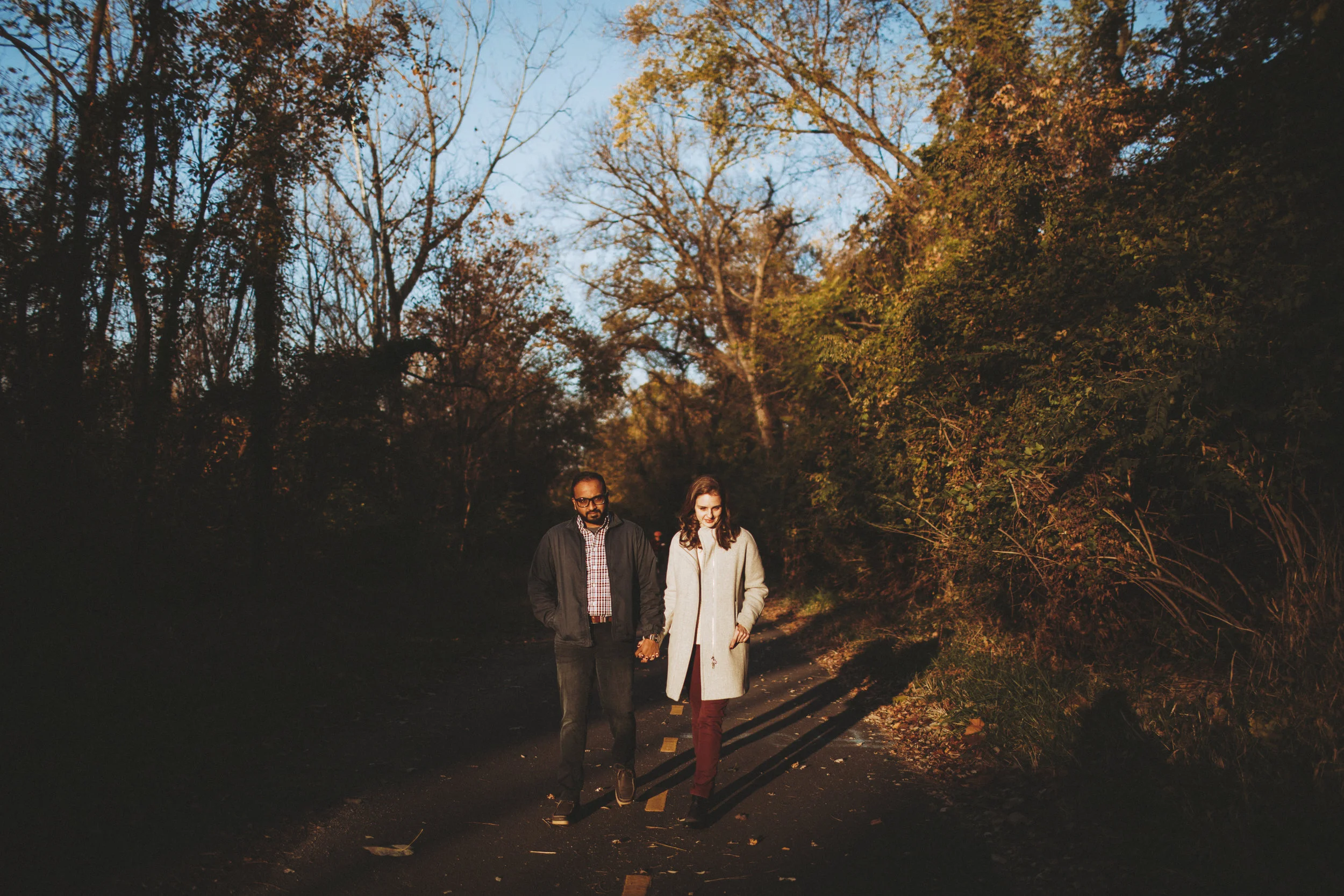 /Varun and Amanda met up with me early in the morning on a weekday, on a day when the world was still too cool in the morning to not wear coats, but it warmed up quickly. They told me they met getting their MBAs and joked that their hands brushed while using excel, and the rest was history. We traipsed through the tiny bit of forest we found near the water in Georgetown, DC, as we discussed all things Wes Anderson, and Amanda talk about how Varun has taught her a lot about South Indian food and culture. We ended the session just as most coffee shops were opening and as the sun started to warm the city.