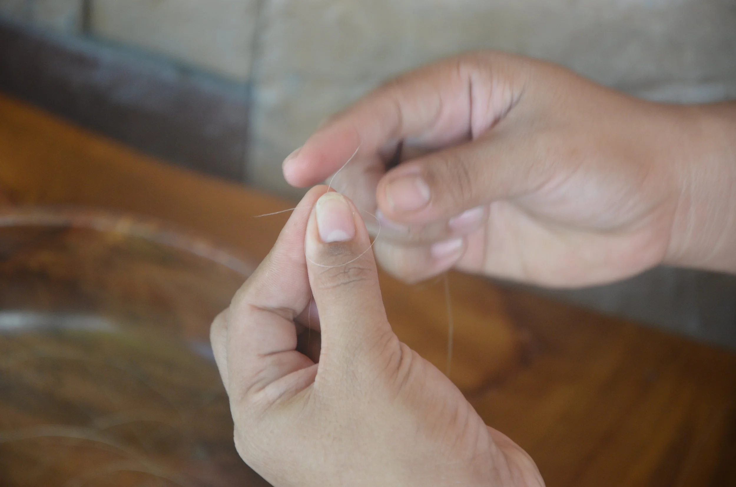 She explains, “A pineapple plant bears a single pineapple fruit each harvest season. And in normal practices, it is typical that some farmers would discard the leaves of the pineapple plant after each harvest. We give the leaves new life and purpose — to cultivate beauty through great design. The fiber of the pineapple is scraped from each and every pineapple leaf, and the ‘liniwan’ pineapple fibers are carefully chosen because they are the softest fiber in a pineapple leaf. These fibers are washed in a nearby river and sun-dried. The very fine fibers are then knotted by experienced knotters, and hand-woven by weavers. Our banana fibers are from the abaca plant, which is a non-fruit bearing banana tree. The banana fibers come from the trunk of the banana tree.” The weavers also use mulberry-spun silk, a recycled natural material that is “more refined than other types of silk and known for its durability and luxurious appeal.”