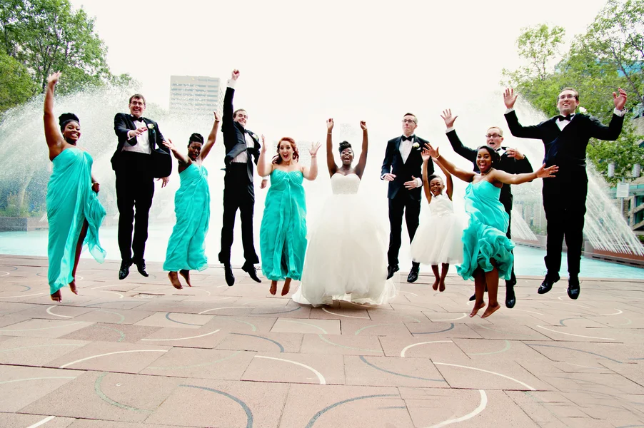 The historic Clinker-Brick Church (sometimes theatre venue) served as a perfect backdrop for the elegant ceremony. It was brought to life by the bright stained glass windows and the energy of the people inside. In perfect juxtaposition to the church, City Hall's modern stone, steel, and glass was used for the wedding party's photo-op.