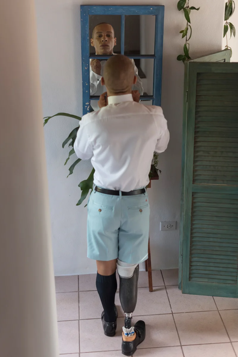 /The stylized shoot was intended to showcase Bermuda's unique wedding style representing several vendors. As the shoot plans progressed, I hired two models to play the roles of bride and groom; they are not a real-life couple. The models are Rachel, a professional local model and entrepreneur, and Ryan, a Para-Olympic hopeful athlete and bartender. I had worked with Rachel before, although I had not yet met Ryan when I asked him to pose for the shoot. After seeing an interview from Bermuda Broadcasting about Ryan’s decision to amputate below the knee after a series of unsuccessful surgeries following a moped accident, I was inspired by his positive approach toward recovery.