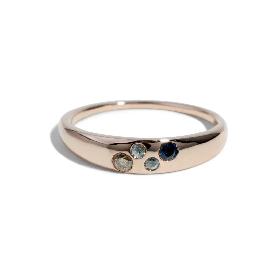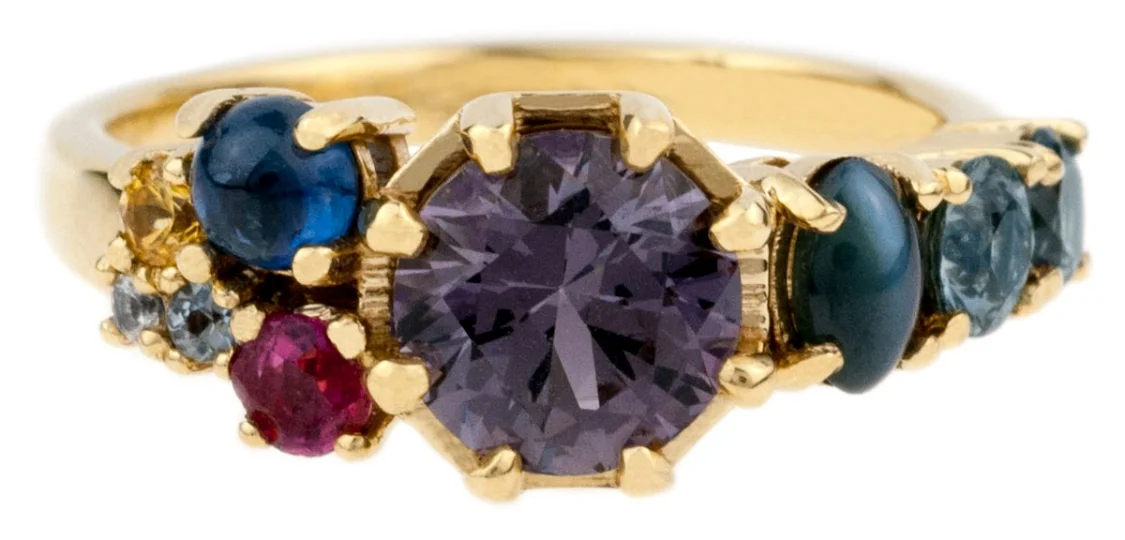 How creative is this? Most of the stones in this ring came from the customer's collection and are a mix of Montana sapphires and heirloom stones collected over the years. Each represents a planet in the solar system: the center stone is Jupiter, the smooth cabochon sapphire is Earth, Mars is a Ruby that used to belong to her mother, and so on. There's even a tiny Pluto hidden on the back of the shank!