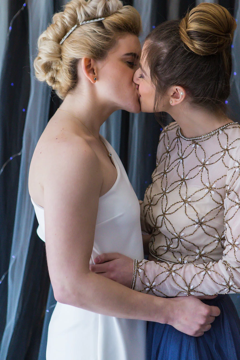 Ananda and Mari and the perfect punk rock brides in this styled wedding shoot. Not only are we ALL ABOUT the recent trend of wearing motorcycle jackets over dresses for weddings, but Mari's purple dress so perfectly shows off her tattoos that it's hard to picture her wearing anything else. Um, also, we LOVE her pink index finger nail polish. It's all about the details, y'all.
