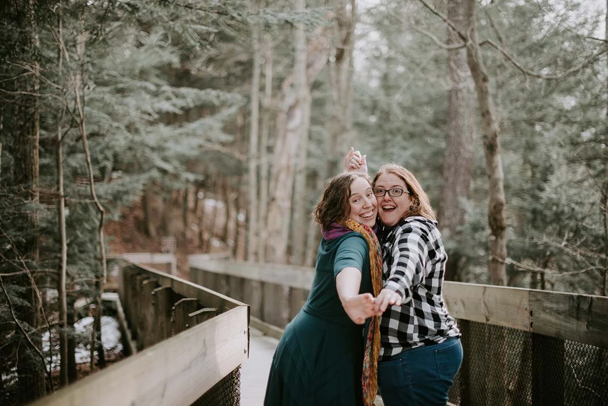 Ang: We went ice skating outdoors in February 2017 at our favourite rink. I feigned sore feet and asked to sit down for a while off to the side of the skating trail through the woods. Emily was getting super impatient so I said I had something important to talk about, then pulled out the ring box and said "Will you marry me?" Emily laughed and tilted her head at me. Confused, I asked "What?" and she said "I thought we'd planned on doing that anyway." I said I wanted to formalise it. She replied, "yes, duh" and immediately put the ring on the wrong hand.