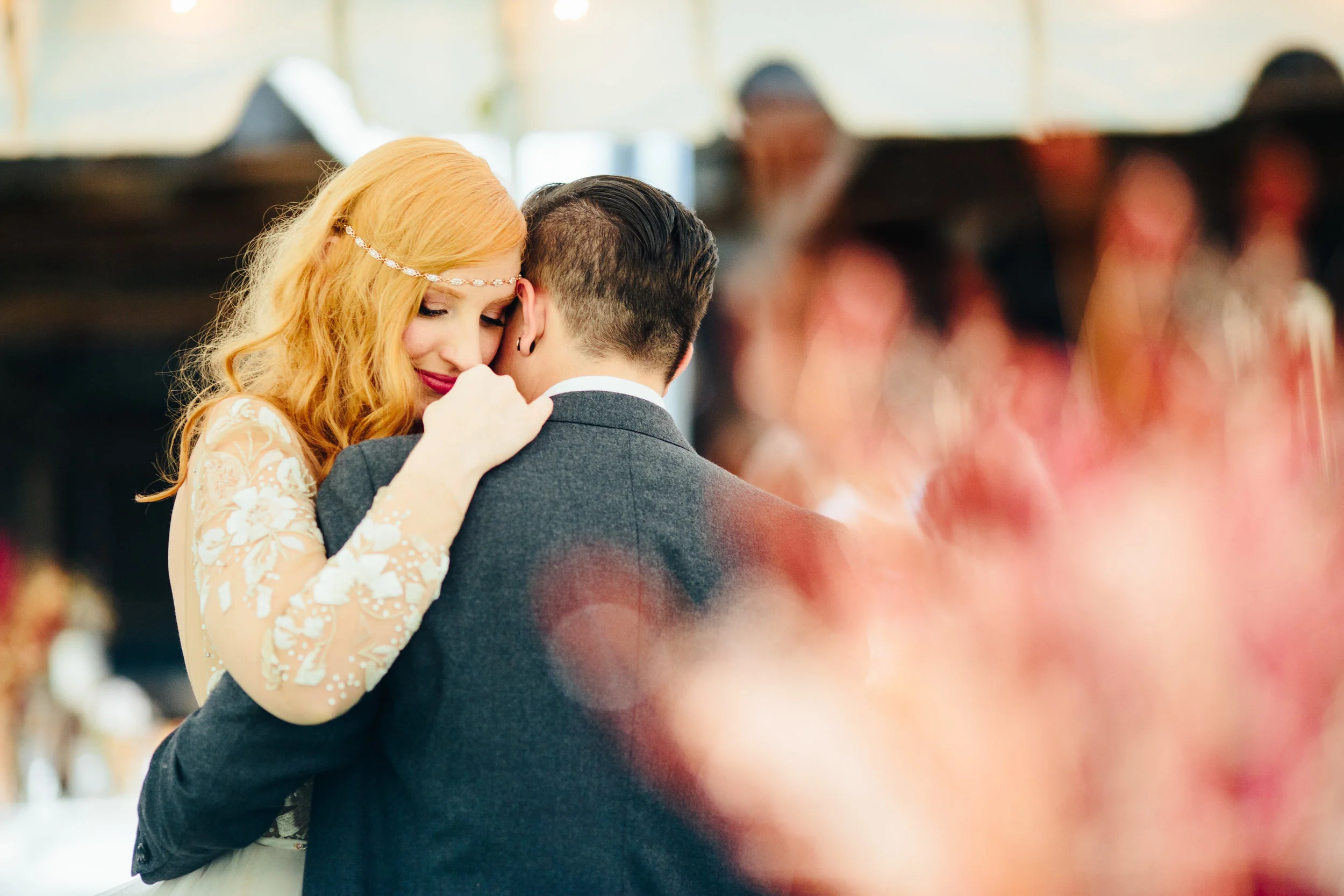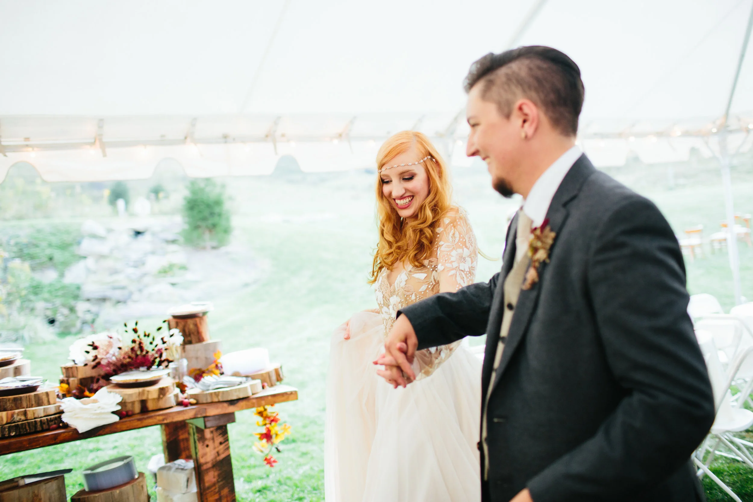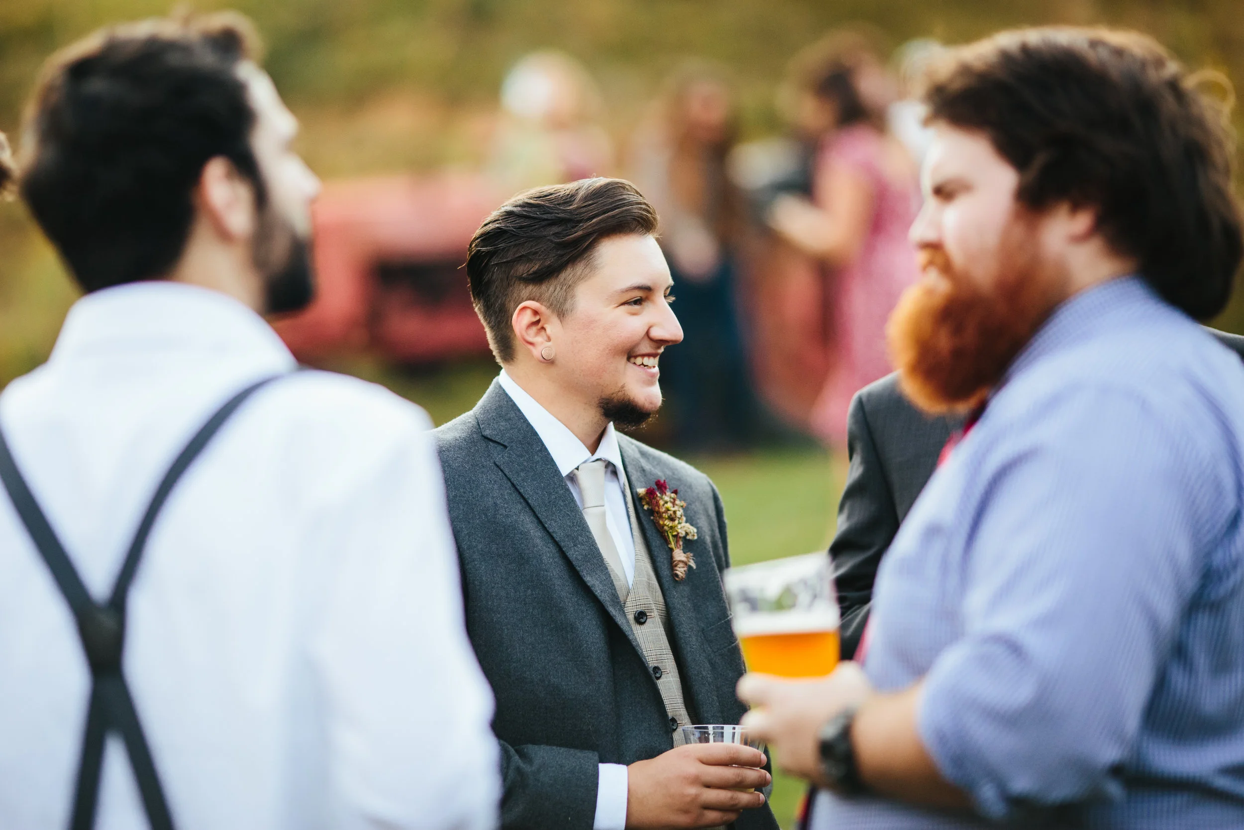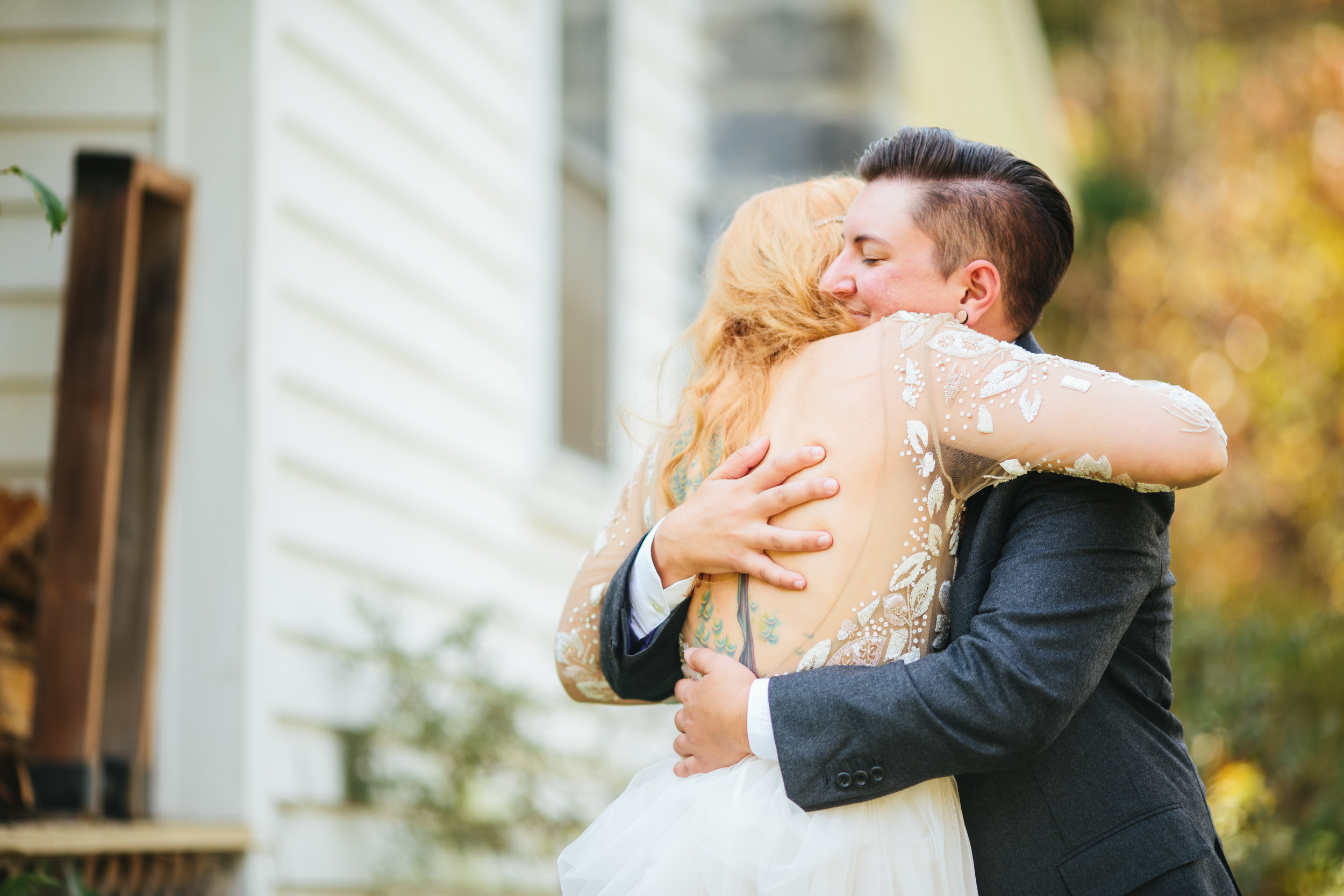 Our queer/trans identities are a significant part of who we are as individuals and as a couple, so we knew we wanted our wedding to reflect that as much as possible. Throughout our whole wedding process we tried to be as thoughtful and intentional about every decision, no matter how small, so that everyone involved could be as authentic as possible. We took the time to write our ceremony with original content from procession to recession and cut out a lot of the traditional 'who gives this bride away' and 'to love, cherish, and obey' weirdness that dates back to wives being gifts and possessions to be owned. We opted for a ceremony that highlighted equality starting with having my parents walk me down the aisle before Hannah. My father spent most of my life hoping to walk his daughter down the aisle, and as a family we didn’t see why my transition into his son should have to rob either of us from that experience. Our niece donned a dapper little suit as our ring bearer, and our family friends were our leaf boys throwing fallen leaves collected around the farm instead of flowers. Even our boutonnieres and bouquets were sourced from the property and put together the morning of the wedding! In the interest of preventing any self-image discomfort, we talked individually to each of our brides and groomspeople and our officiant about what clothing they would be most comfortable in, and they all looked spectacular! We chose Alex Bee as our photographer because of her undeniable talent, of course, but also because she is openly supportive of LGBTQ relationships/weddings, and we are big believers of putting our money into people and businesses that share those ideals. Hannah and I were both very impressed to see a preferred pronouns section on her opening questionnaire, and it allowed us both to breathe easier knowing that the person taking pictures of us, especially while getting dressed and ready, was somebody we could feel safe around. We hired a friend from Durham, DJ PlayPlay, to handle the tunes, and I gotta tell ya, once the dancing started it went all night long!