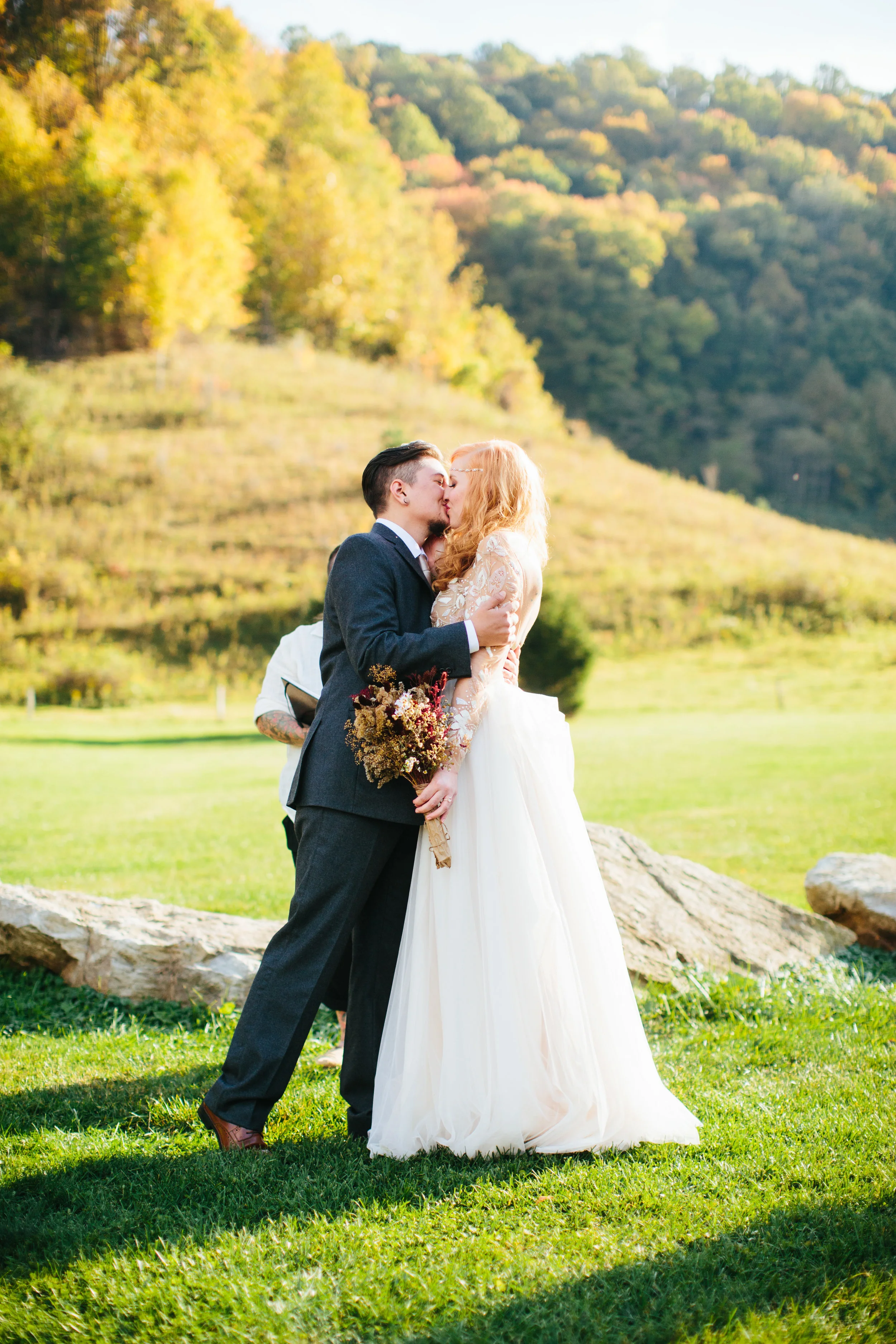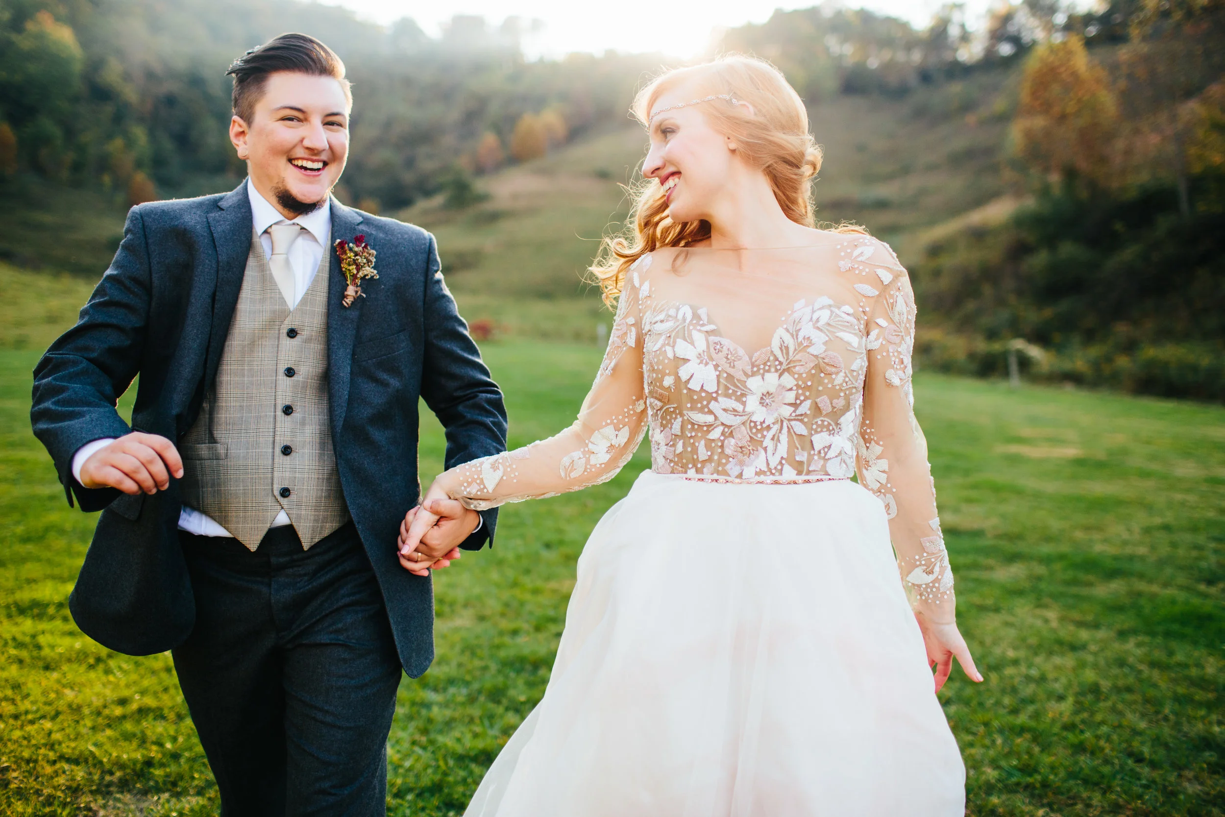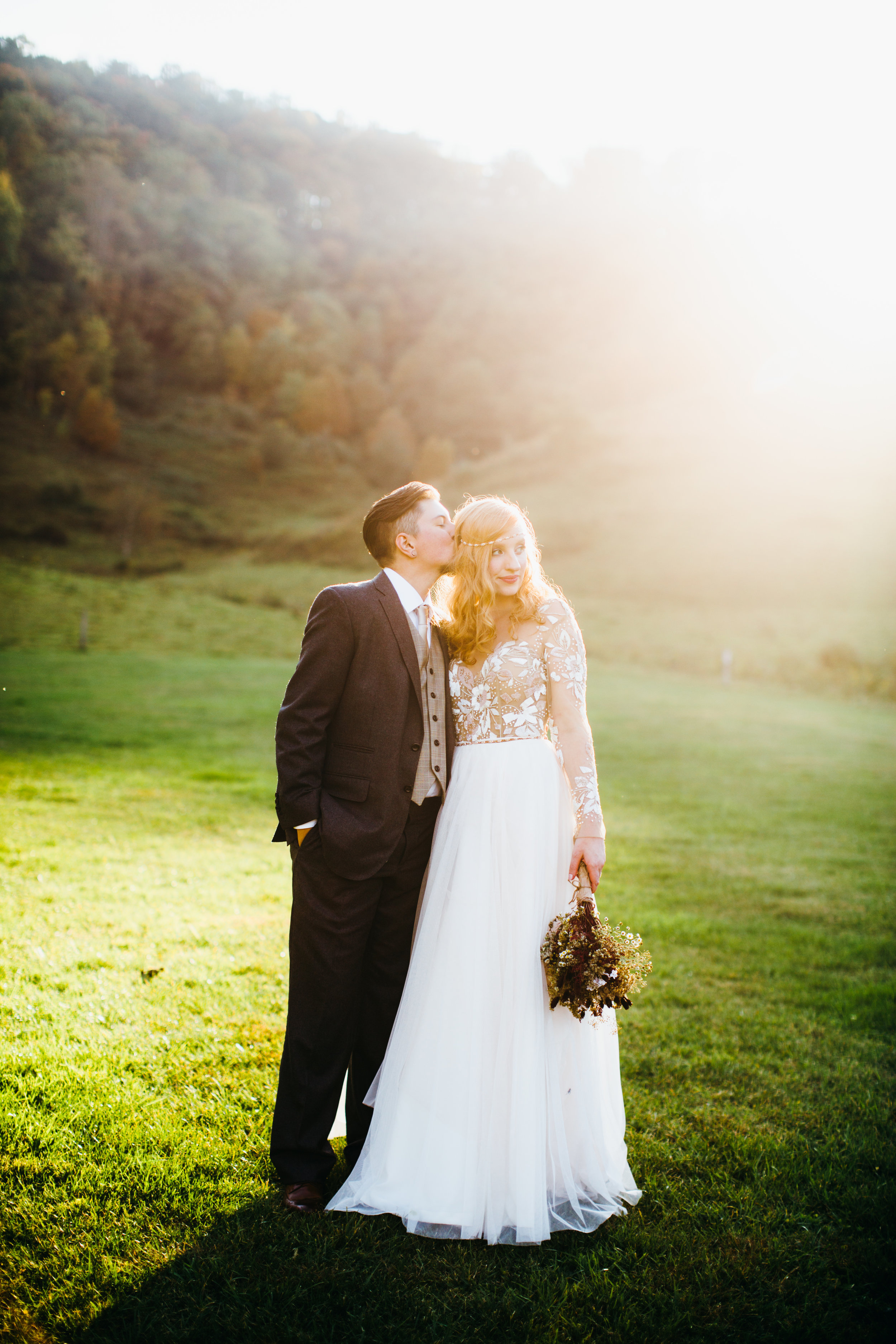 /"Appalachia is our homeland. It’s where we first met, it’s where I began my transgender journey, it’s where we found a queer community that taught us how to radically love and be loved, it’s the smell of the mountain air, the clean crystal creeks, and the raw beauty of the fall foliage, so it was very easy for us to choose that location for our wedding. Asheville, being a world renowned wedding destination, was a little outside of our budget, but after a lot of internet sleuthing we came across a perfect venue just a hop over the border in Trade, Tennessee. White Fence Farm was the whole package: beautiful outdoor space for the ceremony, covered barn and kitchen for catering and reception, covered stage for DJ and dancing, a large fire pit, and even a farmhouse and a couple airstreams on the property that slept nearly all of our wedding party, and the price was unbeatable. But the real showstopper was the view. Located in a small valley right in the middle of the Appalachian mountains, the rolling hills loomed on all sides, and we planned it just right so that our wedding weekend coincided with peak leaf colors throughout the region. We were planning a Tennessee wedding from our couch in Austin, Texas, so putting the deposit down on the farm without having seen it was a huge risk. Turns out, we couldn’t have dreamed a more perfect setting.