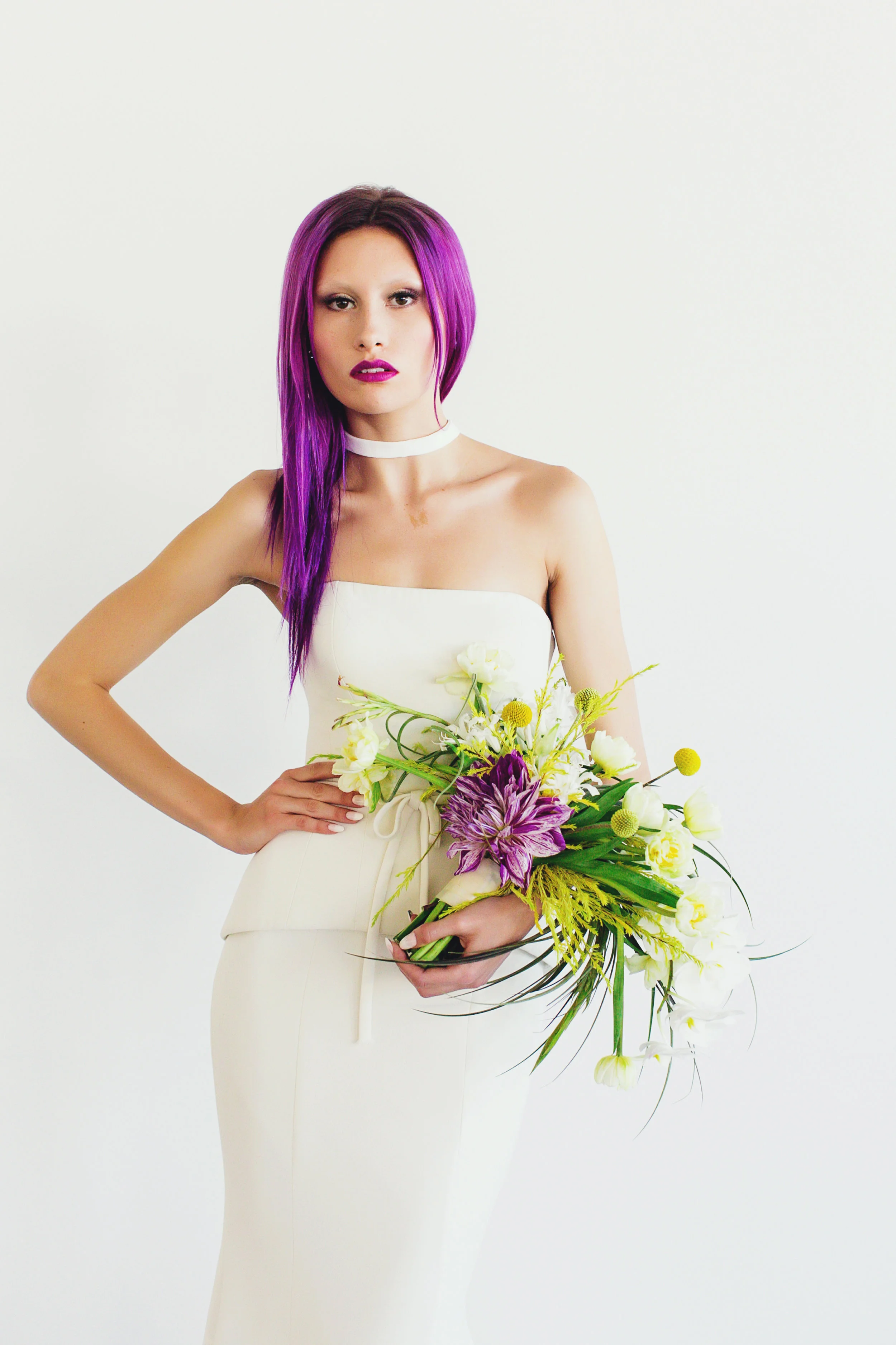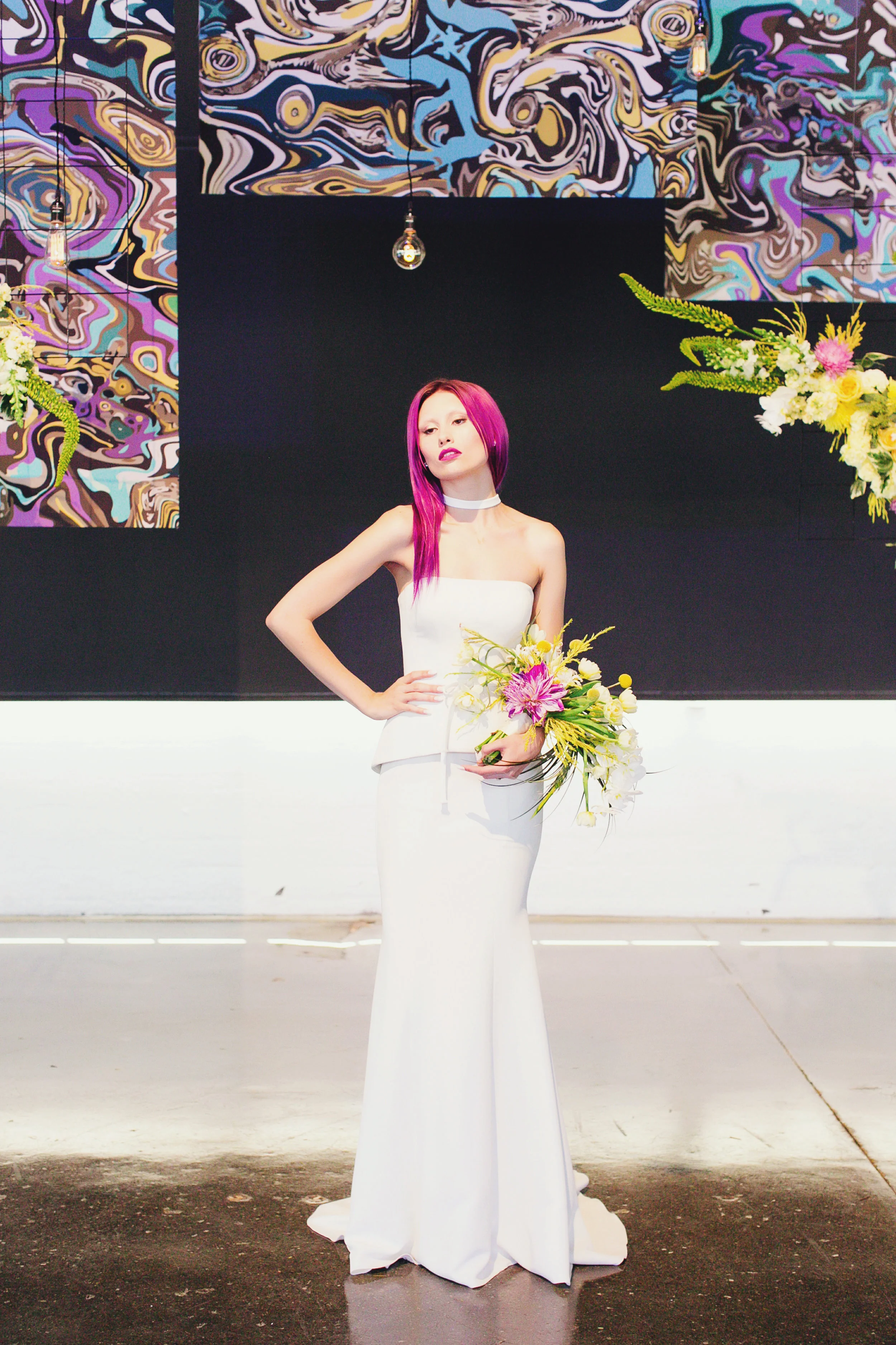 /This inspiration shoot emerged from a pattern design created by Teresa Reynolds who is also the talented hair and makeup artist for this collaboration. Her design exudes an energetic flow and ease with the organic movement which we loved seeing with clean straight lines and minimal elements. Its playful color palette was fun to interpret across all vignettes, keeping a balance of liveliness and sophistication.