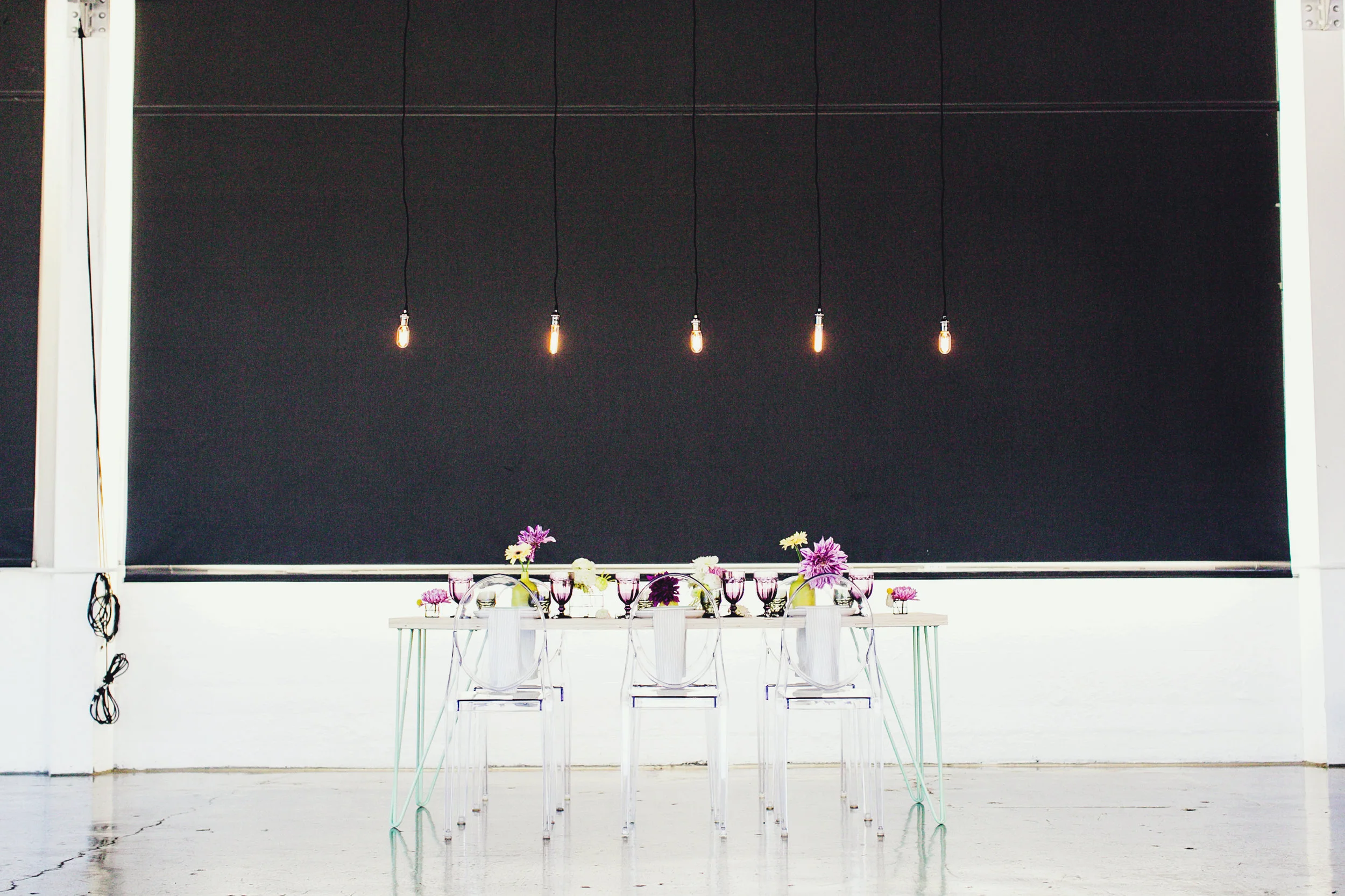 The tablescape design was kept simple, clean, and fun with Trunks & Tales' beautiful table and tabletop pieces. We especially love the mint dinner plates and colored glassware glowing beneath a row of 3 Stage Lighting's Edison bulbs. The unconventional floral pieces from Rare Sparrow gave the table lightness and unexpectedness.