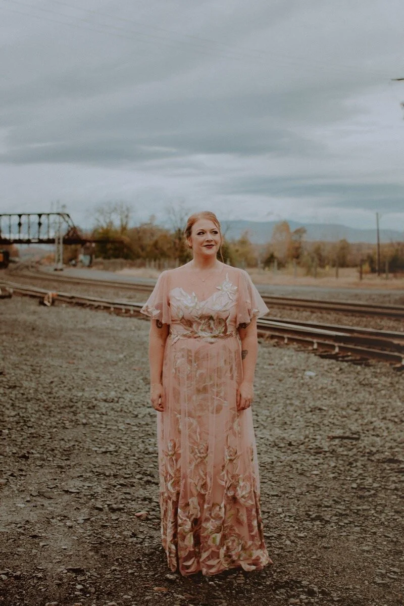 From the beginning Sarah and I both knew we didn't want to wear white. My best friend and “bridesman”, Stephen, lead me to a lovely blush floral gown by Marchesa Notte. Sarah's mom and sister helped her find a classic black Halston dress with a grey to white gradiant detail. We both wore diamond jewelry from our grandmothers. My necklace and earrings were reset by one of Sarah's bridesmaids, jewelry designer Maggie Semrau. She also custom designed and made our wedding rings.