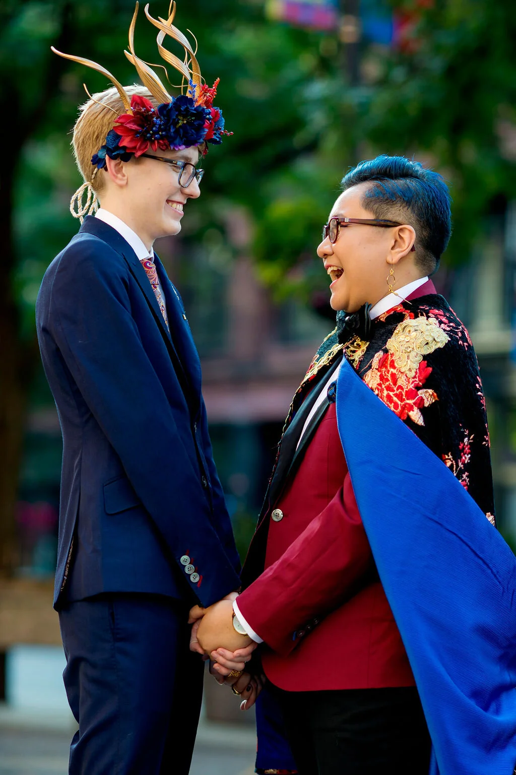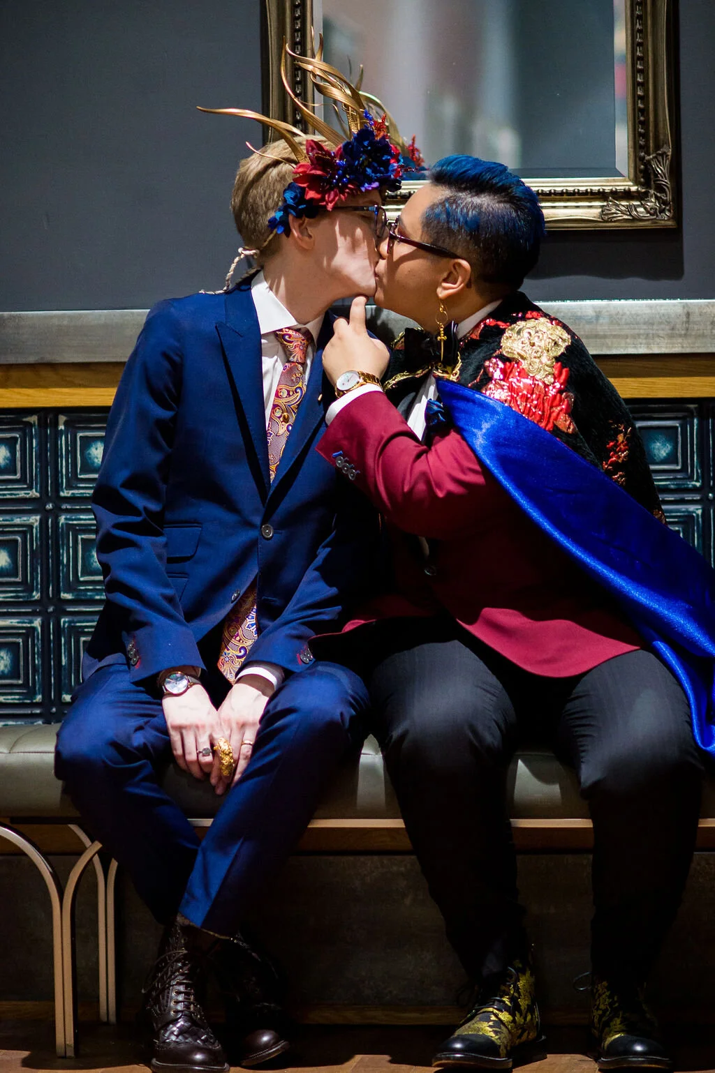 The two most important accessories of our outfits were K’s spindly, jeweled floral crown and my regal embroidered floral cape with satin blue lining. We commissioned artists for both pieces and had them custom made from scratch to perfectly make our visions a reality. We came up with fantasy personas for ourselves as inspiration for designing our individual looks — K as an ethereal fae prince and me as a roguish prince of bandits. Our artists were beyond amazing to work with, and we felt truly majestic and happy with how we dressed on our big day. We felt like our true selves.