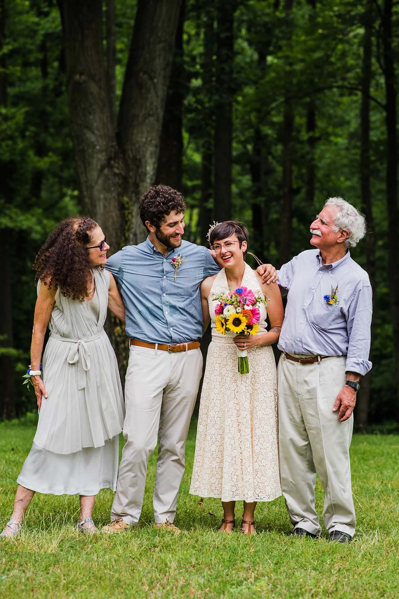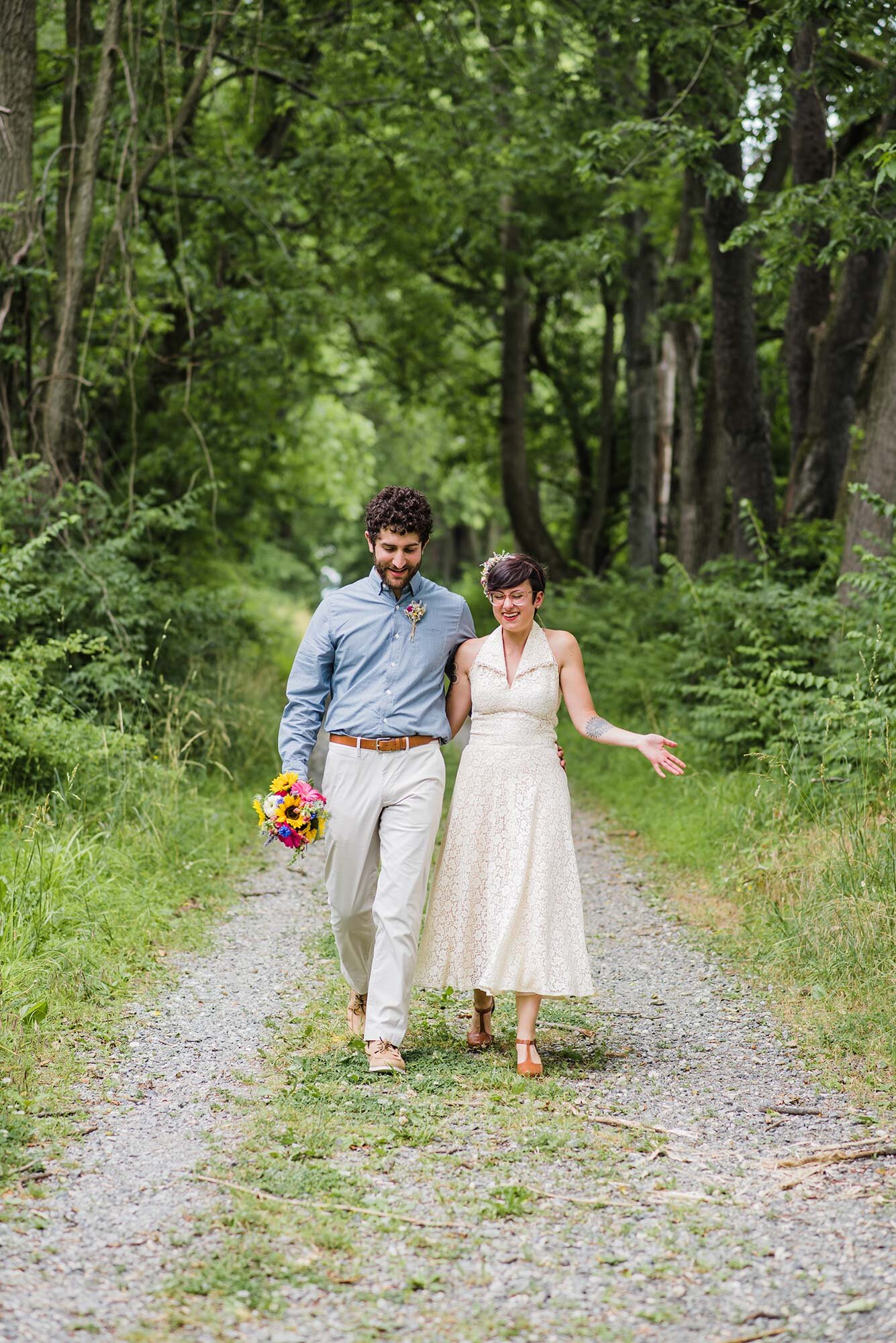 I wore a 1950’s vintage wedding dress from Etsy with vintage-inspired shoes from Modcloth, in addition to a dried flower crown. My goal was to be whimsical, simple, and elegant. Besides appreciating the aesthetic of vintage clothes, I chose a dress from the 1950’s because we are fortunate enough to have our grandparent’s wedding rings from that era. Jake used his maternal grandfather’s gold band, and my ring is a fusion using the white gold and diamonds from both my paternal grandmother’s ring and Jake’s paternal grandmother’s ring. Jake’s dad also proposed to Jake’s mom with that ring!