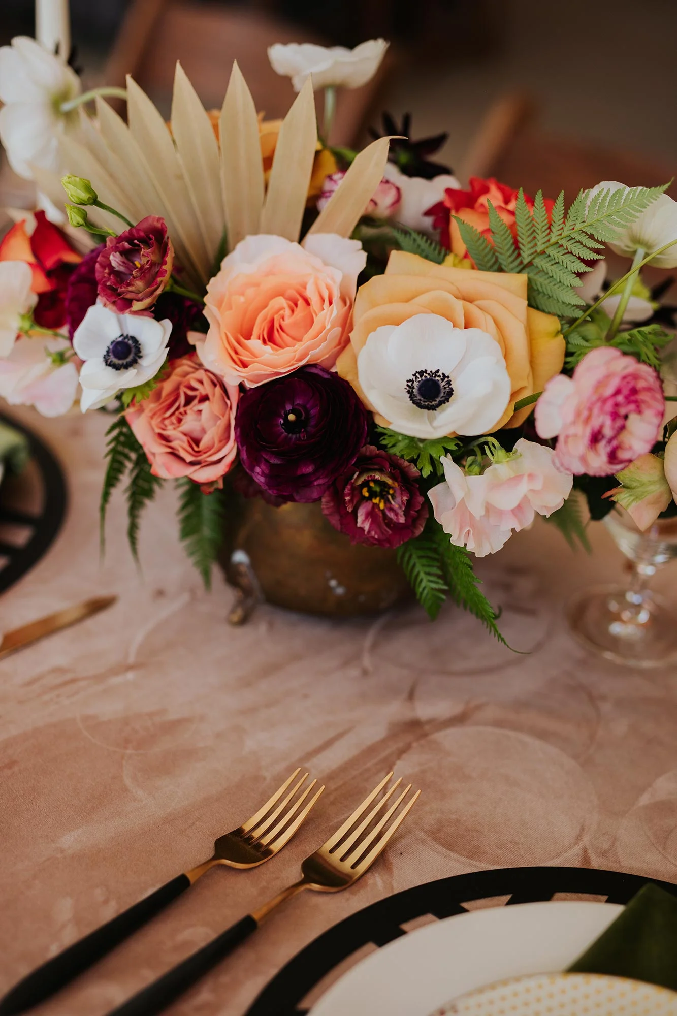We used lush velvet linens, textured glasses and chargers, and lush, organic, funky florals by the floral queen herself, Amanda Burnette. We love that she paired some interesting vases together, like clean ceramics and brassy metallics. We strive to spend our clients’ money wisely by encouraging them to invest in creative pieces, and we find ways to repurpose things throughout the event.